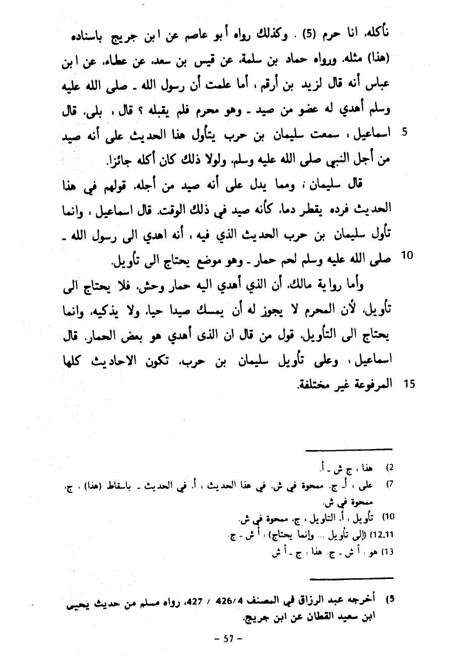 نَأْكُلُهُ إِنَّا حُرُمٌ وَكَذَلِكَ رَوَاهُ أَبُو عَاصِمٍ عَنِ ابْنِ جُرَيْجٍ بِإِسْنَادِهِ هَذَا مِثْلَهُ وَرَوَاهُ حَمَّادُ بْنُ سَلَمَةَ عَنْ قَيْسِ بْنِ سَعْدٍ عَنْ عَطَاءٍ عَنِ ابْنِ عَبَّاسٍ أَنَّهُ قَالَ لِزَيْدِ بْنِ أَرْقَمَ أَمَا عَلِمْتُ أَنَّ رَسُولَ اللَّهِ صَلَّى اللَّهُ عَلَيْهِ وَسَلَّمَ أُهْدِيَ لَهُ عُضْوٌ مِنْ صَيْدٍ وَهُوَ مُحْرِمٌ فَلَمْ يَقْبَلْهُ قَالَ بَلَى قَالَ إِسْمَاعِيلُ سَمِعْتُ سُلَيْمَانَ بْنَ حَرْبٍ يَتَأَوَّلُ هَذَا الْحَدِيثَ عَلَى أَنَّهُ صِيدَ مِنْ أَجْلِ النَّبِيِّ صَلَّى اللَّهُ عَلَيْهِ وَسَلَّمَ وَلَوْلَا ذَلِكَ كَانَ أَكْلُهُ جَائِزًا قَالَ سُلَيْمَانُ وَمِمَّا يَدُلُّ عَلَى أَنَّهُ صِيدَ مِنْ أَجْلِهِ قَوْلُهُمْ فِي هَذَا الْحَدِيثِ فَرَدَّهُ يَقْطُرُ دَمًا كَأَنَّهُ صِيدَ فِي ذَلِكَ الْوَقْتِ قَالَ إِسْمَاعِيلُ وَإِنَّمَا تَأَوَّلَ سُلَيْمَانُ بْنُ حَرْبٍ الْحَدِيثَ الَّذِي فِيهِ أَنَّهُ أُهْدِيَ إِلَى رَسُولِ اللَّهِ صَلَّى اللَّهُ عَلَيْهِ وَسَلَّمَ لَحْمُ حِمَارٍ وَهُوَ مَوْضِعٌ يَحْتَاجُ إِلَى تَأْوِيلٍ وَأَمَّا رِوَايَةُ مَالِكٍ أَنَّ الَّذِي أُهْدِيَ إِلَيْهِ حِمَارُ وَحْشٍ فَلَا يَحْتَاجُ إِلَى تَأْوِيلٍ لِأَنَّ الْمُحْرِمَ لَا يَجُوزُ لَهُ أَنْ يُمْسِكَ صَيْدًا حَيًّا وَلَا يُذَكِّيَهُ وَإِنَّمَا يحتاج إلى التأويل قول إِنَّ الَّذِي أُهْدِيَ هُوَ بَعْضُ الْحِمَارِ قَالَ إِسْمَاعِيلُ وَعَلَى تَأْوِيلِ سُلَيْمَانَ بْنِ حَرْبٍ تَكُونُ الْأَحَادِيثُ كُلُّهَا الْمَرْفُوعَةُ غَيْرَ مُخْتَلِفَةٍ