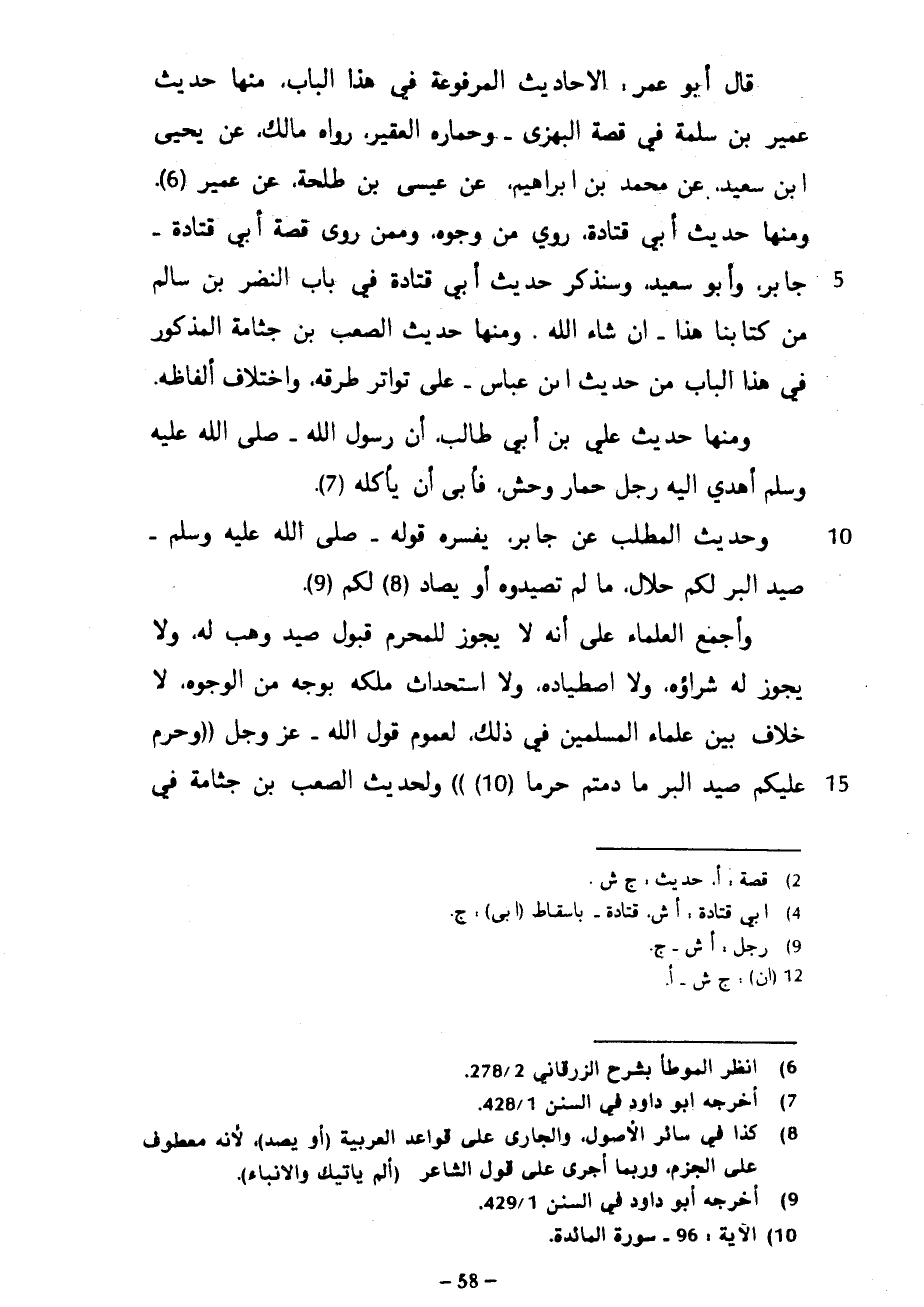 قَالَ أَبُو عُمَرَ الْأَحَادِيثُ الْمَرْفُوعَةُ فِي هَذَا الْبَابِ مِنْهَا حَدِيثُ عُمَيْرِ بْنِ سَلَمَةَ فِي قِصَّةِ الْبَهْزِيِّ وَحِمَارِهِ الْعَقِيرِ رَوَاهُ مَالِكٌ عَنْ يحيى ابن سَعِيدٍ عَنْ مُحَمَّدِ بْنِ إِبْرَاهِيمَ عَنْ عِيسَى بْنِ طَلْحَةَ عَنْ عُمَيْرٍ وَمِنْهَا حَدِيثُ أَبِي قَتَادَةَ رُوِيَ مِنْ وُجُوهٍ وَمِمَّنْ رَوَى قِصَّةَ أَبِي قَتَادَةَ جَابِرٌ وَأَبُو سَعِيدٍ وَسَنَذْكُرُ حَدِيثَ أَبِي قَتَادَةَ فِي بَابِ النَّضْرِ بْنِ سَالِمٍ مِنْ كِتَابِنَا هَذَا إِنْ شَاءَ اللَّهُ وَمِنْهَا حَدِيثُ الصَّعْبِ بْنِ جَثَّامَةَ الْمَذْكُورُ فِي هَذَا الْبَابِ مِنْ حَدِيثِ ابْنِ عَبَّاسٍ عَلَى تَوَاتُرِ طُرُقِهِ وَاخْتِلَافِ أَلْفَاظِهِ وَمِنْهَا حَدِيثُ عَلِيِّ بْنِ بي طَالِبٍ أَنَّ رَسُولَ اللَّهِ صَلَّى اللَّهُ عَلَيْهِ وَسَلَّمَ أُهْدِيَ إِلَيْهِ رَجُلٌ حِمَارَ وَحْشٍ فَأَبَى أَنْ يَأْكُلَهُ وَحَدِيثُ الْمُطَّلِبِ عَنْ جَابِرٍ يُفَسِّرُهُ قَوْلُهُ صَلَّى اللَّهُ عَلَيْهِ وَسَلَّمَ صَيْدُ الْبَرِّ لكم حلال مالم تَصِيدُوهُ أَوْ يُصَادُ لَكُمْ وَأَجْمَعَ الْعُلَمَاءُ عَلَى أَنَّهُ لَا يَجُوزُ لِلْمُحْرِمِ قَبُولُ صَيْدٍ وُهِبَ لَهُ وَلَا يَجُوزُ لَهُ شِرَاؤُهُ وَلَا اصْطِيَادُهُ وَلَا اسْتِحْدَاثُ مِلْكِهِ بِوَجْهٍ مِنَ الْوُجُوهِ لَا خِلَافَ بَيْنَ عُلَمَاءِ الْمُسْلِمِينَ فِي ذَلِكَ لِعُمُومِ قَوْلِ اللَّهِ عَزَّ وَجَلَّ وَحُرِّمَ عَلَيْكُمْ صَيْدُ البر مادمتم حُرُمًا وَلِحَدِيثِ الصَّعْبِ بْنِ جَثَّامَةَ فِي