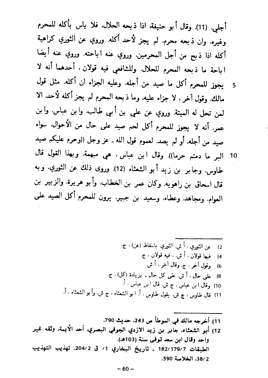 أَجْلِي وَقَالَ أَبُو حَنِيفَةَ إِذَا ذَبَحَهُ الْحَلَالُ فَلَا بَأْسَ بِأَكْلِهِ لِلْمُحْرِمِ وَغَيْرِهِ وَإِنْ ذَبَحَهُ مُحْرِمٌ لَمْ يَجُزْ لِأَحَدٍ أَكْلُهُ وَرُوِيَ عَنِ الثَّوْرِيِّ كَرَاهِيَةُ أَكْلِهِ إِذَا ذُبِحَ مِنْ أَجْلِ المحرمين وروي عن إِبَاحَتُهُ وَرُوِيَ عَنْهُ أَيْضًا إِبَاحَةُ مَا ذَبَحَهُ الْمُحْرِمُ لِلْحَلَالِ وَلِلشَّافِعِيِّ فِيهِ قَوْلَانِ أَحَدُهُمَا أَنَّهُ لَا يَجُوزُ لِلْمُحْرِمِ أَكْلُ مَا صِيدَ مِنْ أَجْلِهِ وَعَلَيْهِ الْجَزَاءُ إِنْ أَكَلَهُ مِثْلَ قَوْلِ مَالِكٍ وَقَوْلٌ آخَرُ لَا جَزَاءَ عَلَيْهِ وَمَا ذَبَحَهُ الْمُحْرِمُ لَمْ يَجُزْ أَكْلُهُ لِأَحَدٍ إِلَّا لِمَنْ تَحِلُّ لَهُ الْمَيْتَةُ وَرُوِيَ عَنْ عَلِيِّ بْنُ أَبِي طَالِبٍ وَابْنُ عَبَّاسٍ وَابْنُ عُمَرَ أَنَّهُ لَا يَجُوزُ لِلْمُحْرِمِ أَكْلُ لَحْمٍ صِيدَ عَلَى حَالٍ مِنَ الْأَحْوَالِ سَوَاءٌ صِيدَ مِنْ أَجْلِهِ أَوْ لَمْ يُصَدْ لِعُمُومِ قَوْلِ اللَّهِ عَزَّ وَجَلَّ وَحُرِّمَ عَلَيْكُمْ صَيْدُ الْبَرِّ مَا دُمْتُمْ حُرُمًا وَقَالَ ابْنُ عَبَّاسٍ هِيَ مُبْهَمَةٌ وَبِهَذَا الْقَوْلِ قَالَ طَاوُسٌ وَجَابِرُ بْنُ زَيْدٍ أَبُو الشَّعْثَاءِ وَرَوَى ذَلِكَ عَنِ الثَّوْرِيِّ وَبِهِ قَالَ إِسْحَاقُ بْنُ رَاهَوَيْهِ وَكَانَ عُمَرُ بْنُ الْخَطَّابِ وَأَبُو هُرَيْرَةَ وَالزُّبَيْرُ بْنُ الْعَوَّامِ وَمُجَاهِدٌ وَعَطَاءٌ وَسَعِيدُ بْنُ جُبَيْرٍ يَرَوْنَ لِلْمُحْرِمِ أَكْلَ الصيد على