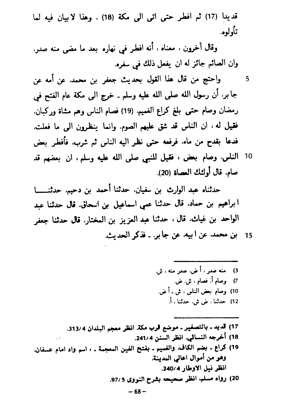 قُدَيْدًا ثُمَّ أَفْطَرَ حَتَّى أَتَى إِلَى مَكَّةَ وَهَذَا لَا بَيَانَ فِيهِ لِمَا تَأَوَّلُوهُ وَقَالَ آخَرُونَ مَعْنَاهُ أَنَّهُ أَفْطَرَ فِي نَهَارِهِ بَعْدَ مَا مَضَى مِنْهُ صَدْرٌ وَأَنَّ الصَّائِمَ جَائِزٌ لَهُ أَنْ يَفْعَلَ ذَلِكَ فِي سَفَرِهِ وَاحْتَجَّ مَنْ قَالَ هَذَا الْقَوْلَ بِحَدِيثِ جَعْفَرِ بْنِ مُحَمَّدٍ عَنْ أُمِّهِ عَنْ جَابِرٍ أَنَّ رَسُولَ اللَّهِ صَلَّى اللَّهُ عَلَيْهِ وَسَلَّمَ خَرَجَ إِلَى مَكَّةَ عَامَ الْفَتْحِ فِي رَمَضَانَ وَصَامَ حَتَّى بَلَغَ كُرَاعَ الْغَمِيمِ فَصَامَ النَّاسُ وَهُمْ مُشَاةٌ وَرُكْبَانٌ فَقِيلَ لَهُ إِنَّ النَّاسَ قَدْ شَقَّ عَلَيْهِمُ الصَّوْمُ وَإِنَّمَا يَنْظُرُونَ إِلَى مَا فَعَلْتَ فَدَعَا بِقَدَحٍ مِنْ مَاءٍ فَرَفَعَهُ حَتَّى نَظَرَ إِلَيْهِ النَّاسُ ثُمَّ شَرِبَ فَأَفْطَرَ بَعْضُ النَّاسِ وَصَامَ بَعْضٌ فَقِيلَ لِلنَّبِيِّ صَلَّى اللَّهُ عَلَيْهِ وَسَلَّمَ إِنَّ بَعْضَهُمْ قَدْ صَامَ قَالَ أُولَئِكَ الْعُصَاةُ حَدَّثَنَا عَبْدُ الْوَارِثِ بْنُ سُفْيَانَ حَدَّثَنَا أَحْمَدُ بْنُ دُحَيْمٍ حَدَّثَنَا إِبْرَاهِيمُ بْنُ حَمَّادٍ قَالَ حَدَّثَنَا عَمِّي إِسْمَاعِيلُ بْنُ إِسْحَاقَ قَالَ حَدَّثَنَا عَبْدُ الْوَاحِدِ بْنُ غِيَاثٍ قَالَ حَدَّثَنَا عَبْدُ الْعَزِيزِ بْنُ الْمُخْتَارِ قَالَ حَدَّثَنَا جَعْفَرُ بْنُ مُحَمَّدٍ عَنْ أَبِيهِ عَنْ جَابِرٍ فَذَكَرَ الحديث
