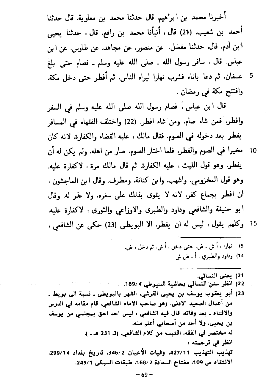 أَخْبَرَنَا مُحَمَّدُ بْنُ إِبْرَاهِيمَ قَالَ حَدَّثَنَا مُحَمَّدُ بْنُ مُعَاوِيَةَ قَالَ حَدَّثَنَا أَحْمَدُ بْنُ شُعَيْبٍ قَالَ أَنْبَأَنَا مُحَمَّدُ بْنُ رَافِعٍ قَالَ حَدَّثَنَا يحيى ابن آدَمَ قَالَ حَدَّثَنَا مُفَضَّلٌ عَنْ مَنْصُورٍ عَنْ مُجَاهِدٍ عَنْ طَاوُسٍ عَنِ ابْنِ عَبَّاسٍ قَالَ سَافَرَ رَسُولُ اللَّهِ صَلَّى اللَّهُ عَلَيْهِ وَسَلَّمَ فَصَامَ حَتَّى بَلَغَ عُسْفَانَ ثُمَّ دَعَا بِإِنَاءٍ فَشَرِبَ نَهَارًا لِيَرَاهُ النَّاسُ ثُمَّ أَفْطَرَ حَتَّى دَخَلَ مَكَّةَ وَافْتَتَحَ مَكَّةَ فِي رَمَضَانَ قَالَ ابْنُ عَبَّاسٍ فَصَامَ رَسُولُ اللَّهِ صَلَّى اللَّهُ عَلَيْهِ وَسَلَّمَ فِي السَّفَرِ وَأَفْطَرَ فَمَنْ شَاءَ صَامَ وَمَنْ شَاءَ أَفْطَرَ وَاخْتَلَفَ الْفُقَهَاءُ فِي الْمُسَافِرِ يُفْطِرُ بَعْدَ دُخُولِهِ فِي الصَّوْمِ فَقَالَ مَالِكٌ عَلَيْهِ الْقَضَاءُ وَالْكَفَّارَةُ لِأَنَّهُ كَانَ مُخَيَّرًا فِي الصَّوْمِ وَالْفِطْرِ فَلَمَّا اخْتَارَ الصَّوْمَ صَارَ مِنْ أَهْلِهِ وَلَمْ يَكُنْ لَهُ أَنْ يُفْطِرَ وَهُوَ قَوْلُ اللَّيْثِ عَلَيْهِ الْكَفَّارَةُ ثُمَّ قَالَ مَالِكٌ مَرَّةً لَا كَفَّارَةَ عَلَيْهِ وَهُوَ قَوْلُ الْمَخْزُومِيِّ وَأَشْهَبَ وَابْنِ كِنَانَةَ وَمُطَرِّفٍ وَقَالَ ابْنُ الْمَاجِشُونِ إِنْ أَفْطَرَ بِجِمَاعٍ كَفَّرَ لِأَنَّهُ لَا يَقْوَى بِذَلِكَ عَلَى سَفَرِهِ وَلَا عُذْرَ لَهُ وَقَالَ أَبُو حَنِيفَةَ وَالشَّافِعِيُّ وَدَاوُدُ وَالطَّبَرِيُّ وَالْأَوْزَاعِيُّ وَالثَّوْرِيُّ لَا كَفَّارَةَ عَلَيْهِ وَكُلُّهُمْ يَقُولُ لَيْسَ لَهُ أَنْ يُفْطِرَ إِلَّا الْبُوَيْطِيَّ حَكَى عَنِ الشافعي