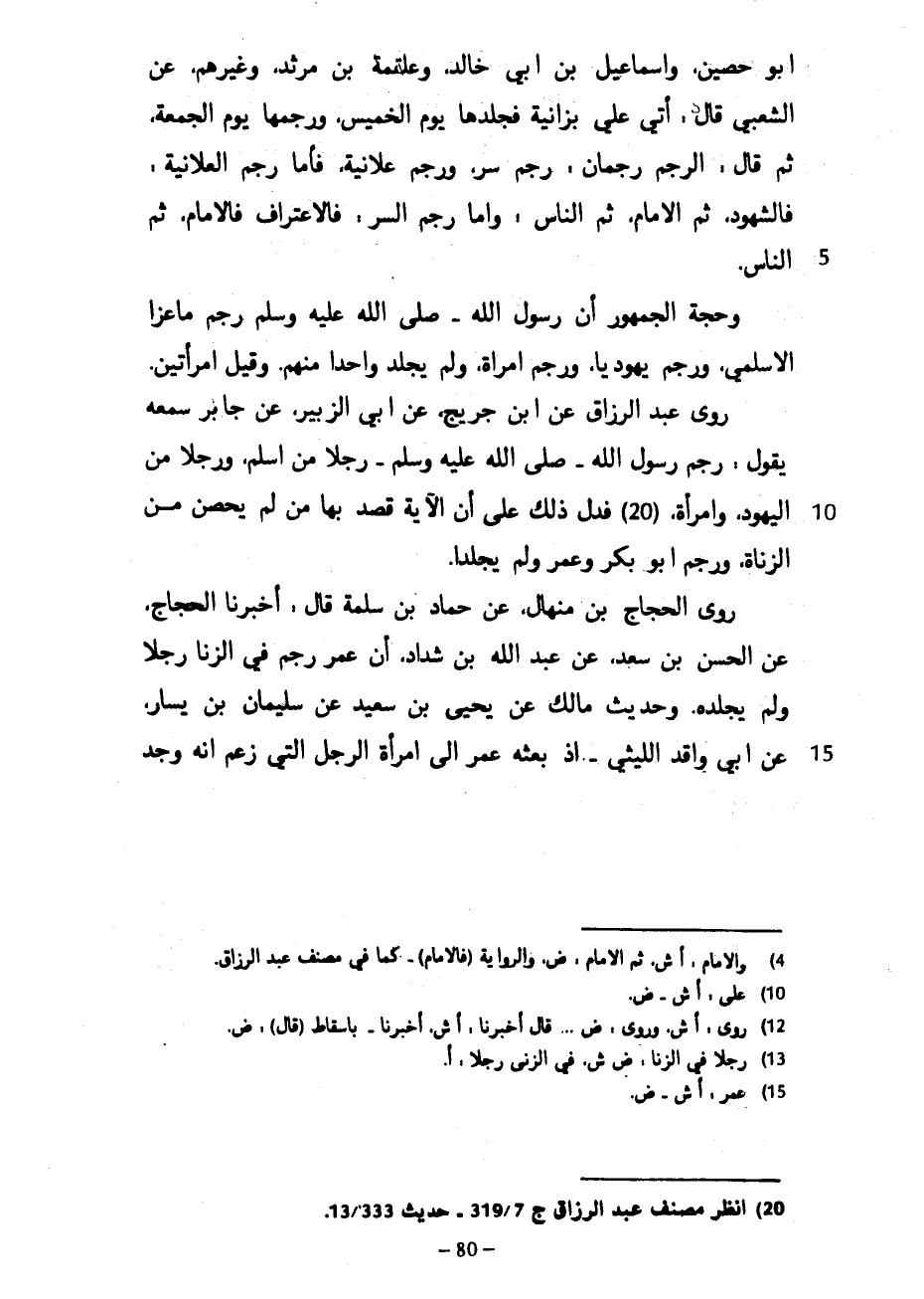 أَبُو حَصِينٍ وَإِسْمَاعِيلُ بْنُ أَبِي خَالِدٍ وَعَلْقَمَةُ بْنُ مَرْثَدٍ وَغَيْرُهُمْ عَنِ الشَّعْبِيِّ قَالَ أُتِيَ عَلِيٌّ بِزَانِيَةٍ فَجَلَدَهَا يَوْمَ الْخَمِيسِ وَرَجَمَهَا يَوْمَ الْجُمُعَةِ ثُمَّ قَالَ الرَّجْمُ رَجْمَانِ رَجْمُ سِرٍّ وَرَجْمُ عَلَانِيَةٍ فَأَمَّا رَجْمُ الْعَلَانِيَةِ فَالشُّهُودُ ثُمَّ الْإِمَامُ ثُمَّ النَّاسُ وَأَمَّا رَجْمُ السِّرِّ فَالِاعْتِرَافُ فَالْإِمَامُ ثُمَّ النَّاسُ وَحُجَّةُ الْجُمْهُورِ أَنَّ رَسُولَ اللَّهِ صَلَّى اللَّهُ عَلَيْهِ وَسَلَّمَ رَجَمَ مَاعِزًا الْأَسْلَمِيَّ وَرَجَمَ يَهُودِيًّا وَرَجَمَ امْرَأَةً وَلَمْ يَجْلِدْ وَاحِدًا مِنْهُمْ وَقِيلَ امْرَأَتَيْنِ رَوَى عَبْدُ الرَّزَّاقِ عَنِ ابْنِ جُرَيْجٍ عَنْ أَبِي الزُّبَيْرِ عَنْ جَابِرٍ سَمِعَهُ يَقُولُ رَجَمَ رَسُولُ اللَّهِ صَلَّى اللَّهُ عَلَيْهِ وَسَلَّمَ رَجُلًا مِنْ أَسْلَمَ وَرَجُلًا مِنَ الْيَهُودِ وَامْرَأَةً فَدَلَّ ذَلِكَ عَلَى أَنَّ الْآيَةَ قُصِدَ بِهَا مَنْ لَمْ يُحْصَنْ مِنَ الزُّنَاةِ وَرَجَمَ أَبُو بَكْرٍ وَعُمَرُ وَلَمْ يَجْلِدَا رَوَى الْحَجَّاجُ بْنُ مِنْهَالٍ عَنْ حَمَّادِ بْنِ سَلَمَةَ قَالَ أَخْبَرَنَا الْحَجَّاجُ عَنِ الْحَسَنِ بْنِ سَعْدٍ عَنْ عَبْدِ اللَّهِ بْنِ شَدَّادٍ أَنَّ عُمَرَ رَجَمَ فِي الزِّنَا رَجُلًا وَلَمْ يَجْلِدْهُ وَحَدِيثُ مَالِكٍ عَنْ يَحْيَى بْنِ سَعِيدٍ عَنْ سُلَيْمَانَ بْنِ يَسَارٍ عَنْ أَبِي وَاقِدٍ اللَّيْثِيِّ إِذْ بَعَثَهُ عُمَرُ إِلَى امْرَأَةِ الرَّجُلِ الَّتِي زَعَمَ أَنَّهُ وَجَدَ