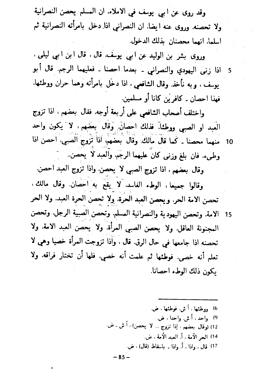وَقَدْ رُوِيَ عَنْ أَبِي يُوسُفَ فِي الْإِمْلَاءِ أَنَّ الْمُسْلِمَ يُحْصِنُ النَّصْرَانِيَّةَ وَلَا تُحْصِنُهُ وَرُوِيَ عَنْهُ أَيْضًا أَنَّ النَّصْرَانِيَّ إِذَا دَخَلَ بِامْرَأَتِهِ النَّصْرَانِيَّةِ ثُمَّ أَسْلَمَا أَنَّهُمَا مُحْصَنَانِ بِذَلِكَ الدُّخُولِ وَرَوَى بِشْرُ بْنُ الْوَلِيدِ عَنْ أَبِي يُوسُفَ قَالَ قَالَ ابْنُ أَبِي لَيْلَى إِذَا زَنَى الْيَهُودِيُّ وَالنَّصْرَانِيُّ بَعْدَمَا أَحْصَنَا فَعَلَيْهِمَا الرَّجْمُ قَالَ أَبُو يُوسُفَ وَبِهِ نَأْخُذُ وَقَالَ الشَّافِعِيُّ إِذَا دَخَلَ بِامْرَأَتِهِ وَهُمَا حُرَّانِ وَوَطِئَهَا فَهَذَا إِحْصَانٌ كَافِرَيْنِ كَانَا أَوْ مُسْلِمَيْنِ وَاخْتَلَفَ أَصْحَابُ الشَّافِعِيِّ عَلَى أَرْبَعَةِ أَوْجُهٍ فَقَالَ بَعْضُهُمْ إِذَا تَزَوَّجَ الْعَبْدُ أَوِ الصَّبِيُّ وَوَطِئَا فَذَلِكَ إِحْصَانٌ وَقَالَ بَعْضُهُمْ لَا يَكُونُ وَاحِدٌ مِنْهُمَا مُحْصَنًا كَمَا قَالَ مَالِكٌ وَقَالَ بَعْضُهُمْ إِذَا تَزَوَّجَ الصَّبِيُّ احصن إذا وطىء فإن بلغ وزنى كان عليهما الرَّجْمُ وَالْعَبْدُ لَا يُحْصَنُ وَقَالَ بَعْضُهُمْ إِذَا تَزَوَّجَ الصَّبِيُّ لَا يُحْصَنُ وَإِذَا تَزَوَّجَ الْعَبْدُ أُحْصِنَ وَقَالُوا جَمِيعًا الْوَطْءُ الْفَاسِدُ لَا يَقَعُ بِهِ إِحْصَانٌ وَقَالَ مَالِكٌ تُحْصِنُ الْأَمَةُ الْحُرَّ وَيُحْصِنُ الْعَبْدُ الْحُرَّةَ وَلَا تُحْصِنُ الْحُرَّةُ الْعَبْدَ وَلَا الْحُرُّ الْأَمَةَ وَتُحْصِنُ الْيَهُودِيَّةُ وَالنَّصْرَانِيَّةُ الْمُسْلِمَ وَتُحْصِنُ الصَّبِيَّةُ الرَّجُلَ وَتُحْصِنُ الْمَجْنُونَةُ الْعَاقِلَ وَلَا يُحْصِنُ الصَّبِيُّ الْمَرْأَةَ وَلَا يُحْصِنُ الْعَبْدُ الْأَمَةَ وَلَا تُحْصِنُهُ إِذَا جَامَعَهَا فِي حَالِ الرِّقِّ قَالَ وَإِذَا تَزَوَّجَتِ الْمَرْأَةُ خَصِيًّا وَهِيَ لَا تَعْلَمُ أَنَّهُ خَصِيٌّ فَوَطِئَهَا ثُمَّ عَلِمَتْ أَنَّهُ خَصِيٌّ فَلَهَا أَنْ تَخْتَارَ فِرَاقَهُ وَلَا يَكُونُ ذَلِكَ الْوَطْءُ إِحْصَانًا