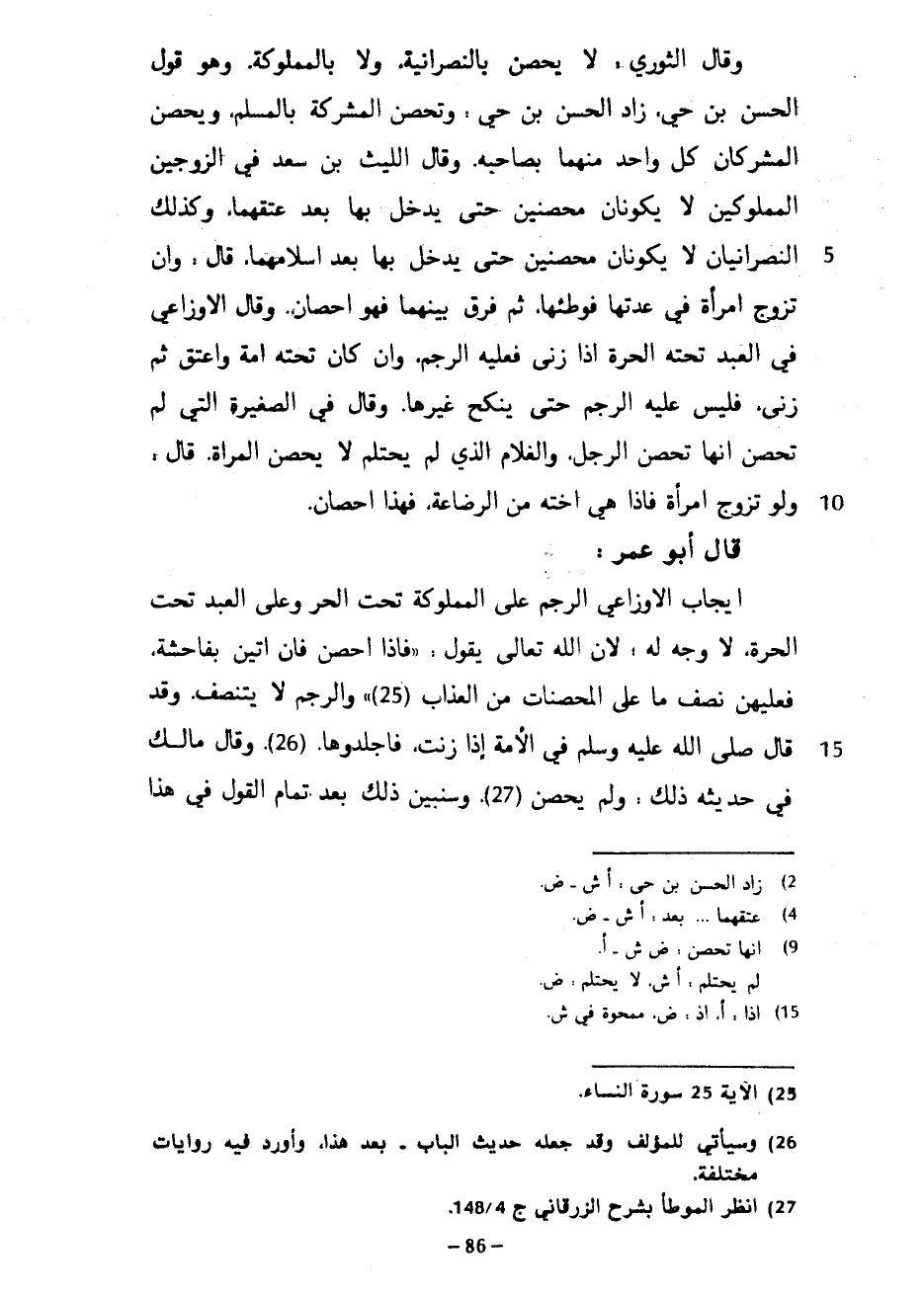 وَقَالَ الثَّوْرِيُّ لَا يُحْصَنُ بِالنَّصْرَانِيَّةِ وَلَا بِالْمَمْلُوكَةِ وَهُوَ قَوْلُ الْحَسَنِ بْنِ حَيٍّ زَادَ الْحَسَنُ بْنُ حَيٍّ وَتُحْصَنُ الْمُشْرِكَةُ بِالْمُسْلِمِ وَيُحْصَنُ الْمُشْرِكَانِ كل واحد منها بِصَاحِبِهِ وَقَالَ اللَّيْثُ بْنُ سَعْدٍ فِي الزَّوْجَيْنِ الْمَمْلُوكَيْنِ لَا يَكُونَانِ مُحْصَنَيْنِ حَتَّى يَدْخُلَ بِهَا بَعْدَ عِتْقِهِمَا وَكَذَلِكَ النَّصْرَانِيَّانِ لَا يَكُونَانِ مُحْصَنَيْنِ حَتَّى يَدْخُلَ بِهَا بَعْدَ إِسْلَامِهِمَا قَالَ وَإِنْ تَزَوَّجَ امْرَأَةً فِي عِدَّتِهَا فَوَطِئَهَا ثُمَّ فُرِّقَ بَيْنَهُمَا فَهُوَ إِحْصَانٌ وَقَالَ الْأَوْزَاعِيُّ فِي الْعَبْدِ تَحْتَهُ الْحُرَّةُ إِذَا زَنَى فَعَلَيْهِ الرَّجْمُ وَإِنْ كَانَ تَحْتَهُ أَمَةٌ وَأَعْتَقَ ثُمَّ زَنَى فَلَيْسَ عَلَيْهِ الرَّجْمُ حَتَّى يَنْكِحَ غَيْرَهَا وَقَالَ فِي الصَّغِيرَةِ الَّتِي لَمْ تُحْصَنْ إِنَّهَا تُحْصِنُ الرَّجُلَ وَالْغُلَامُ الَّذِي لَمْ يَحْتَلِمْ لَا يُحْصِنُ الْمَرْأَةَ قَالَ وَلَوْ تَزَوَّجَ امْرَأَةً فَإِذَا هِيَ أُخْتُهُ مِنَ الرَّضَاعَةِ فَهَذَا إِحْصَانٌ قَالَ أَبُو عُمَرَ إِيجَابُ الْأَوْزَاعِيِّ الرَّجْمَ عَلَى الْمَمْلُوكَةِ تَحْتَ الْحُرِّ وَعَلَى الْعَبْدِ تَحْتَ الْحُرَّةِ لَا وَجْهَ لَهُ لِأَنَّ اللَّهَ تَعَالَى يَقُولُ فَإِذَا أُحْصِنَّ فَإِنْ أَتَيْنَ بِفَاحِشَةٍ فَعَلَيْهِنَّ نِصْفُ مَا عَلَى الْمُحْصَنَاتِ مِنَ الْعَذَابِ وَالرَّجْمُ لَا يَتَنَصَّفُ وَقَدْ قَالَ صَلَّى اللَّهُ عَلَيْهِ وَسَلَّمَ فِي الْأَمَةِ إِذَا زَنَتْ فَاجْلِدُوهَا وَقَالَ مَالِكٌ فِي حَدِيثِهِ ذَلِكَ وَلَمْ يُحْصَنْ وَسَنُبَيِّنُ ذَلِكَ بَعْدَ تَمَامِ الْقَوْلِ في هذا