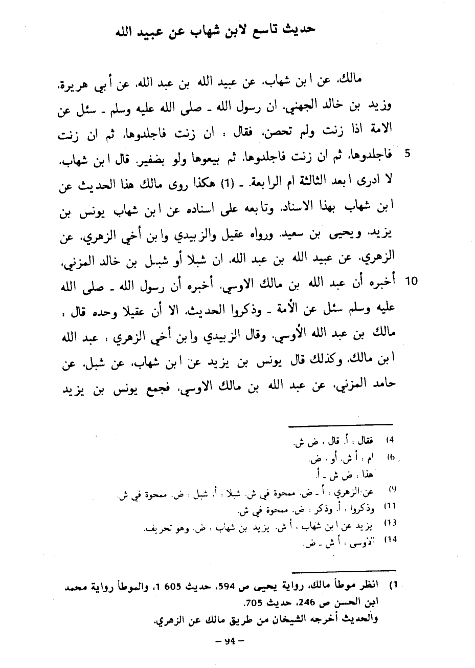 حَدِيثٌ تَاسِعٌ لِابْنِ شِهَابٍ عَنْ عُبَيْدِ اللَّهِ مَالِكٍ عَنِ ابْنِ شِهَابٍ عَنْ عُبَيْدِ اللَّهِ بْنِ عَبْدِ اللَّهِ عَنْ أَبِي هُرَيْرَةَ وَزَيْدِ بْنِ خَالِدٍ الْجُهَنِيِّ أَنَّ رَسُولَ اللَّهِ صَلَّى اللَّهُ عَلَيْهِ وَسَلَّمَ سُئِلَ عَنِ الْأَمَةِ إِذَا زَنَتْ وَلَمْ تُحْصَنْ فَقَالَ إِنْ زَنَتْ فَاجْلِدُوهَا ثُمَّ إِنْ زَنَتْ فَاجْلِدُوهَا ثُمَّ إِنْ زَنَتْ فَاجْلِدُوهَا ثُمَّ بِيعُوهَا وَلَوْ بِضَفِيرٍ قَالَ ابْنُ شِهَابٍ لَا أَدْرِي أَبَعْدَ الثَّالِثَةِ أَمِ الرَّابِعَةِ هَكَذَا رَوَى مَالِكٌ هَذَا الْحَدِيثَ عَنِ ابْنِ شِهَابٍ بِهَذَا الْإِسْنَادِ وَتَابَعَهُ عَلَى إِسْنَادِهِ عَنِ ابْنِ شِهَابٍ يُونُسُ بْنُ يَزِيدَ وَيَحْيَى بْنُ سَعِيدٍ وَرَوَاهُ عُقَيْلٌ وَالزُّبَيْدِيُّ وَابْنُ أَخِي الزُّهْرِيِّ عَنِ الزُّهْرِيِّ عَنْ عُبَيْدِ اللَّهِ بْنِ عَبْدِ اللَّهِ أَنَّ شِبْلًا أَوْ شِبْلَ بْنَ خَالِدٍ الْمُزَنِيَّ أَخْبَرَهُ أَنَّ عَبْدَ اللَّهِ بْنَ مَالِكٍ الْأَوْسِيَّ أَخْبَرَهُ أَنَّ رَسُولَ اللَّهِ صَلَّى اللَّهُ عَلَيْهِ وَسَلَّمَ سُئِلَ عَنِ الْأَمَةِ وَذَكَرُوا الْحَدِيثَ إِلَّا أَنَّ عُقَيْلًا وَحْدَهُ قَالَ مَالِكُ بْنُ عَبْدِ اللَّهِ الْأَوْسِيُّ وَقَالَ الزُّبَيْدِيُّ وَابْنُ أَخِي الزهري عبد الله ابن مَالِكٍ وَكَذَلِكَ قَالَ يُونُسُ بْنُ يَزِيدَ عَنِ ابْنِ شِهَابٍ عَنْ شِبْلٍ عَنْ حَامِدٍ الْمُزَنِيِّ عَنْ عَبْدِ اللَّهِ بْنِ مَالِكٍ الْأَوْسِيِّ فَجَمَعَ يُونُسُ بْنُ يَزِيدَ