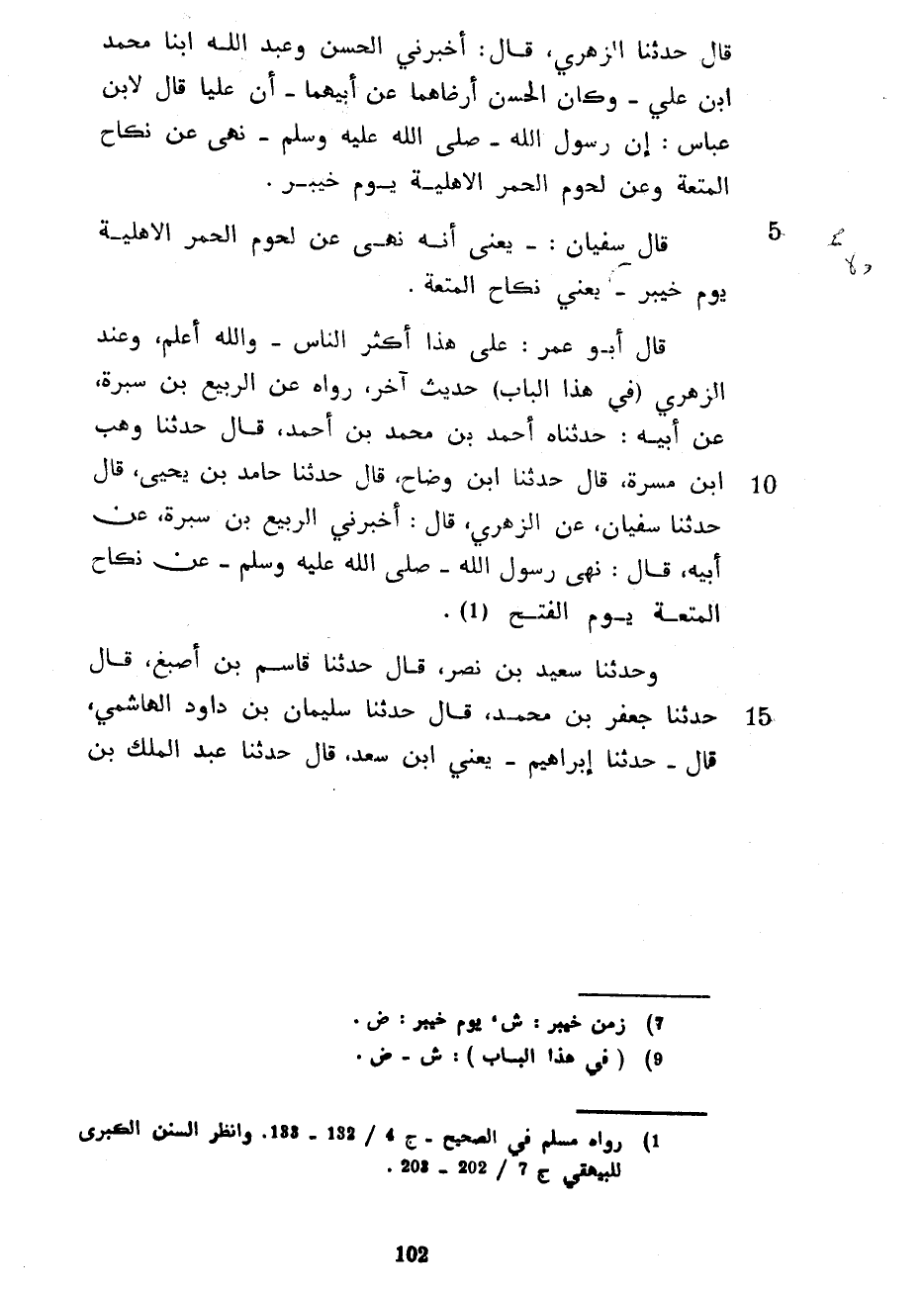 قَالَ حَدَّثَنَا الزُّهْرِيُّ قَالَ أَخْبَرَنِي الْحَسَنُ وَعَبْدُ اللَّهِ ابْنَا مُحَمَّدِ بْنِ عَلِيٍّ وَكَانَ الْحَسَنُ أَرْضَاهُمَا عَنْ أَبِيهِمَا أَنَّ عَلِيًّا قَالَ لِابْنِ عَبَّاسٍ أَنَّ رَسُولَ اللَّهِ صَلَّى اللَّهُ عَلَيْهِ وَسَلَّمَ نَهَى عَنْ نِكَاحِ الْمُتْعَةِ وَعَنْ لُحُومِ الْحُمُرِ الْأَهْلِيَّةِ يَوْمَ خَيْبَرَ قَالَ سُفْيَانُ يَعْنِي أَنَّهُ نَهَى عَنْ لُحُومِ الْحُمُرِ الْأَهْلِيَّةِ يَوْمَ خَيْبَرَ يَعْنِي نِكَاحَ الْمُتْعَةِ قَالَ أَبُو عُمَرَ عَلَى هَذَا أَكْثَرُ النَّاسِ وَاللَّهُ أَعْلَمُ وَعِنْدَ الزُّهْرِيِّ (فِي هَذَا الْبَابِ) حَدِيثٌ آخَرُ رَوَاهُ عَنِ الرَّبِيعِ بْنِ سَبْرَةَ عَنْ أَبِيهِ حَدَّثَنَاهُ أَحْمَدُ بْنُ مُحَمَّدِ بْنِ أَحْمَدَ قَالَ حَدَّثَنَا وَهْبُ بْنُ مَسَرَّةَ قَالَ حَدَّثَنَا ابْنُ وَضَّاحٍ قَالَ حَدَّثَنَا حَامِدُ بْنُ يَحْيَى قَالَ حَدَّثَنَا سُفْيَانُ عَنِ الزُّهْرِيِّ قَالَ أَخْبَرَنِي الرَّبِيعُ بْنُ سَبْرَةَ عَنْ أَبِيهِ قَالَ نَهَى رَسُولُ اللَّهِ صَلَّى اللَّهُ عَلَيْهِ وَسَلَّمَ عَنْ نِكَاحِ الْمُتْعَةِ يَوْمَ الْفَتْحِ وَحَدَّثَنَا سَعِيدُ بْنُ نَصْرٍ قَالَ حَدَّثَنَا قَاسِمُ بْنُ أَصْبَغَ قَالَ حَدَّثَنَا جَعْفَرُ بْنُ مُحَمَّدٍ قَالَ حَدَّثَنَا سُلَيْمَانُ بْنُ دَاوُدَ الْهَاشِمِيُّ قَالَ حَدَّثَنَا إِبْرَاهِيمُ يَعْنِي ابْنَ سَعْدٍ قَالَ حَدَّثَنَا عَبْدُ الْمَلِكِ بْنُ