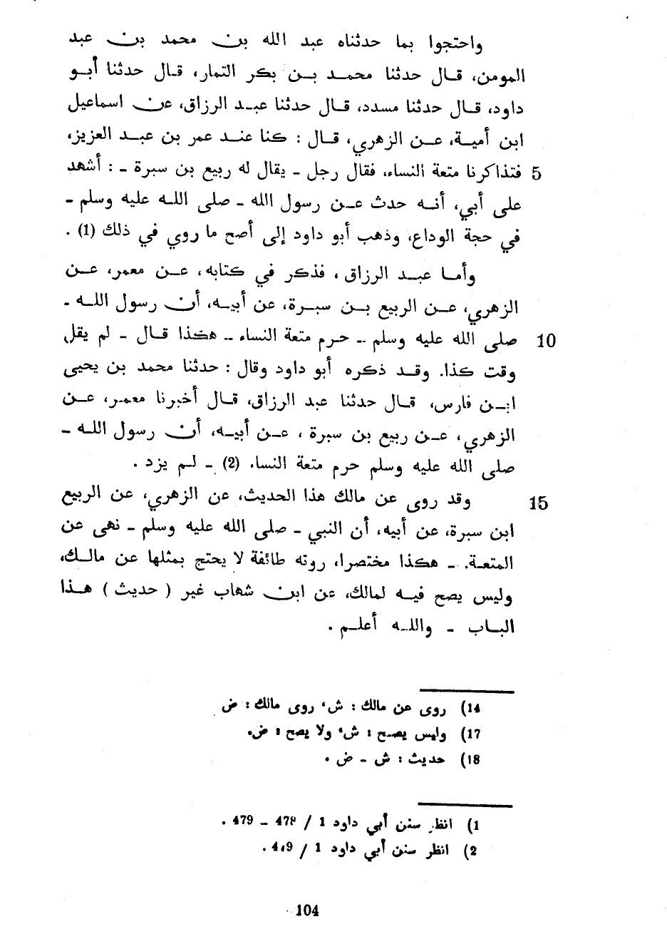 وَاحْتَجُّوا بِمَا حَدَّثَنَاهُ عَبْدُ اللَّهِ بْنُ مُحَمَّدِ بْنِ عَبْدِ الْمُؤْمِنِ قَالَ حَدَّثَنَا مُحَمَّدُ بْنُ بَكْرٍ التَّمَّارُ قَالَ حَدَّثَنَا أَبُو دَاوُدَ قَالَ حَدَّثَنَا مُسَدَّدٌ قَالَ حَدَّثَنَا عَبْدُ الرَّزَّاقِ عَنْ إِسْمَاعِيلَ بْنَ أُمَيَّةَ عَنِ الزُّهْرِيِّ قَالَ كُنَّا عِنْدَ عُمَرَ بْنِ عَبْدِ الْعَزِيزِ فَتَذَاكَرْنَا مُتْعَةَ النِّسَاءِ فَقَالَ رَجُلٌ يُقَالُ لَهُ رَبِيعُ بْنُ سَبْرَةَ أَشْهَدُ عَلَى أَبِي أَنَّهُ حَدَّثَ عَنْ رَسُولِ اللَّهِ صَلَّى اللَّهُ عَلَيْهِ وَسَلَّمَ في حَجَّةِ الْوَدَاعِ وَذَهَبَ أَبُو دَاوُدَ إِلَى أَصَحِّ مَا رُوِيَ فِي ذَلِكَ وَأَمَّا عَبْدُ الرَّزَّاقِ فَذَكَرَ فِي كِتَابِهِ عَنْ مَعْمَرٍ عَنِ الزُّهْرِيِّ عَنِ الرَّبِيعِ بْنِ سَبْرَةَ عَنْ أَبِيهِ أَنَّ رَسُولَ اللَّهِ صَلَّى اللَّهُ عَلَيْهِ وَسَلَّمَ حَرَّمَ مُتْعَةَ النِّسَاءِ هَكَذَا قَالَ لَمْ يَقُلْ وَقْتَ كَذَا وَقَدْ ذَكَرَهُ أَبُو دَاوُدَ وَقَالَ حَدَّثَنَا مُحَمَّدُ بْنُ يَحْيَى بْنِ فَارِسٍ قَالَ حَدَّثَنَا عَبْدُ الرَّزَّاقِ قَالَ أَخْبَرَنَا مَعْمَرٌ عَنِ الزُّهْرِيِّ عَنْ رَبِيعِ بْنِ سَبْرَةَ عَنْ أَبِيهِ أَنَّ رَسُولَ اللَّهِ صَلَّى اللَّهُ عَلَيْهِ وَسَلَّمَ حَرَّمَ مُتْعَةَ النِّسَاءِ لَمْ يَزِدْ وَقَدْ رُوِيَ عَنْ مَالِكٍ هَذَا الْحَدِيثُ عَنِ الزُّهْرِيِّ عَنِ الرَّبِيعِ بْنِ سَبْرَةَ عَنْ أَبِيهِ أَنَّ النَّبِيَّ صَلَّى اللَّهُ عَلَيْهِ وَسَلَّمَ نَهَى عَنِ الْمُتْعَةِ هَكَذَا مُخْتَصَرًا رَوَتْهُ طَائِفَةٌ لَا يُحْتَجُّ بِمِثْلِهَا عَنْ مَالِكٍ وَلَيْسَ يَصِحُّ فِيهِ لِمَالِكٍ عَنِ ابْنِ شِهَابٍ غَيْرَ (حَدِيثِ) هَذَا الْبَابِ وَاللَّهُ أَعْلَمُ