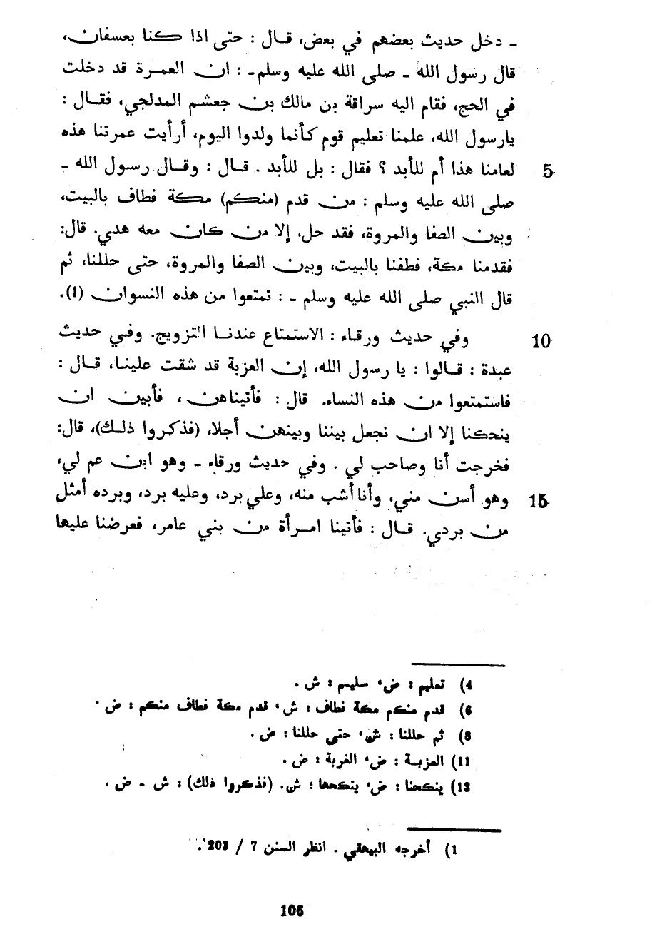 دَخَلَ حَدِيثُ بَعْضِهِمْ فِي بَعْضٍ قَالَ حَتَّى إِذَا كُنَّا بِعُسْفَانَ قَالَ رَسُولُ اللَّهِ صَلَّى اللَّهُ عَلَيْهِ وَسَلَّمَ إِنَّ الْعُمْرَةَ قَدْ دَخَلَتْ فِي الْحَجِّ فَقَامَ إِلَيْهِ سُرَاقَةُ بْنُ مَالِكِ بْنِ جَعْشَمَ الْمُدْلِجِيُّ فَقَالَ يَا رَسُولَ اللَّهِ عَلِّمْنَا تَعْلِيمَ قَوْمٍ كَأَنَّمَا وُلِدُوا الْيَوْمَ أَرَأَيْتَ عُمْرَتَنَا هَذِهِ لِعَامِنَا هَذَا أَمْ لِلْأَبَدِ فَقَالَ بَلْ لِلْأَبَدِ قَالَ وَقَالَ رَسُولُ اللَّهِ صَلَّى اللَّهُ عَلَيْهِ وَسَلَّمَ مَنْ قَدِمَ (مِنْكُمْ) مَكَّةَ فَطَافَ بِالْبَيْتِ وَبَيْنَ الصَّفَا وَالْمَرْوَةِ فَقَدْ حَلَّ إِلَّا مَنْ كَانَ مَعَهُ هَدْيٌ قَالَ فَقَدِمْنَا مَكَّةَ فَطُفْنَا بِالْبَيْتِ وَبَيْنَ الصَّفَا وَالْمَرْوَةِ حَتَّى حَلَلْنَا ثُمَّ قَالَ النَّبِيُّ صَلَّى اللَّهُ عَلَيْهِ وَسَلَّمَ تَمَتَّعُوا مِنْ هَذِهِ النِّسْوَانِ وَفِي حَدِيثِ وَرْقَاءَ الِاسْتِمْتَاعُ عِنْدَنَا التَّزْوِيجُ وَفِي حَدِيثِ عَبْدَةَ قَالُوا يَا رَسُولَ اللَّهِ إِنَّ الْعُزْبَةَ قَدْ شُقَّتْ عَلَيْنَا قَالَ فَاسْتَمْتِعُوا مِنْ هَذِهِ النِّسَاءِ قال فأتيناهن فأبين أن ينحكنا! إِلَّا أَنْ نَجْعَلَ بَيْنَنَا وَبَيْنَهُنَّ أَجَلًا (فَذَكَرُوا ذَلِكَ) قَالَ فَخَرَجْتُ أَنَا وَصَاحِبٌ لِي وَفِي حَدِيثِ وَرْقَاءَ وَهُوَ ابْنُ عَمٍّ لِي وَهُوَ أَسَنُّ مِنِّي وَأَنَا أَشِبُّ مِنْهُ وَعَلَيَّ بُرْدٌ وَعَلَيْهِ بُرْدٌ وَبَرْدُهُ أَمْثَلُ مِنْ بُرْدِي قَالَ فَأَتَيْنَا امْرَأَةً مِنْ بَنِي عَامِرٍ فَعَرَضَنَا عَلَيْهَا