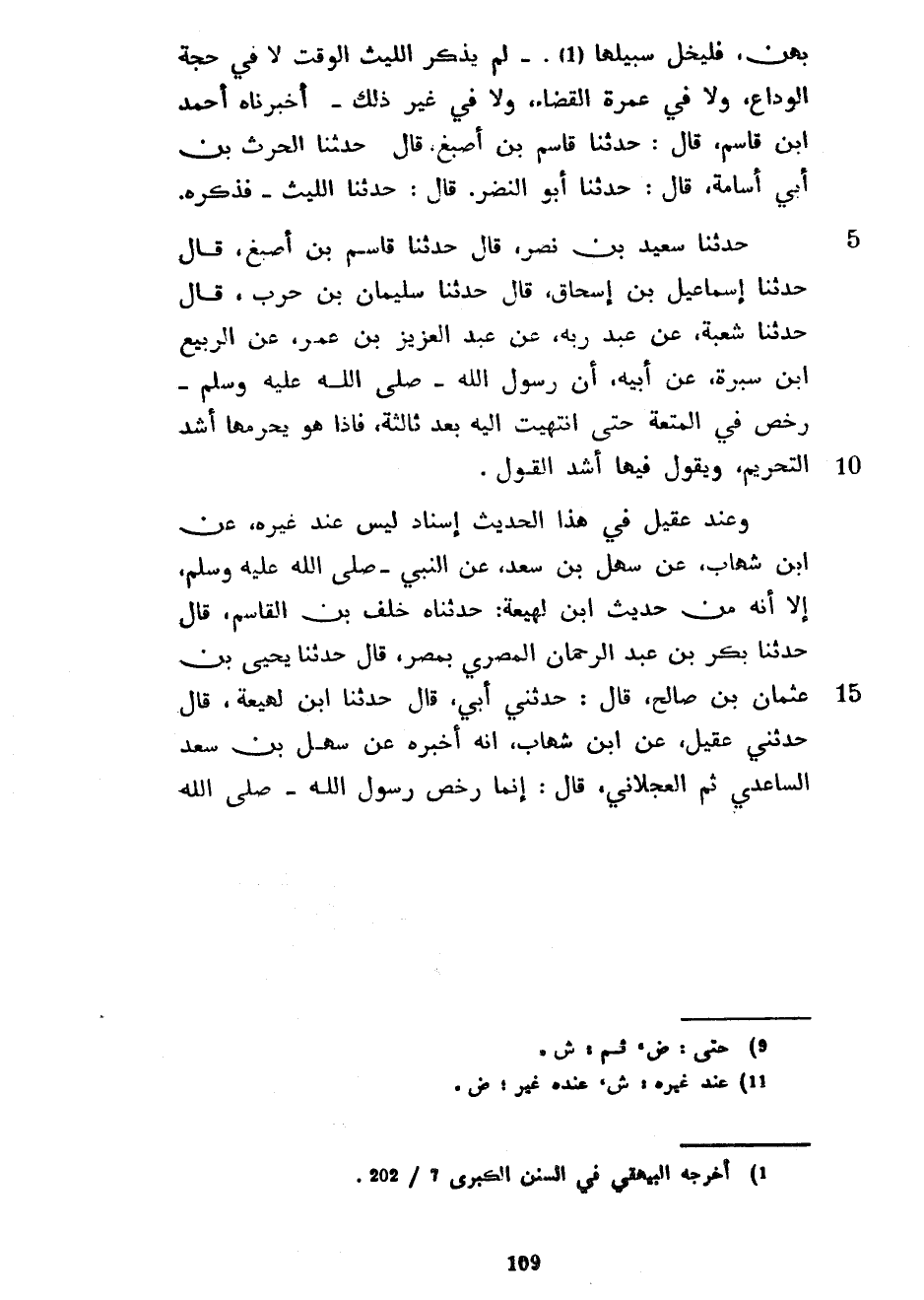 بِهِنَّ فَلْيُخَلِّ سَبِيلَهَا لَمْ يَذْكُرِ اللَّيْثُ الْوَقْتَ لَا فِي حَجَّةِ الْوَدَاعِ وَلَا فِي عُمْرَةِ الْقَضَاءِ وَلَا فِي غَيْرِ ذَلِكَ أَخْبَرَنَاهُ أَحْمَدُ بْنُ قَاسِمٍ قَالَ حَدَّثَنَا قَاسِمُ بْنُ أَصْبَغَ قَالَ حَدَّثَنَا الْحَرْثُ بْنُ أَبِي أُسَامَةَ قَالَ حَدَّثَنَا أَبُو النَّضْرِ قَالَ حَدَّثَنَا اللَّيْثُ فَذَكَرَهُ حَدَّثَنَا سَعِيدُ بْنُ نَصْرٍ قَالَ حَدَّثَنَا قَاسِمُ بْنُ أَصْبَغَ قَالَ حَدَّثَنَا إِسْمَاعِيلُ بْنُ إِسْحَاقَ قَالَ حَدَّثَنَا سُلَيْمَانُ بْنُ حَرْبٍ قَالَ حَدَّثَنَا شُعْبَةُ عَنْ عَبْدِ رَبِّهِ عَنْ عَبْدِ الْعَزِيزِ بْنِ عُمَرَ عَنِ الرَّبِيعِ بْنِ سَبْرَةَ عَنْ أَبِيهِ أَنَّ رَسُولَ اللَّهِ صَلَّى اللَّهُ عَلَيْهِ وَسَلَّمَ رَخَّصَ فِي الْمُتْعَةِ حَتَّى انْتَهَيْتُ إِلَيْهِ بَعْدَ ثَالِثَةٍ فَإِذَا هُوَ يُحَرِّمُهَا أَشَدَّ التَّحْرِيمِ وَيَقُولُ فِيهَا أَشَدَّ الْقَوْلِ وَعِنْدَ عَقِيلٍ فِي هَذَا الْحَدِيثِ إِسْنَادٌ لَيْسَ عِنْدَ غَيْرِهِ عَنِ ابْنِ شِهَابٍ عَنْ سَهْلِ بْنِ سَعْدٍ عَنِ النَّبِيِّ صَلَّى اللَّهُ عَلَيْهِ وَسَلَّمَ إِلَّا أَنَّهُ مِنْ حَدِيثِ ابْنِ لهيعة حدثناه خلف بن القاسم قال حدثا بكر بن عبد الرحمان الْمِصْرِيُّ بِمِصْرَ قَالَ حَدَّثَنَا يَحْيَى بْنُ عُثْمَانَ بْنِ صَالِحٍ قَالَ حَدَّثَنِي أَبِي قَالَ حَدَّثَنَا ابْنُ لَهِيعَةَ قَالَ حَدَّثَنِي عَقِيلٌ عَنِ ابْنِ شِهَابٍ أَنَّهُ أَخْبَرَهُ عَنْ سَهْلِ بْنِ سَعْدٍ السَّاعِدِيِّ ثُمَّ الْعَجْلَانِيِّ قَالَ إِنَّمَا رَخَّصَ رَسُولُ اللَّهِ صَلَّى اللَّهُ