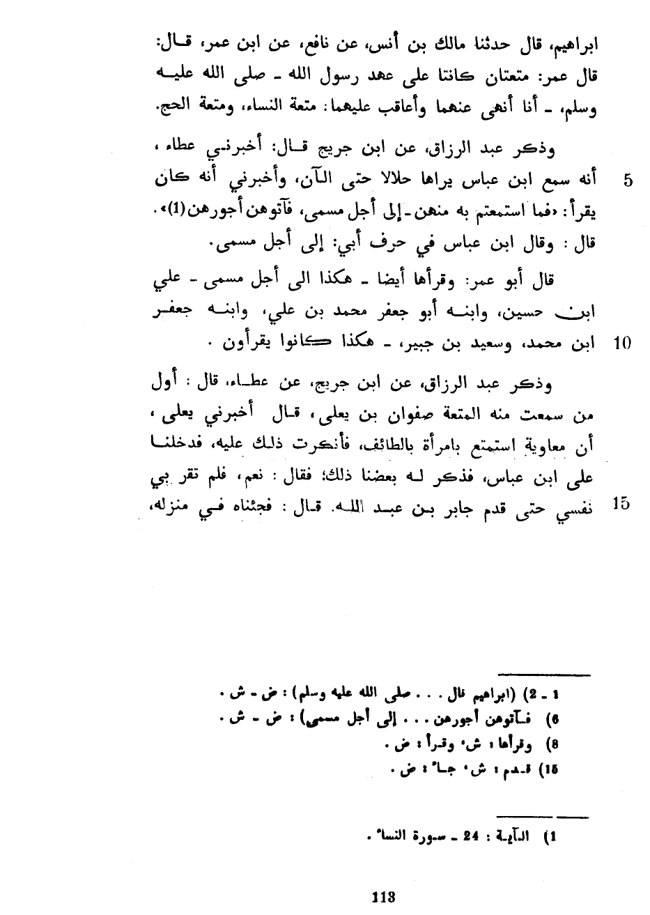 إِبْرَاهِيمَ قَالَ حَدَّثَنَا مَالِكِ بْنُ أَنَسٍ عَنْ نَافِعٍ عَنِ ابْنِ عُمَرَ قَالَ قَالَ عُمَرُ مُتْعَتَانِ كَانَتَا عَلَى عَهْدِ رَسُولِ اللَّهِ صَلَّى اللَّهُ عَلَيْهِ وَسَلَّمَ أَنَا أَنْهِي عَنْهُمَا وَأُعَاقِبُ عَلَيْهِمَا مُتْعَةُ النِّسَاءِ وَمُتْعَةُ الْحَجِّ وَذَكَرَ عَبْدُ الرَّزَّاقِ عَنِ ابْنِ جُرَيْجٍ قَالَ أَخْبَرَنِي عَطَاءٌ أَنَّهُ سَمِعَ ابْنَ عَبَّاسٍ يَرَاهَا حَلَالًا حَتَّى الْآنَ وَأَخْبَرَنِي أَنَّهُ كَانَ يَقْرَأُ فَمَا اسْتَمْتَعْتُمْ بِهِ مِنْهُنَّ إِلَى أَجَلٍ مُسَمًّى فَآتُوهُنَّ أُجُورَهُنَّ قَالَ وَقَالَ ابْنُ عَبَّاسٍ فِي حَرْفِ أُبَيٍّ إِلَى أَجَلٍ مُسَمَّى قَالَ أَبُو عُمَرَ وَقَرَأَهَا أَيْضًا هَكَذَا إِلَى أَجَلٍ مُسَمًّى عَلِيُّ بْنُ حُسَيْنٍ وَابْنُهُ أَبُو جَعْفَرٍ مُحَمَّدُ بْنُ عَلِيٍّ وَابْنُهُ جَعْفَرُ بْنُ مُحَمَّدٍ وَسَعِيدُ بْنُ جُبَيْرٍ هكذا كانوا يقرأون وَذَكَرَ عَبْدُ الرَّزَّاقِ عَنِ ابْنِ جُرَيْجٍ عَنْ عَطَاءٍ قَالَ أَوَّلُ مَنْ سَمِعْتُ مِنْهُ الْمُتْعَةَ صَفْوَانُ بْنُ يَعْلَى قَالَ أَخْبَرَنِي يَعْلَى أَنَّ مُعَاوِيَةَ اسْتَمْتَعَ بِامْرَأَةٍ بِالطَّائِفِ فَأَنْكَرْتُ ذَلِكَ عَلَيْهِ فَدَخَلْنَا عَلَى ابْنِ عَبَّاسٍ فَذَكَرَ لَهُ بَعْضُنَا ذَلِكَ فَقَالَ نَعَمْ فَلَمْ تَقِرُّ بِي نَفْسِي حَتَّى قَدِمَ جَابِرُ بْنُ عَبْدِ اللَّهِ قَالَ فَجِئْنَاهُ فِي مَنْزِلِهِ