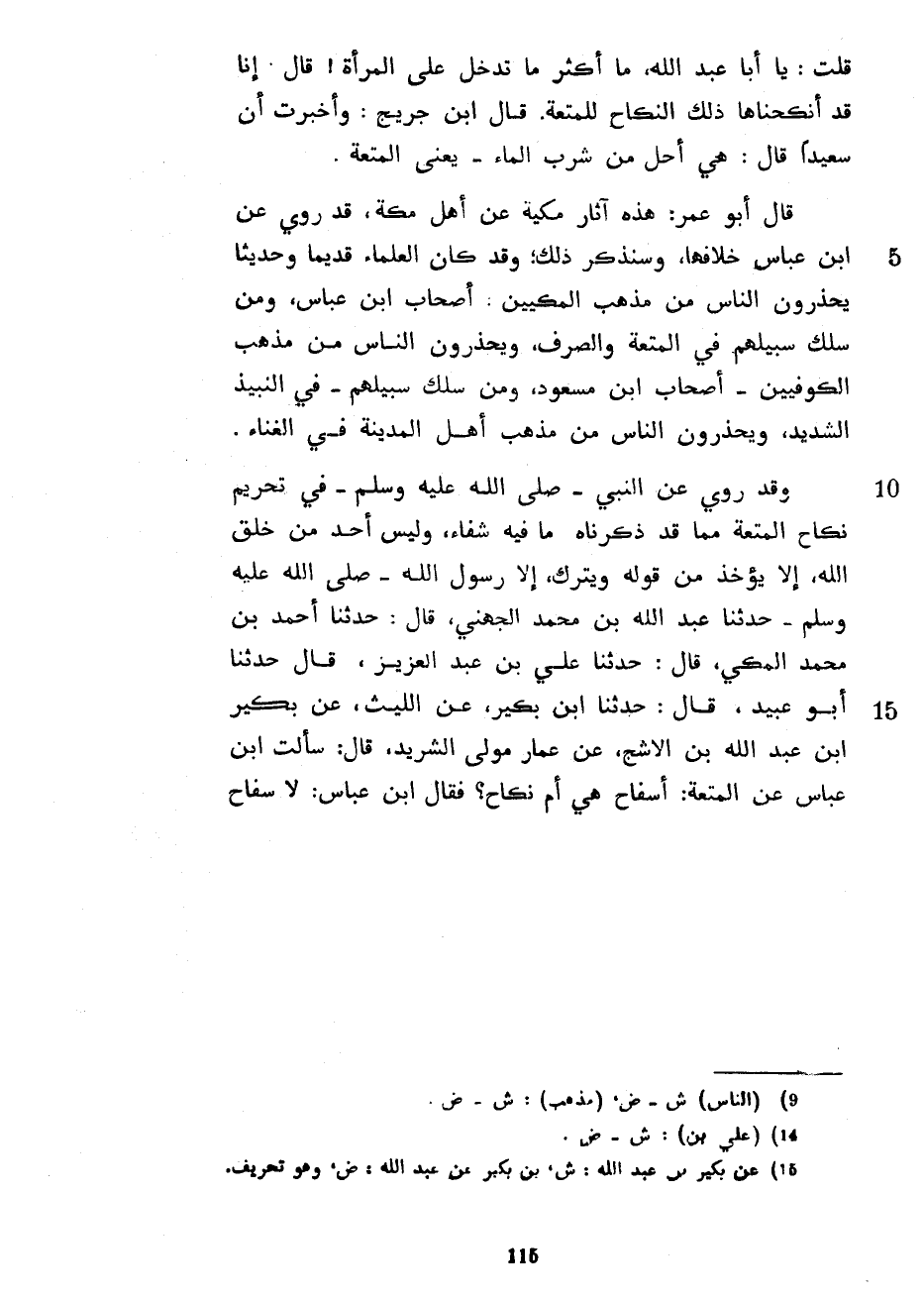 قُلْتُ يَا أَبَا عَبْدِ اللَّهِ مَا أَكْثَرَ مَا تَدْخُلُ عَلَى الْمَرْأَةِ قَالَ إِنَّا قَدْ أَنْكَحْنَاهَا ذَلِكَ النِّكَاحَ لِلْمُتْعَةِ قَالَ ابْنُ جُرَيْجٍ وَأُخْبِرْتُ أَنَّ سَعِيدًا قَالَ هِيَ أَحَلُّ مِنْ شُرْبِ الْمَاءِ يَعْنِي الْمُتْعَةَ قَالَ أَبُو عُمَرَ هَذِهِ آثَارٌ مَكِّيَّةٌ عَنْ أَهْلِ مَكَّةَ قَدْ رُوِيَ عَنِ ابْنِ عَبَّاسٍ خِلَافُهَا وَسَنَذْكُرُ ذَلِكَ وَقَدْ كَانَ الْعُلَمَاءُ قَدِيمًا وَحَدِيثًا يُحَذِّرُونَ النَّاسَ مِنْ مَذْهَبِ الْمَكِّيِّينَ أَصْحَابِ ابْنِ عَبَّاسٍ وَمَنْ سَلَكَ سَبِيلَهُمْ فِي الْمُتْعَةِ وَالصَّرْفِ وَيُحَذِّرُونَ النَّاسَ مِنْ مَذْهَبِ الْكُوفِيِّينَ أَصْحَابِ ابْنِ مَسْعُودٍ وَمَنْ سَلَكَ سَبِيلَهُمْ فِي النَّبِيذِ الشَّدِيدِ وَيُحَذِّرُونَ النَّاسَ مِنْ مَذْهَبِ أَهْلِ الْمَدِينَةِ فِي الْغِنَاءِ وَقَدْ رُوِيَ عَنِ النَّبِيِّ صَلَّى اللَّهُ عَلَيْهِ وسلم فِي تَحْرِيمِ نِكَاحِ الْمُتْعَةِ مِمَّا قَدْ ذَكَرْنَاهُ مَا فِيهِ شِفَاءٌ وَلَيْسَ أَحَدٌ مِنْ خَلْقِ اللَّهِ إِلَّا يُؤْخَذُ مِنْ قَوْلِهِ وَيُتْرَكُ إِلَّا رَسُولَ اللَّهِ صَلَّى اللَّهُ عَلَيْهِ وَسَلَّمَ حَدَّثَنَا عَبْدُ اللَّهِ بْنُ مُحَمَّدٍ الْجُهَنِيُّ قَالَ حَدَّثَنَا أَحْمَدُ بْنُ مُحَمَّدٍ الْمَكِّيُّ قَالَ حَدَّثَنَا عَلِيُّ بْنُ عَبْدِ الْعَزِيزِ قَالَ حَدَّثَنَا أَبُو عُبَيْدٍ قَالَ حَدَّثَنَا ابْنُ بُكَيْرٍ عَنِ اللَّيْثِ عَنْ بُكَيْرِ بْنِ عَبْدِ اللَّهِ بْنِ الْأَشَجِّ عَنْ عَمَّارٍ مَوْلَى الشَّرِيدِ قَالَ سَأَلْتُ ابْنَ عَبَّاسٍ عَنِ الْمُتْعَةِ أَسِفَاحٌ هِيَ أَمْ نِكَاحٌ فَقَالَ ابْنُ عَبَّاسٍ لَا سِفَاحَ