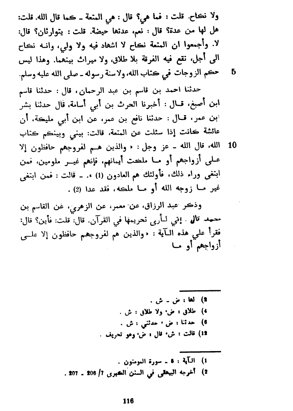 وَلَا نِكَاحَ قُلْتُ فَمَا هِيَ قَالَ هِيَ الْمُتْعَةُ كَمَا قَالَ اللَّهُ قُلْتُ هَلْ لَهَا من عدة قال نعم عدتها حيضة قُلْتُ يَتَوَارَثَانِ قَالَ لَا وَأَجْمَعُوا أَنَّ الْمُتْعَةَ نِكَاحٌ لَا إِشْهَادَ فِيهِ وَلَا وَلِيَّ وَأَنَّهُ نِكَاحٌ إِلَى أَجَلٍ تَقَعُ فِيهِ الْفُرْقَةُ بِلَا طَلَاقٍ وَلَا مِيرَاثٍ بَيْنَهُمَا وَهَذَا لَيْسَ حُكْمُ الزَّوْجَاتِ فِي كِتَابِ اللَّهِ وَلَا سُنَّةِ رَسُولِهِ صَلَّى اللَّهُ عَلَيْهِ وَسَلَّمَ حَدَّثَنَا أَحْمَدُ بْنُ قاسم بن عبد الرحمان قَالَ حَدَّثَنَا قَاسِمُ بْنُ أَصْبَغَ قَالَ أَخْبَرَنَا الحرث بْنُ أَبِي أُسَامَةَ قَالَ حَدَّثَنَا بِشْرُ بْنُ عُمَرَ قَالَ حَدَّثَنَا نَافِعُ بْنُ عُمَرَ عَنِ ابْنِ أَبِي مُلَيْكَةَ أَنَّ عَائِشَةَ كَانَتْ إِذَا سُئِلَتْ عَنِ الْمُتْعَةِ قَالَتْ بَيْنِي وَبَيْنَكُمْ كِتَابُ اللَّهِ قَالَ اللَّهُ عَزَّ وَجَلَّ وَالَّذِينَ هُمْ لِفُرُوجِهِمْ حَافِظُونَ إِلَّا عَلَى أَزْوَاجِهِمْ أوْ مَا مَلَكَتْ أَيْمَانُهُمْ فَإِنَّهُمْ غَيْرُ مَلُومِينَ فَمَنِ ابْتَغَى وَرَاءَ ذَلِكَ فَأُولَئِكَ هُمُ الْعَادُونَ قَالَتْ فَمَنِ ابْتَغَى غَيْرَ مَا زَوَّجَهُ اللَّهُ أَوْ مَا مَلَكَّهُ فَقَدْ عَدَا وَذَكَرَ عَبْدُ الرَّزَّاقِ عَنْ مَعْمَرٍ عَنِ الزُّهْرِيِّ عن القاسم بن! إِنِّي لَأَرَى تَحْرِيمُهَا فِي الْقُرْآنِ قَالَ قُلْتُ فَأَيْنَ قَالَ فَقَرَأَ عَلَيَّ هَذِهِ الْآيَةَ وَالَّذِينَ هُمْ لِفُرُوجِهِمْ حَافِظُونَ إِلَّا عَلَى أَزْوَاجِهِمْ أوْ ما