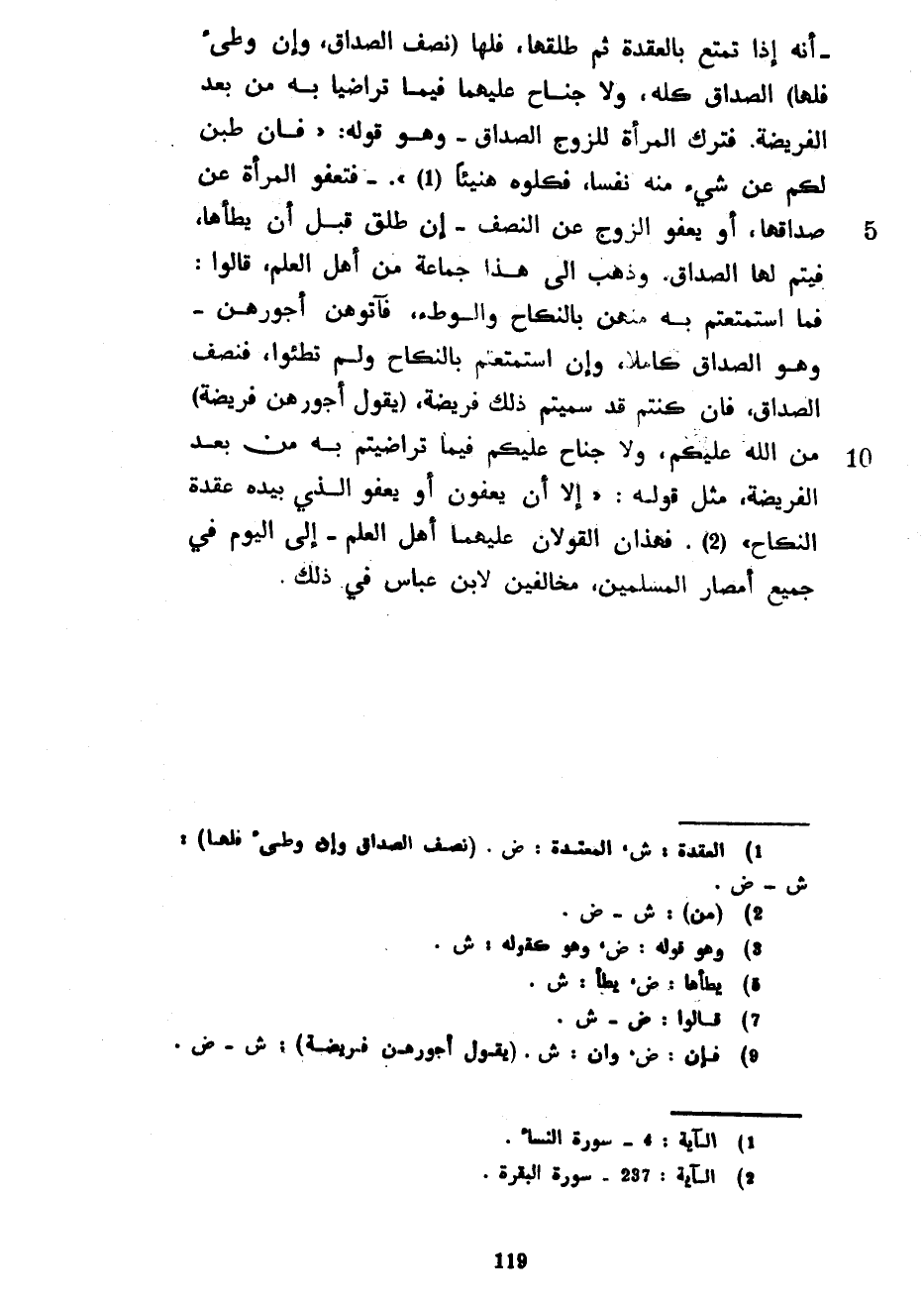 أَنَّهُ إِذَا تَمَتَّعَ بِالْعُقْدَةِ ثُمَّ طَلَّقَهَا فَلَهَا (نِصْفُ الصَّدَاقِ وَإِنْ وَطِئَ فَلَهَا) الصَّدَاقُ كُلُّهُ وَلَا جُنَاحَ عَلَيْهِمَا فِيمَا تَرَاضَيَا بِهِ مِنْ بَعْدِ الْفَرِيضَةِ فَتَرْكُ الْمَرْأَةِ لِلزَّوْجِ الصَّدَاقَ وَهُوَ قَوْلُهُ فَإِنْ طِبْنَ لَكُمْ عَنْ شَيْءٍ مِنْهُ نَفْسًا فَكُلُوهُ هَنِيئًا فَتَعْفُو الْمَرْأَةُ عَنْ صَدَاقِهَا أَوْ يَعْفُو الزَّوْجُ عَنِ النِّصْفِ إِنْ طَلَّقَ قَبْلَ أَنْ يَطَأَهَا فَيَتِمُّ لَهَا الصَّدَاقُ وَذَهَبَ إِلَى هَذَا جَمَاعَةٌ مِنْ أَهْلِ الْعِلْمِ قَالُوا فَمَا اسْتَمْتَعْتُمْ بِهِ مِنْهُنَّ بِالنِّكَاحِ وَالْوَطْءِ فَآتُوهُنَّ أُجُورَهُنَّ وَهُوَ الصَّدَاقُ كَامِلًا وَإِنِ اسْتَمْتَعْتُمْ بِالنِّكَاحِ وَلَمْ تَطَئُوا فَنِصْفُ الصَّدَاقِ فَإِنْ كُنْتُمْ قَدْ سَمَّيْتُمْ ذَلِكَ فَرِيضَةً (يَقُولُ أُجُورَهُنَّ فَرِيضَةً) مِنَ اللَّهِ عَلَيْكُمْ وَلَا جُنَاحَ عَلَيْكُمْ فِيمَا تَرَاضَيْتُمْ بِهِ مِنْ بَعْدِ الْفَرِيضَةِ مِثْلَ قَوْلِهِ إِلَّا أَنْ يَعْفُونَ أَوْ يَعْفُوَ الَّذِي بِيَدِهِ عُقْدَةُ النِّكَاحِ فَهَذَانِ الْقَوْلَانِ عَلَيْهِمَا أَهْلُ الْعِلْمِ إِلَى الْيَوْمِ فِي جَمِيعِ أَمْصَارِ الْمُسْلِمِينَ مُخَالِفِينَ لِابْنِ عَبَّاسٍ فِي ذَلِكَ