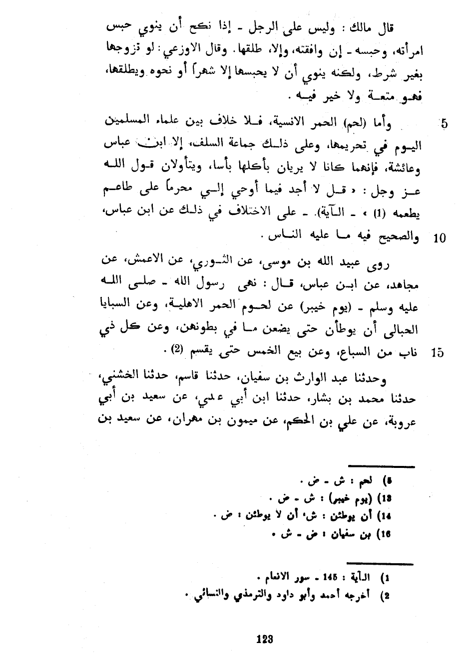 قَالَ مَالِكٌ وَلَيْسَ عَلَى الرَّجُلِ إِذَا نَكَحَ أَنْ يَنْوِيَ حَبْسَ امْرَأَتِهِ وَحَبْسُهُ إِنْ وَافَقَتْهُ وَإِلَّا طَلَّقَهَا وَقَالَ الْأَوْزَاعِيُّ لَوْ تَزَوَّجَهَا بِغَيْرِ شَرْطٍ وَلَكِنَّهُ يَنْوِي أَنْ لَا يَحْبِسَهَا إِلَّا شَهْرًا أَوْ نَحْوَهُ وَيُطْلِقُهَا فَهُوَ مُتْعَةٌ وَلَا خَيْرَ فِيهِ وَأَمَّا (لَحْمُ) الْحُمُرِ الْإِنْسِيَّةِ فَلَا خِلَافَ بَيْنِ عُلَمَاءِ الْمُسْلِمِينَ الْيَوْمَ فِي تَحْرِيمِهَا وَعَلَى ذَلِكَ جَمَاعَةُ السَّلَفِ إِلَّا ابْنَ عَبَّاسٍ وَعَائِشَةَ فَإِنَّهُمَا كَانَا لَا يَرَيَانِ بِأَكْلِهَا بَأْسًا وَيَتَأَوَّلَانِ قَوْلَ اللَّهِ عَزَّ وَجَلَّ قُلْ لَا أَجِدُ فيما أُوحِيَ إِلَيَّ مُحَرَّمًا عَلَى طَاعِمٍ يَطْعَمُهُ الْآيَةَ) عَلَى الِاخْتِلَافِ فِي ذَلِكَ عَنِ ابْنِ عَبَّاسٍ وَالصَّحِيحُ فِيهِ مَا عَلَيْهِ النَّاسُ رَوَى عُبَيْدُ اللَّهِ بْنُ مُوسَى عَنِ الثَّوْرِيِّ عَنِ الْأَعْمَشِ عَنْ مُجَاهِدٍ عَنِ ابْنِ عَبَّاسٍ قَالَ نَهَى رَسُولُ اللَّهِ صَلَّى اللَّهُ عَلَيْهِ وسلم (يوم خَيْبَرَ) عَنْ لُحُومِ الْحُمُرِ الْأَهْلِيَّةِ وَعَنِ السَّبَايَا الْحَبَالَى أَنْ يُوطَأْنَ حَتَّى يَضَعْنَ مَا فِي بطونهن وعن كل ذي ناب من السباع وَعَنْ بَيْعِ الْخُمْسِ حَتَّى يُقْسَمَ وَحَدَّثَنَا عَبْدُ الْوَارِثِ بْنُ سُفْيَانَ حَدَّثَنَا قَاسِمُ حَدَّثَنَا الْخُشَنِيُّ حَدَّثَنَا مُحَمَّدُ بْنُ بَشَّارٍ حَدَّثَنَا ابْنُ أَبِي عَدِيٍّ عَنْ سَعِيدِ بْنِ أَبِي عَرُوبَةَ عَنْ عَلِيِّ بْنِ الْحَكَمِ عَنْ مَيْمُونِ بْنِ مِهْرَانَ عَنْ سَعِيدِ بْنِ