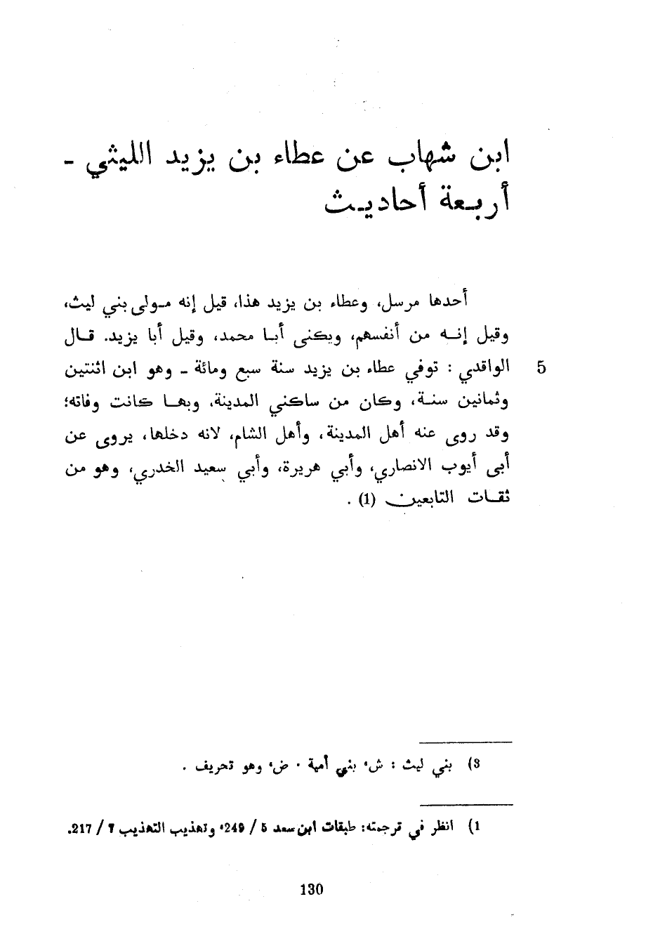 ابْنِ شِهَابٍ عَنْ عَطَاءِ بْنِ يَزِيدَ اللَّيْثِيِّ أَرْبَعَةُ أَحَادِيثَ أَحَدُهَا مُرْسَلٌ وَعَطَاءُ بْنُ يَزِيدَ هَذَا قِيلَ إِنَّهُ مَوْلَى بَنِي لَيْثٍ وَقِيلَ إِنَّهُ مِنْ أَنْفُسِهِمْ وَيُكَنَّى أَبَا مُحَمَّدٍ وَقِيلَ أَبَا يَزِيدَ قَالَ الْوَاقِدِيُّ تُوُفِّيَ عَطَاءُ بْنُ يَزِيدَ سَنَةَ سَبْعٍ وَمِائَةٍ وَهُوَ ابْنُ اثْنَتَيْنِ وَثَمَانِينَ سَنَةً وَكَانَ مِنْ سَاكِنِي الْمَدِينَةِ وَبِهَا كَانَتْ وَفَاتُهُ وَقَدْ رَوَى عَنْهُ أَهْلُ الْمَدِينَةِ وَأَهْلُ الشَّامِ لِأَنَّهُ دَخَلَهَا يَرْوِي عَنْ أَبِي أَيُّوبَ الْأَنْصَارِيِّ وَأَبِي هُرَيْرَةَ وَأَبِي سَعِيدٍ الْخُدْرِيِّ وَهُوَ مِنْ ثِقَاتِ التَّابِعِينَ