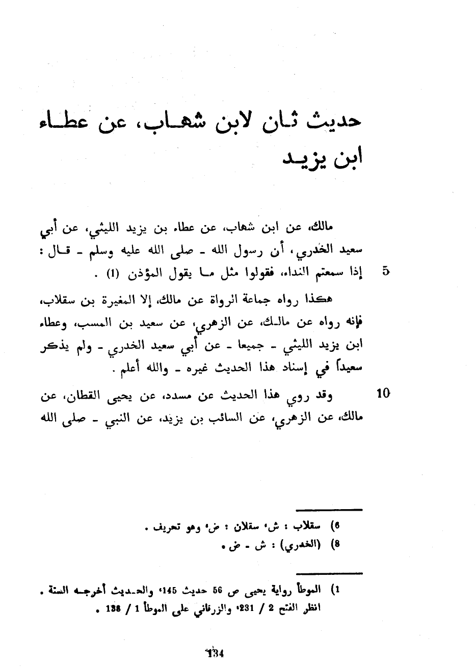حَدِيثٌ ثَانٍ لِابْنِ شِهَابٍ عَنْ عَطَاءِ بْنِ يَزِيدَ مَالِكٌ عَنِ ابْنِ شِهَابٍ عَنْ عَطَاءِ بْنِ يَزِيدَ اللَّيْثِيِّ عَنْ أَبِي سَعِيدٍ الْخُدْرِيِّ أَنَّ رَسُولَ اللَّهِ صَلَّى اللَّهُ عَلَيْهِ وَسَلَّمَ قَالَ إِذَا سَمِعْتُمْ النِّدَاءَ فَقُولُوا مِثْلَ مَا يَقُولُ الْمُؤَذِّنُ هَكَذَا رَوَاهُ جَمَاعَةُ الرُّوَاةِ عَنْ مَالِكٍ إِلَّا الْمُغِيرَةَ بْنَ سِقْلَابٍ فَإِنَّهُ رَوَاهُ عَنْ مَالِكٌ عَنِ الزُّهْرِيِّ عَنْ سَعِيدِ بْنِ الْمُسَيَّبِ وَعَطَاءِ بْنِ يَزِيدَ اللَّيْثِيِّ جَمِيعًا عَنْ أَبِي سَعِيدٍ الْخُدْرِيِّ وَلَمْ يَذْكُرْ سَعِيدًا فِي إِسْنَادِ هَذَا الْحَدِيثِ غَيْرَهُ وَاللَّهُ أَعْلَمُ وَقَدْ رَوَى هَذَا الْحَدِيثَ عَنْ مُسَدَّدٍ عَنْ يَحْيَى الْقَطَّانِ عَنْ مَالِكٍ عَنِ الزُّهْرِيِّ عَنِ السَّائِبِ بْنِ يَزِيدَ عَنِ النَّبِيِّ صَلَّى اللَّهُ