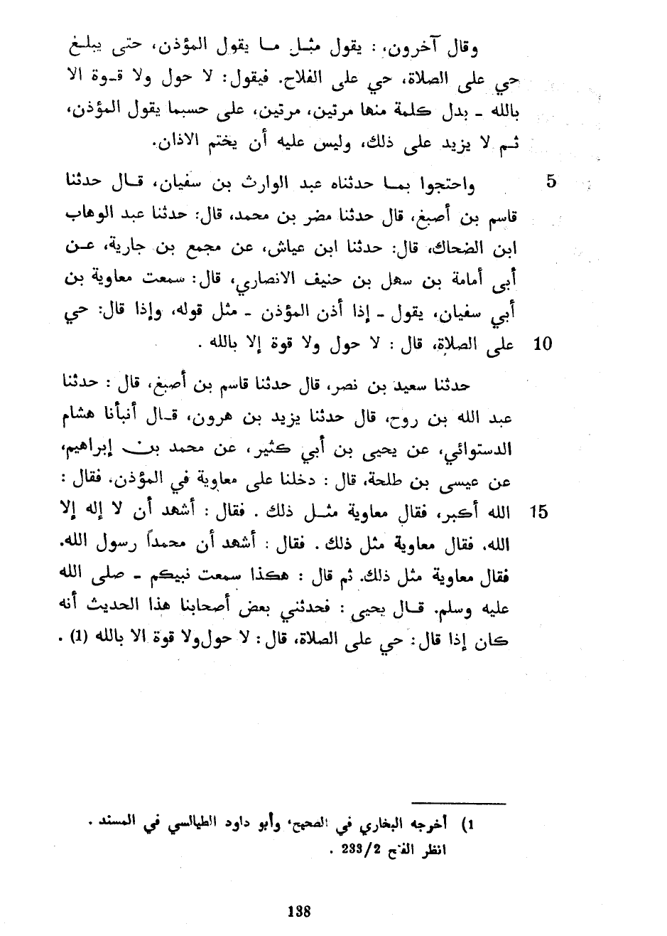 وَقَالَ آخَرُونَ يَقُولُ مِثْلَ مَا يَقُولُ الْمُؤَذِّنُ حَتَّى يَبْلُغَ حَيَّ عَلَى الصَّلَاةِ حَيَّ عَلَى الْفَلَّاحِ فَيَقُولُ لَا حَوْلَ وَلَا قُوَّةَ إِلَّا بِاللَّهِ بَدَلَ كَلِمَةٍ مِنْهَا مَرَّتَيْنِ مَرَّتَيْنِ عَلَى حسبما يَقُولُ الْمُؤَذِّنُ ثُمَّ لَا يَزِيدُ عَلَى ذَلِكَ وَلَيْسَ عَلَيْهِ أَنْ يَخْتِمَ الْأَذَانَ وَاحْتَجُّوا بِمَا حَدَّثَنَاهُ عَبْدُ الْوَارِثِ بْنُ سُفْيَانَ قَالَ حَدَّثَنَا قَاسِمُ بْنُ أَصْبَغَ قَالَ حَدَّثَنَا مُضَرُ بْنُ مُحَمَّدٍ قَالَ حَدَّثَنَا عَبْدُ الْوَهَّابِ بْنُ الضَّحَّاكِ قَالَ حَدَّثَنَا ابْنُ عَيَّاشٍ عَنْ مُجَمِّعِ بْنِ جَارِيَةَ عَنْ أَبِي أُمَامَةَ بْنِ سَهْلِ بْنِ حُنَيْفٍ الْأَنْصَارِيِّ قَالَ سَمِعْتُ مُعَاوِيَةَ بْنَ أَبِي سُفْيَانَ يَقُولُ إِذَا أَذَّنَ الْمُؤَذِّنُ مِثْلَ قَوْلِهِ وَإِذَا قَالَ حَيَّ عَلَى الصَّلَاةِ قَالَ لَا حَوْلَ وَلَا قُوَّةَ إِلَّا بِاللَّهِ حَدَّثَنَا سَعِيدُ بْنُ نَصْرٍ قَالَ حَدَّثَنَا قَاسِمُ بْنُ أَصْبَغَ قَالَ حَدَّثَنَا عَبْدُ اللَّهِ بْنُ رَوْحٍ قَالَ حدثنا يزيد بن هرون قَالَ أَنْبَأَنَا هِشَامٌ الدَّسْتُوَائِيُّ عَنْ يَحْيَى بْنِ أَبِي كَثِيرٍ عَنْ مُحَمَّدِ بْنِ إِبْرَاهِيمَ عَنْ عِيسَى بْنِ طَلْحَةَ قَالَ دَخَلْنَا عَلَى مُعَاوِيَةَ فِي الْمُؤَذِّنِ فَقَالَ اللَّهُ أَكْبَرُ فَقَالَ مُعَاوِيَةُ مِثْلَ ذَلِكَ فَقَالَ أَشْهَدُ أَنْ لَا إِلَهَ إِلَّا اللَّهُ فَقَالَ مُعَاوِيَةُ مِثْلَ ذَلِكَ فَقَالَ أَشْهَدُ أَنَّ مُحَمَّدًا رَسُولُ اللَّهِ فَقَالَ مُعَاوِيَةُ مِثْلَ ذَلِكَ ثُمَّ قَالَ هَكَذَا سَمِعْتُ نَبِيَّكُمْ صَلَّى اللَّهُ عَلَيْهِ وَسَلَّمَ قَالَ يَحْيَى فَحَدَّثَنِي بَعْضُ أَصْحَابِنَا هَذَا الْحَدِيثَ أَنَّهُ كَانَ إِذَا قَالَ حَيَّ عَلَى الصَّلَاةِ قَالَ لَا حَوْلَ وَلَا قُوَّةَ إِلَّا بِاللَّهِ