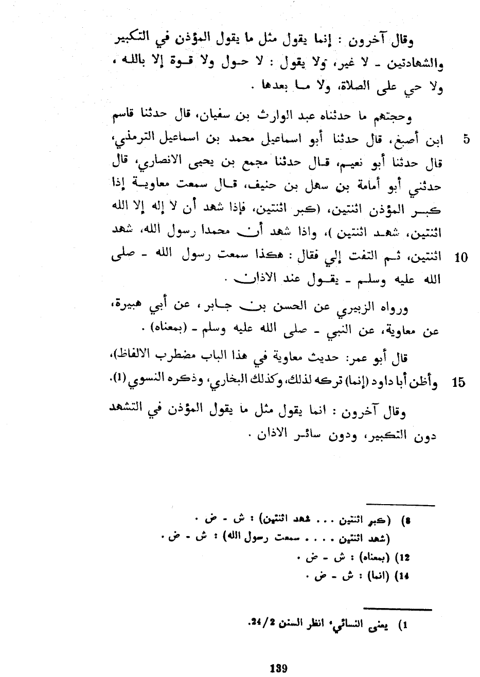 وَقَالَ آخَرُونَ إِنَّمَا يَقُولُ مِثْلَ مَا يَقُولُ المؤذن في التكبير والشهادتين لا غير وَلَا يَقُولُ لَا حَوْلَ وَلَا قُوَّةَ إِلَّا بِاللَّهِ وَلَا حَيَّ عَلَى الصَّلَاةِ وَلَا مَا بَعْدَهَا وَحُجَّتُهُمْ مَا حَدَّثَنَاهُ عَبْدُ الْوَارِثِ بْنُ سُفْيَانَ قَالَ حَدَّثَنَا قَاسِمُ بْنُ أَصْبَغَ قَالَ حَدَّثَنَا أَبُو إِسْمَاعِيلَ مُحَمَّدُ بْنُ إِسْمَاعِيلَ التِّرْمِذِيُّ قَالَ حَدَّثَنَا أَبُو نُعَيْمٍ قَالَ حَدَّثَنَا مُجَمِّعُ بْنُ يَحْيَى الْأَنْصَارِيُّ قَالَ حَدَّثَنِي أَبُو أُمَامَةَ بْنُ سَهْلِ بْنِ حُنَيْفٍ قَالَ سَمِعْتُ مُعَاوِيَةَ إِذَا كَبَّرَ الْمُؤَذِّنُ اثْنَتَيْنِ (كَبَّرَ اثْنَتَيْنِ فَإِذَا شَهِدَ أَنْ لَا إِلَهَ إِلَّا اللَّهُ اثْنَتَيْنِ شَهِدَ اثْنَتَيْنِ) وَإِذَا شَهِدَ أَنَّ مُحَمَّدًا رَسُولُ اللَّهِ شَهِدَ اثْنَتَيْنِ ثُمَّ الْتَفَتَ إِلَيَّ فَقَالَ هَكَذَا سَمِعْتُ رَسُولَ اللَّهِ صَلَّى اللَّهُ عَلَيْهِ وَسَلَّمَ يَقُولُ عِنْدَ الْأَذَانِ وَرَوَاهُ الزُّبَيْرِيُّ عَنِ الْحَسَنِ بْنِ جَابِرٍ عَنْ أَبِي هُبَيْرَةَ عَنْ مُعَاوِيَةَ عَنِ النَّبِيِّ صَلَّى اللَّهُ عَلَيْهِ وَسَلَّمَ (بِمَعْنَاهُ) قَالَ أَبُو عُمَرَ حَدِيثُ مُعَاوِيَةَ فِي هَذَا الْبَابِ مُضْطَرِبُ الْأَلْفَاظِ) وَأَظُنُّ أَبَا دَاوُدَ (إِنَّمَا) تَرَكَهُ لِذَلِكَ وَكَذَلِكَ الْبُخَارِيُّ وَذَكَرَهُ النَّسَوِيُّ وَقَالَ آخَرُونَ إِنَّمَا يَقُولُ مِثْلَ مَا يَقُولُ الْمُؤَذِّنُ فِي التَّشَهُّدِ دُونَ التَّكْبِيرِ وَدُونَ سَائِرِ الأذان