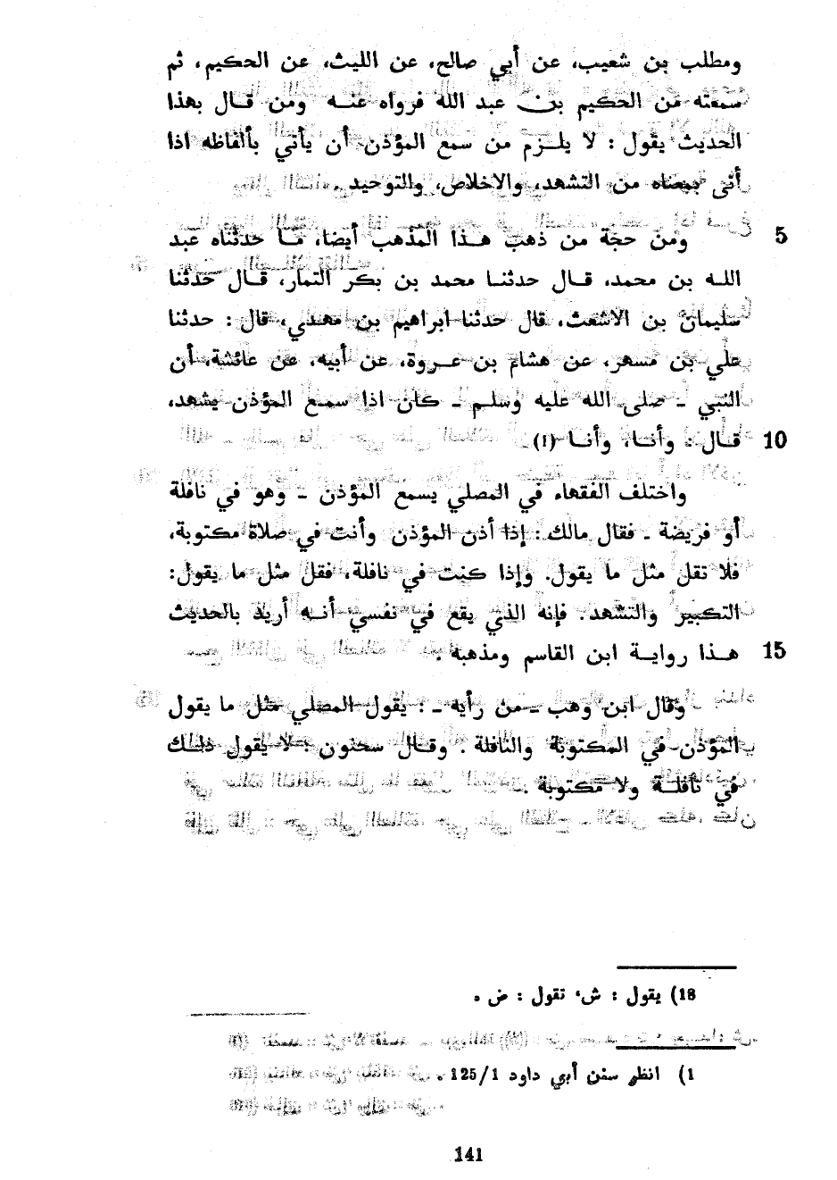وَمُطَلِّبُ بْنُ شُعَيْبٍ عَنْ أَبِي صَالِحٍ عَنِ اللَّيْثِ عَنِ الْحَكِيمِ ثُمَّ سَمِعْتُهُ مِنَ الْحَكِيمِ بْنِ عَبْدِ اللَّهِ فَرَوَاهُ عَنْهُ وَمَنْ قَالَ بِهَذَا الْحَدِيثِ يَقُولُ لَا يَلْزَمُ مَنْ سَمِعَ الْمُؤَذِّنَ أَنْ يَأْتِيَ بِأَلْفَاظِهِ إِذَا أَتَى بِمَعْنَاهُ مِنَ التَّشَهُّدِ وَالْإِخْلَاصِ وَالتَّوْحِيدِ وَمِنْ حُجَّةِ مَنْ ذَهَبَ هَذَا الْمَذْهَبَ أَيْضًا مَا حَدَّثَنَاهُ عَبْدُ اللَّهِ بْنُ مُحَمَّدٍ قَالَ حَدَّثَنَا مُحَمَّدُ بْنُ بَكْرٍ التَّمَّارُ قَالَ حَدَّثَنَا سُلَيْمَانُ بْنُ الْأَشْعَثِ قَالَ حَدَّثَنَا إِبْرَاهِيمُ بْنُ مَهْدِيٍّ قَالَ حَدَّثَنَا عَلِيُّ بْنُ مُسْهِرٍ عَنْ هِشَامِ بْنِ عُرْوَةَ عَنْ أَبِيهِ عَنْ عَائِشَةَ أَنَّ النَّبِيَّ صَلَّى اللَّهُ عَلَيْهِ وَسَلَّمَ كَانَ إِذَا سَمِعَ الْمُؤَذِّنَ يَشْهَدُ قَالَ وَأَنَا وَأَنَا وَاخْتَلَفَ الْفُقَهَاءُ فِي الْمُصَلِّي يَسْمَعُ الْمُؤَذِّنَ وَهُوَ فِي نَافِلَةٍ أَوْ فَرِيضَةٍ فَقَالَ مَالِكٌ إِذَا أَذَّنَ الْمُؤَذِّنُ وَأَنْتَ فِي صَلَاةٍ مَكْتُوبَةٍ فَلَا تَقُلْ مِثْلَ مَا يَقُولُ وَإِذَا كُنْتَ فِي نَافِلَةٍ فَقُلْ مِثْلَ مَا يَقُولُ التَّكْبِيرُ وَالتَّشَهُّدُ فَإِنَّهُ الَّذِي يَقَعُ فِي نَفْسِي أَنَّهُ أُرِيدَ بِالْحَدِيثِ هَذَا رِوَايَةُ ابْنِ الْقَاسِمِ وَمَذْهَبُهُ وَقَالَ ابْنُ وَهْبٍ مِنْ رَأْيِهِ يَقُولُ الْمُصَلِّي مِثْلَ مَا يَقُولُ الْمُؤَذِّنُ فِي الْمَكْتُوبَةِ وَالنَّافِلَةِ وَقَالَ سَحْنُونٌ لَا يَقُولُ ذَلِكَ فِي نَافِلَةٍ وَلَا مَكْتُوبَةٍ