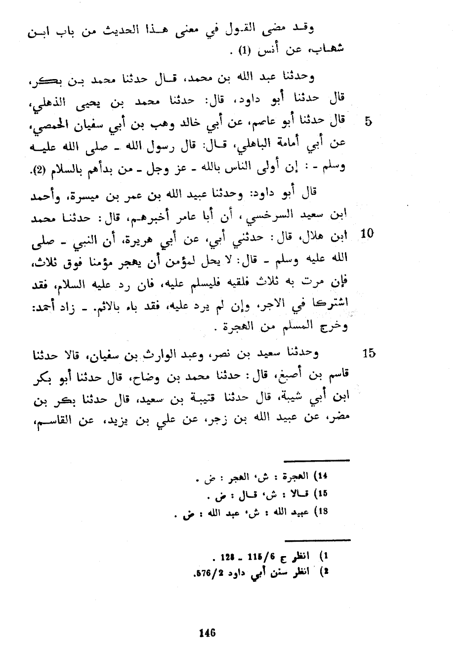 وَقَدْ مَضَى الْقَوْلُ فِي مَعْنَى هَذَا الْحَدِيثِ مِنْ بَابِ ابْنِ شِهَابٍ عَنْ أَنَسٍ وَحَدَّثَنَا عَبْدُ اللَّهِ بْنُ مُحَمَّدٍ قَالَ حَدَّثَنَا مُحَمَّدُ بْنُ بَكْرٍ قَالَ حَدَّثَنَا أَبُو دَاوُدَ قَالَ حَدَّثَنَا مُحَمَّدُ بْنُ يَحْيَى الذُّهْلِيُّ قَالَ حَدَّثَنَا أَبُو عَاصِمٍ عَنْ أَبِي خَالِدٍ وَهْبِ بْنِ أَبِي سُفْيَانَ الْحِمْصِيِّ عَنْ أَبِي أُمَامَةَ الْبَاهِلِيِّ قَالَ قَالَ رَسُولُ اللَّهِ صَلَّى اللَّهُ عَلَيْهِ وَسَلَّمَ إِنَّ أَوْلَى النَّاسِ بِاللَّهِ عَزَّ وَجَلَّ مَنْ بَدَأَهُمْ بِالسَّلَامِ قَالَ أَبُو دَاوُدَ وَحَدَّثَنَا عُبَيْدُ اللَّهِ بْنُ عُمَرَ بْنِ مَيْسَرَةَ وَأَحْمَدُ بْنُ سَعِيدٍ السَّرْخَسِيُّ أَنَّ أَبَا عَامِرٍ أَخْبَرَهُمْ قَالَ حَدَّثَنَا مُحَمَّدُ بْنُ هِلَالٍ قَالَ حَدَّثَنِي أَبِي عَنْ أَبِي هُرَيْرَةَ أَنَّ النَّبِيَّ صَلَّى اللَّهُ عَلَيْهِ وَسَلَّمَ قَالَ لَا يَحِلُّ لِمُؤْمِنٍ أَنْ يَهْجُرَ مُؤْمِنًا فَوْقَ ثَلَاثٍ فَإِنْ مَرَّتْ بِهِ ثَلَاثٌ فَلَقِيَهِ فَلْيُسَلِّمْ عَلَيْهِ فَإِنْ رَدَّ عَلَيْهِ السَّلَامَ فَقَدِ اشْتَرَكَا فِي الْأَجْرِ وَإِنْ لَمْ يَرُدَّ عَلَيْهِ فَقَدْ بَاءَ بِالْإِثْمِ زَادَ أَحْمَدُ وَخَرَجَ الْمُسْلِمُ مِنَ الْهِجْرَةِ وَحَدَّثَنَا سَعِيدُ بْنُ نَصْرٍ وَعَبْدُ الْوَارِثِ بْنُ سُفْيَانَ قَالَا حَدَّثَنَا قَاسِمُ بْنُ أَصْبَغَ قَالَ حَدَّثَنَا مُحَمَّدُ بْنُ وَضَّاحٍ قَالَ حَدَّثَنَا أَبُو بكر بن أَبِي شَيْبَةَ قَالَ حَدَّثَنَا قُتَيْبَةُ بْنُ سَعِيدٍ قَالَ حَدَّثَنَا بَكْرُ بْنُ مُضَرَ عَنْ عُبَيْدِ اللَّهِ بْنِ زَجْرٍ عَنْ عَلِيِّ بْنِ يَزِيدَ عن القاسم