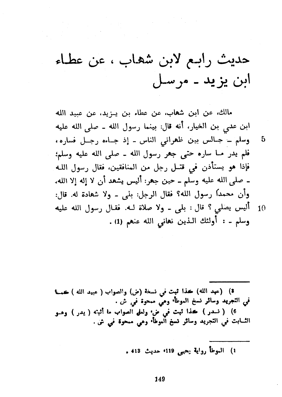حَدِيثٌ رَابِعٌ لِابْنِ شِهَابٍ عَنْ عَطَاءِ بْنِ يَزِيدَ مُرْسَلٌ مَالِكٌ عَنِ ابْنِ شِهَابٍ عَنْ عَطَاءِ بْنِ يَزِيدَ عَنْ عُبَيْدِ اللَّهِ بْنِ عَدِيِّ بْنِ الْخِيَارِ أَنَّهُ قَالَ بَيْنَمَا رَسُولِ اللَّهِ صَلَّى اللَّهُ عَلَيْهِ وَسَلَّمَ جَالِسٌ بَيْنَ ظَهْرَانَيِ النَّاسِ إِذْ جَاءَهُ رَجُلٌ فَسَارَّهُ فَلَمْ يُدْرَ مَا سَارَّهُ حَتَّى جَهَرَ رَسُولِ اللَّهِ صَلَّى اللَّهُ عَلَيْهِ وَسَلَّمَ فَإِذَا هُوَ يَسْتَأْذِنُ فِي قَتْلِ رَجُلٍ مِنَ الْمُنَافِقِينَ فَقَالَ رَسُولُ اللَّهِ صَلَّى اللَّهُ عَلَيْهِ وَسَلَّمَ حِينَ جَهَرَ أَلَيْسَ يَشْهَدُ أَنْ لَا إِلَهَ إِلَّا اللَّهُ وَأَنَّ مُحَمَّدًا رَسُولُ اللَّهِ فَقَالَ الرَّجُلُ بَلَى وَلَا شَهَادَةَ لَهُ قَالَ أَلَيْسَ يُصَلِّي قَالَ بَلَى وَلَا صَلَاةَ لَهُ فَقَالَ رَسُولُ اللَّهِ صَلَّى اللَّهُ عَلَيْهِ وَسَلَّمَ أُولَئِكَ الَّذِينَ نَهَانِي الله عنهم