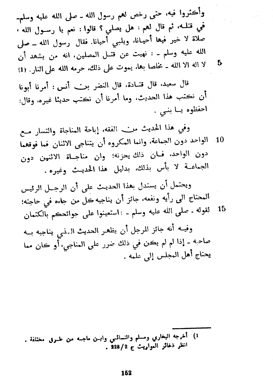 وَأَكْثَرُوا فِيهِ حَتَّى رَخَّصَ لَهُمْ رَسُولُ اللَّهِ صَلَّى اللَّهُ عَلَيْهِ وَسَلَّمَ فِي قَتْلِهِ ثُمَّ قَالَ لَهُمْ هَلْ يُصَلِّي قَالُوا نَعَمْ يَا رَسُولَ اللَّهِ صَلَاةً لَا خَيْرَ فِيهَا أَحْيَانًا وَيُلَبِّي أَحْيَانًا فَقَالَ رَسُولُ اللَّهِ صَلَّى اللَّهُ عَلَيْهِ وَسَلَّمَ نُهِيتُ عَنْ قَتْلِ الْمُصَلِّينَ إِنَّهُ مَنْ يَشْهَدْ أَنْ لَا إِلَهَ إِلَّا اللَّهُ مُخْلِصًا بِهَا يَمُوتُ عَلَى ذَلِكَ حَرَّمُهُ اللَّهُ عَلَى النَّارِ قَالَ سَعِيدٌ قَالَ قَتَادَةُ قَالَ النَّضْرُ بْنُ أَنَسٍ أَمَرَنَا أَبُونَا أَنْ نَكْتُبَ هَذَا الْحَدِيثَ وَمَا أَمَرَنَا أَنْ نَكْتُبَ حَدِيثًا غَيْرَهُ وَقَالَ احْفَظُوهُ يَا بَنِيَّ وَفِي هَذَا الْحَدِيثِ مِنَ الْفِقْهِ إِبَاحَةُ الْمُنَاجَاةِ وَالتَّسَارِّ مَعَ الْوَاحِدِ دُونَ الْجَمَاعَةِ وَإِنَّمَا الْمَكْرُوهُ أَنْ يَتَنَاجَى الِاثْنَانِ فَمَا فَوْقَهُمَا دُونَ الْوَاحِدِ فَإِنَّ ذَلِكَ يُحْزِنُهُ وَأَنَّ مُنَاجَاةَ الِاثْنَيْنِ دُونَ الْجَمَاعَةِ لَا بَأْسَ بِذَلِكَ بِدَلِيلِ هَذَا الْحَدِيثِ وَغَيْرِهِ وَيُحْتَمَلُ أَنْ يُسْتَدَلَّ بِهَذَا الْحَدِيثِ عَلَى أَنَّ الرَّجُلَ الرَّئِيسَ الْمُحْتَاجَ إِلَى رَأْيِهِ وَنَفْعِهِ جَائِزٌ أَنْ يُنَاجِيَهُ كُلُّ مَنْ جَاءَهُ فِي حَاجَتِهِ لِقَوْلِهِ صَلَّى اللَّهُ عَلَيْهِ وَسَلَّمَ اسْتَعِينُوا عَلَى حَوَائِجِكُمْ بِالْكِتْمَانِ وَفِيهِ أَنَّهُ جَائِزٌ لِلرَّجُلِ أَنْ يُظْهِرَ الْحَدِيثَ الَّذِي يُنَاجِيهِ بِهِ صَاحِبُهُ إِذَا لَمْ يَكُنْ فِي ذَلِكَ ضَرَرٌ عَلَى الْمُنَاجِي أَوْ كَانَ مِمَّا يَحْتَاجُ أَهْلُ الْمَجْلِسِ إِلَى عِلْمِهِ
