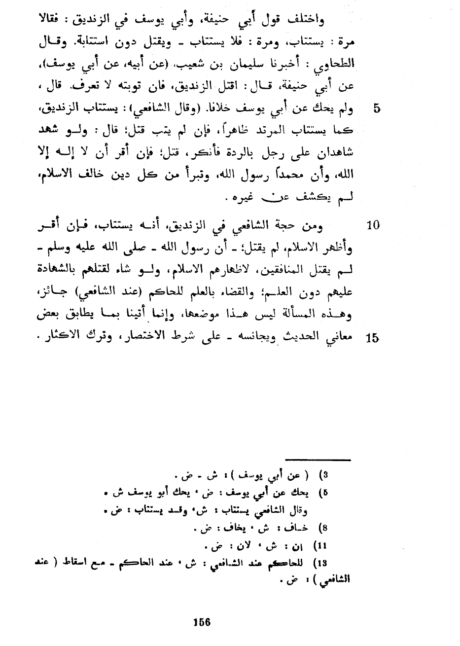 وَاخْتَلَفَ قَوْلُ أَبِي حَنِيفَةَ وَأَبِي يُوسُفَ فِي الزنديق فقالا مرة يستتاب ومرة فَلَا يُسْتَتَابُ وَيُقْتَلُ دُونَ اسْتِتَابَةٍ وَقَالَ الطَّحَاوِيُّ أَخْبَرَنَا سُلَيْمَانُ بْنُ شُعَيْبٍ (عَنْ أَبِيهِ عَنْ أَبِي يُوسُفَ) عَنْ أَبِي حَنِيفَةَ قَالَ اقْتُلِ الزِّنْدِيقَ فَإِنَّ تَوْبَتَهُ لَا تُعْرَفُ قَالَ وَلَمْ يَحْكِ عَنْ أَبِي يُوسُفَ خِلَافًا (وَقَالَ الشَّافِعِيُّ) يستتاب الزنديق كما يستتاب المترد ظاهرا فإن لم يتب قتل قال ولوشهد شَاهِدَانِ عَلَى رَجُلٍ بِالرِّدَّةِ فَأَنْكَرَ قُتِلَ فَإِنْ أَقَرَّ أَنْ لَا إِلَهَ إِلَّا اللَّهُ وَأَنَّ مُحَمَّدًا رَسُولُ اللَّهِ وَتَبَرَّأَ مِنْ كُلِّ دِينٍ خَالَفَ الْإِسْلَامَ لَمْ يُكْشَفْ عَنْ غَيْرِهِ وَمِنْ حُجَّةِ الشَّافِعِيِّ فِي الزِّنْدِيقِ أَنَّهُ يُسْتَتَابُ فَإِنْ أَقَرَّ وَأَظْهَرَ الْإِسْلَامَ لَمْ يُقْتَلْ أَنَّ رَسُولَ اللَّهِ صَلَّى اللَّهُ عَلَيْهِ وَسَلَّمَ لَمْ يَقْتُلِ الْمُنَافِقِينَ لِإِظْهَارِهِمُ الْإِسْلَامَ وَلَوْ شَاءَ لَقَتَلَهُمْ بِالشَّهَادَةِ عَلَيْهِمْ دُونَ الْعِلْمِ وَالْقَضَاءُ بِالْعِلْمِ لِلْحَاكِمِ (عِنْدَ الشَّافِعِيِّ) جَائِزٌ وَهَذِهِ الْمَسْأَلَةُ لَيْسَ هَذَا مَوْضِعَهَا وَإِنَّمَا أَتَيْنَا بِمَا يُطَابِقُ بَعْضَ مَعَانِي الْحَدِيثِ وَيُجَانِسُهُ عَلَى شَرْطِ الِاخْتِصَارِ وَتَرْكِ الْإِكْثَارِ