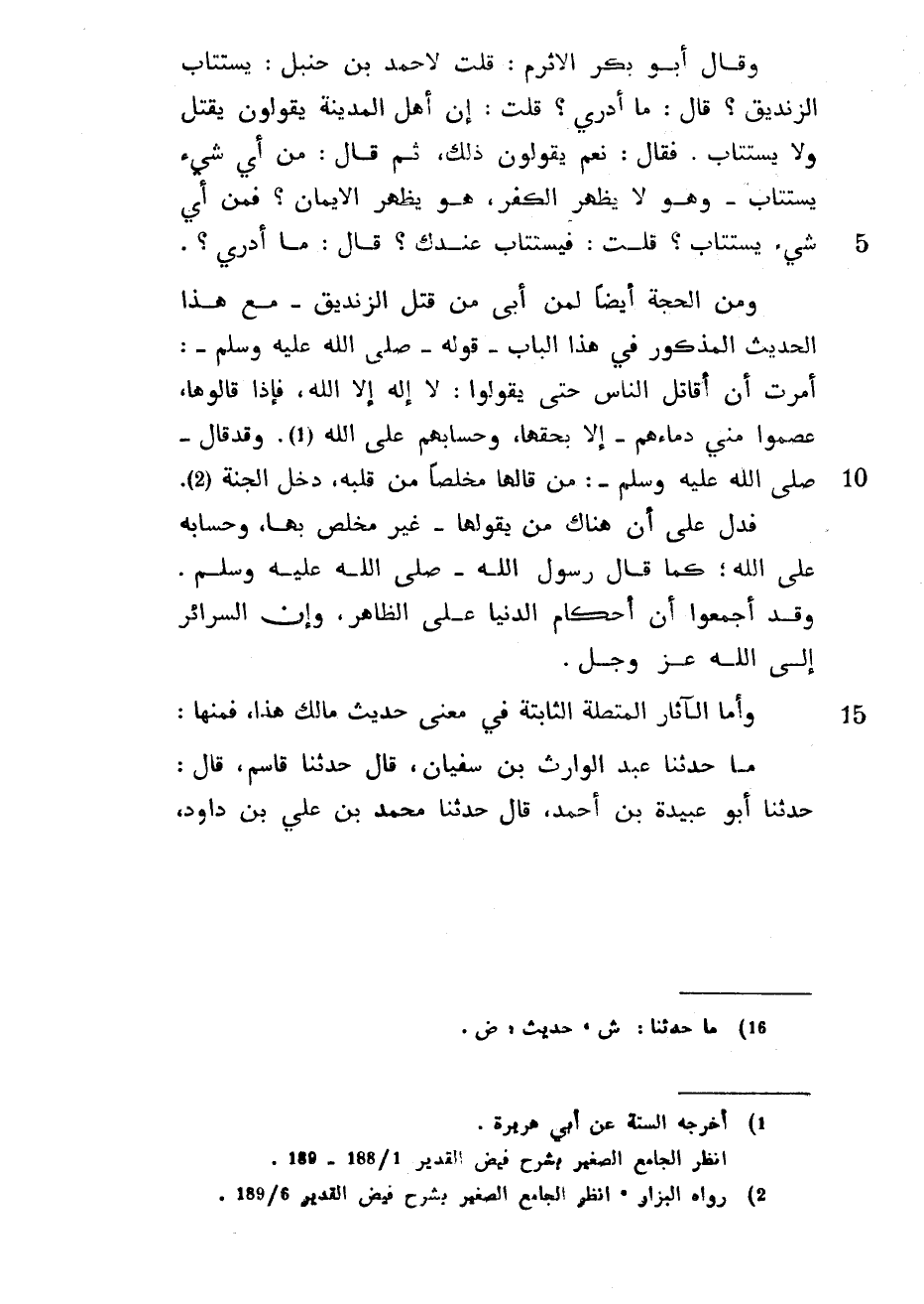 وَقَالَ أَبُو بَكْرٍ الْأَثْرَمُ قُلْتُ لِأَحْمَدَ بْنِ حَنْبَلٍ يُسْتَتَابُ الزِّنْدِيقُ قَالَ مَا أَدْرِي قُلْتُ إِنَّ أَهْلَ الْمَدِينَةِ يَقُولُونَ يُقْتَلُ وَلَا يُسْتَتَابُ فَقَالَ نَعَمْ يَقُولُونَ ذَلِكَ ثُمَّ قَالَ مِنْ أَيِّ شَيْءٍ يُسْتَتَابُ وَهُوَ لَا يُظْهِرُ الْكُفْرَ هُوَ يُظْهِرُ الْإِيمَانَ فَمِنْ أَيِّ شَيْءٍ يُسْتَتَابُ قُلْتُ فَيُسْتَتَابُ عِنْدَكَ قَالَ مَا أَدْرِي وَمِنَ الْحُجَّةِ أَيْضًا لِمَنْ أَبَى مِنْ قَتْلِ الزِّنْدِيقِ مَعَ هَذَا الْحَدِيثِ الْمَذْكُورِ فِي هَذَا الْبَابِ قَوْلُهُ صَلَّى اللَّهُ عَلَيْهِ وَسَلَّمَ أُمِرْتُ أَنْ أُقَاتِلَ النَّاسَ حَتَّى يَقُولُوا لَا إِلَهَ إِلَّا اللَّهُ فَإِذَا قَالُوهَا عَصَمُوا مِنِّي دِمَاءَهُمْ إِلَّا بِحَقِّهَا وَحِسَابُهُمْ عَلَى اللَّهِ وَقَدْ قَالَ صَلَّى اللَّهُ عَلَيْهِ وَسَلَّمَ مِنَ قَالَهَا مُخْلِصًا مِنْ قَلْبِهِ دَخَلَ الْجَنَّةَ فَدَلَّ عَلَى أَنَّ هُنَاكَ مَنْ يَقُولُهَا غَيْرَ مُخْلِصٍ بِهَا وَحِسَابُهُ عَلَى اللَّهِ كَمَا قَالَ رَسُولُ اللَّهِ صَلَّى اللَّهُ عَلَيْهِ وَسَلَّمَ وَقَدْ أَجْمَعُوا أَنَّ أَحْكَامَ الدُّنْيَا عَلَى الظَّاهِرِ وَأَنَّ السَّرَائِرَ إِلَى اللَّهِ عَزَّ وَجَلَّ وَأَمَّا الْآثَارُ الْمُتَّصِلَةُ الثَّابِتَةُ فِي مَعْنَى حَدِيثِ مَالِكٍ هَذَا فَمِنْهَا مَا حَدَّثَنَا عَبْدُ الْوَارِثِ بْنُ سُفْيَانَ قَالَ حَدَّثَنَا قَاسِمٌ قَالَ حَدَّثَنَا أَبُو عُبَيْدَةَ بْنُ أَحْمَدَ قَالَ حَدَّثَنَا مُحَمَّدُ بْنُ عَلِيِّ بْنِ دَاوُدَ
