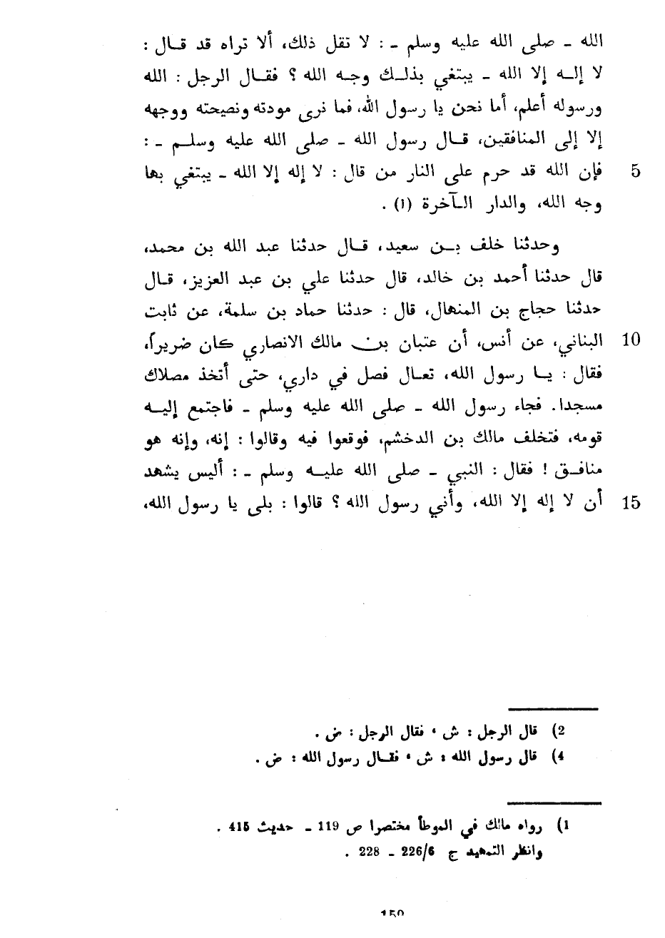 اللَّهِ صَلَّى اللَّهُ عَلَيْهِ وَسَلَّمَ لَا تَقُلْ ذَلِكَ أَلَا تَرَاهُ قَدْ قَالَ لَا إِلَهَ إِلَّا اللَّهُ يَبْتَغِي بِذَلِكَ وَجْهَ اللَّهِ فَقَالَ الرَّجُلُ اللَّهُ وَرَسُولُهُ أَعْلَمُ أَمَّا نَحْنُ يَا رَسُولَ اللَّهِ فَمَا نَرَى مَوَدَّتَهُ وَنَصِيحَتَهُ وَوَجْهَهُ إِلَّا إِلَى الْمُنَافِقِينَ قَالَ رَسُولُ اللَّهِ صَلَّى اللَّهُ عَلَيْهِ وَسَلَّمَ فَإِنَّ اللَّهَ قَدْ حَرَّمَ عَلَى النَّارِ مَنْ قَالَ لَا إِلَهَ إِلَّا اللَّهُ يَبْتَغِي بِهَا وَجْهَ اللَّهِ وَالدَّارَ الْآخِرَةَ وَحَدَّثَنَا خَلَفُ بْنُ سَعِيدٍ قَالَ حَدَّثَنَا عَبْدُ اللَّهِ بْنُ مُحَمَّدٍ قَالَ حَدَّثَنَا أَحْمَدُ بْنُ خَالِدٍ قَالَ حَدَّثَنَا عَلِيُّ بْنُ عَبْدِ الْعَزِيزِ قَالَ حَدَّثَنَا حَجَّاجُ بْنُ الْمِنْهَالِ قَالَ حَدَّثَنَا حَمَّادُ بْنُ سَلَمَةَ عَنْ ثَابِتٍ الْبُنَانِيِّ عَنْ أَنَسٍ أَنَّ عِتْبَانَ بْنَ مَالِكٍ الْأَنْصَارِيَّ كَانَ ضَرِيرًا فَقَالَ يَا رَسُولَ اللَّهِ تَعَالَ فَصَلِّ فِي دَارِي حَتَّى أَتَّخِذَ مُصَلَّاكَ مَسْجِدًا فَجَاءَ رَسُولُ اللَّهِ صَلَّى اللَّهُ عَلَيْهِ وَسَلَّمَ فَاجْتَمَعَ إِلَيْهِ قَوْمُهُ فَتَخَلَّفَ مَالِكُ بْنُ الدُّخْشُمِ فَوَقَعُوا فِيهِ وَقَالُوا إِنَّهُ وَإِنَّهُ هُوَ مُنَافِقٌ فَقَالَ النَّبِيُّ صَلَّى اللَّهُ عَلَيْهِ وَسَلَّمَ أَلَيْسَ يَشْهَدُ أَنْ لَا إِلَهَ إِلَّا اللَّهُ وَأَنِّي رَسُولُ اللَّهِ قَالُوا بَلَى يَا رَسُولَ اللَّهِ
