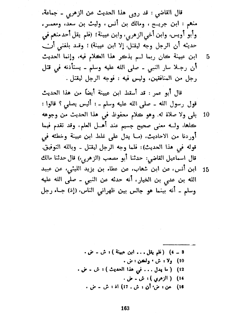قَالَ الْقَاضِي قَدْ رَوَى هَذَا الْحَدِيثَ عَنِ الزُّهْرِيِّ جَمَاعَةٌ مِنْهُمُ ابْنُ جُرَيْجٍ وَمَالِكُ بْنُ أَنَسٍ وَلَيْثُ بْنُ سَعْدٍ وَمَعْمَرٌ وَأَبُو أُوَيْسٍ وَابْنُ أَخِي الزُّهْرِيِّ وَابْنُ عُيَيْنَةَ (فَلَمْ يَقُلْ أَحَدٌ مِنْهُمْ فِي حَدِيثِهِ أَنَّ الرَّجُلَ وُجِّهَ لِيُقْتَلَ إِلَّا ابْنَ عُيَيْنَةَ) وَقَدْ بَلَغَنِي أَنَّ ابْنَ عُيَيْنَةَ كَانَ رُبَّمَا لَمْ يَذْكُرْ هَذَا الْكَلَامَ فِيهِ وَإِنَّمَا الْحَدِيثُ أَنَّ رَجُلًا سَارَّ النَّبِيَّ صَلَّى اللَّهُ عَلَيْهِ وَسَلَّمَ يَسْتَأْذِنُهُ فِي قَتْلِ رَجُلٍ مِنَ الْمُنَافِقِينَ وَلَيْسَ فِيهِ فَوُجِّهَ الرَّجُلُ لِيُقْتَلَ قَالَ أَبُو عُمَرَ قَدْ أَسْقَطَ ابْنُ عُيَيْنَةَ أَيْضًا مِنْ هَذَا الْحَدِيثِ قَوْلُ رَسُولِ اللَّهِ صَلَّى اللَّهُ عَلَيْهِ وسلم أَلَيْسَ يُصَلِّي قَالُوا بَلَى وَلَا صَلَاةَ لَهُ وَهُوَ كَلَامٌ مَحْفُوظٌ فِي هَذَا الْحَدِيثِ مِنْ وُجُوهِهِ كُلِّهَا وَلَهُ مَعْنًى صَحِيحٌ جَسِيمٌ عِنْدَ أَهْلِ الْعِلْمِ وَقَدْ تَقَدَّمَ فِيمَا أَوْرَدْنَا مِنَ الْأَحَادِيثِ (مَا يَدُلُّ عَلَى غَلَطِ ابْنِ عُيَيْنَةَ وَخَطَئِهِ فِي قَوْلِهِ فِي هَذَا الْحَدِيثِ) فَلَمَّا وُجِّهَ الرَّجُلُ لِيُقْتَلَ وَبِاللَّهِ التَّوْفِيقُ قَالَ إِسْمَاعِيلُ الْقَاضِي حَدَّثَنَا أَبُو مُصْعَبٍ (الزُّهْرِيُّ) قَالَ حَدَّثَنَا مَالِكُ بْنُ أَنَسٍ عَنِ ابْنِ شِهَابٍ عَنْ عَطَاءِ بْنِ يَزِيدَ اللَّيْثِيِّ عَنْ عُبَيْدِ اللَّهِ بْنِ عَدِيِّ بْنِ الْخِيَارِ أَنَّهُ حَدَّثَهُ عَنِ النَّبِيِّ صَلَّى اللَّهُ عَلَيْهِ وَسَلَّمَ أَنَّهُ بَيْنَمَا هُوَ جَالَسٌ بَيْنَ ظَهْرَانَيِ النَّاسِ (إِذْ) جَاءَ رَجُلٌ