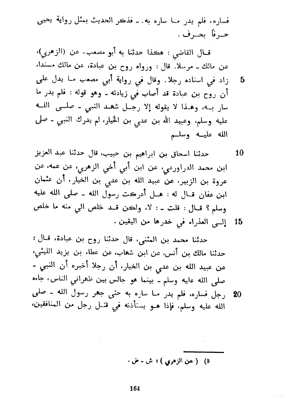 فَسَارَّهُ فَلَمْ يُدْرَ مَا سَارَّهُ بِهِ فَذَكَرَ الْحَدِيثَ بِمِثْلِ رِوَايَةِ يَحْيَى حَرْفًا بِحَرْفٍ قَالَ الْقَاضِي هَكَذَا حَدَّثَنَا بِهِ أَبُو مُصْعَبٍ عَنِ (الزُّهْرِيِّ) عَنْ مَالِكٍ مُرْسَلًا قَالَ وَرَوَاهُ رَوْحُ بْنُ عُبَادَةَ عَنْ مَالِكٍ مُسْنَدًا زَادَ فِي إِسْنَادِهِ رَجُلًا وَقَالَ فِي رِوَايَةِ أَبِي مُصْعَبٍ مَا يَدُلُّ عَلَى أَنَّ رَوْحَ بْنَ عُبَادَةَ قَدْ أَصَابَ فِي زِيَادَتِهِ وَهُوَ قَوْلُهُ فَلَمْ يُدْرَ مَا سَارَّ بِهِ وَهَذَا لَا يَقُولُهُ إِلَّا رَجُلٌ شَهِدَ النَّبِيَّ صَلَّى اللَّهُ عَلَيْهِ وَسَلَّمَ وَعُبَيْدُ اللَّهِ بْنُ عَدِيِّ بْنِ الْخِيَارِ لَمْ يُدْرِكِ النَّبِيَّ صَلَّى اللَّهُ عَلَيْهِ وَسَلَّمَ حَدَّثَنَا إِسْحَاقُ بْنُ إِبْرَاهِيمَ بْنِ حَبِيبٍ قَالَ حَدَّثَنَا عَبْدُ الْعَزِيزِ بْنُ مُحَمَّدٍ الدَّرَاوَرْدِيُّ عن ابْنِ أَبِي أَخِي الزُّهْرِيِّ عَنْ عَمِّهِ عَنْ عُرْوَةَ بْنِ الزُّبَيْرِ عَنْ عُبَيْدِ اللَّهِ بْنِ عَدِيِّ بْنِ الْخِيَارِ أَنَّ عُثْمَانَ بْنَ عَفَّانَ قَالَ لَهُ هَلْ أَدْرَكْتَ رَسُولَ اللَّهِ صَلَّى اللَّهُ عَلَيْهِ وَسَلَّمَ قَالَ قُلْتُ لَا وَلَكِنْ قَدْ خَلَصَ إِلَيَّ مِنْهُ مَا خَلَصَ إِلَى الْعَذْرَاءِ فِي خِدْرِهَا مِنَ الْيَقِينِ حَدَّثَنَا مُحَمَّدُ بْنُ الْمُثَنَّى قَالَ حَدَّثَنَا رَوْحُ بْنُ عُبَادَةَ قَالَ حَدَّثَنَا مَالِكُ بْنُ أَنَسٍ عَنِ ابْنِ شِهَابٍ عَنْ عَطَاءِ بْنِ يَزِيدَ اللَّيْثِيِّ عَنْ عُبَيْدِ اللَّهِ بْنِ عَدِيِّ بْنِ الْخِيَارِ أَنَّ رَجُلًا أَخْبَرَهُ أَنَّ النَّبِيَّ صَلَّى اللَّهُ عَلَيْهِ وَسَلَّمَ بَيْنَمَا هُوَ جَالِسٌ بين ظهراني الناس جَاءَهُ رَجُلٌ فَسَارَّهُ فَلَمْ يُدْرَ مَا سَارَّهُ بِهِ حَتَّى جَهَرَ رَسُولِ اللَّهِ صَلَّى اللَّهُ عَلَيْهِ وَسَلَّمَ فَإِذَا هُوَ يَسْتَأْذِنُهُ فِي قَتْلِ رَجُلٍ مِنَ الْمُنَافِقِينَ