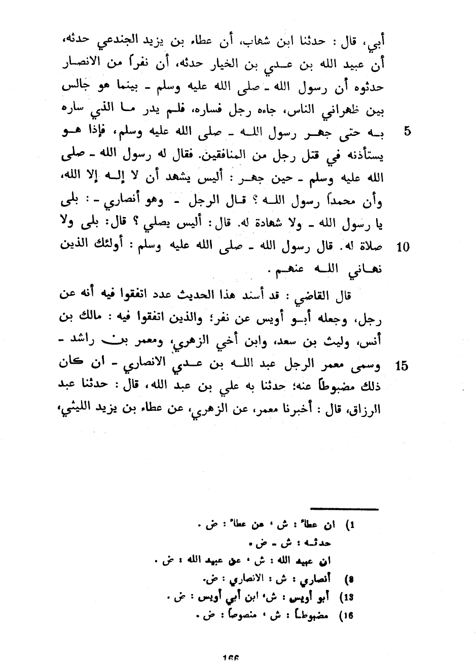أَبِي قَالَ حَدَّثَنَا ابْنُ شِهَابٍ أَنَّ عَطَاءَ بْنَ يَزِيدَ الْجَنْدَعِيَّ حَدَّثَهُ أَنَّ عُبَيْدَ اللَّهِ بْنَ عَدِيِّ بْنِ الْخِيَارِ حَدَّثَهُ أَنَّ نَفَرًا مِنَ الْأَنْصَارِ حَدَّثُوهُ أَنَّ رَسُولَ اللَّهِ صَلَّى الله عليه وسلم بينما هو جالس بين ظَهْرَانَيِ النَّاسِ جَاءَهُ رَجُلٌ فَسَارَّهُ فَلَمْ يُدْرَ مَا الَّذِي سَارَّهُ بِهِ حَتَّى جَهَرَ رَسُولِ اللَّهِ صَلَّى اللَّهُ عَلَيْهِ وَسَلَّمَ فَإِذَا هُوَ يَسْتَأْذِنُهُ فِي قَتْلِ رَجُلٍ مِنَ الْمُنَافِقِينَ فَقَالَ لَهُ رَسُولُ اللَّهِ صَلَّى اللَّهُ عَلَيْهِ وَسَلَّمَ حِينَ جَهَرَ أَلَيْسَ يَشْهَدُ أَنْ لَا إِلَهَ إِلَّا اللَّهُ وَأَنَّ مُحَمَّدًا رَسُولُ اللَّهِ قَالَ الرَّجُلُ وَهُوَ أَنْصَارِيٌّ بَلَى يَا رَسُولَ اللَّهِ وَلَا شَهَادَةَ لَهُ قَالَ أَلَيْسَ يُصَلِّي قَالَ بَلَى وَلَا صَلَاةَ لَهُ قَالَ رَسُولُ اللَّهِ صَلَّى اللَّهُ عَلَيْهِ وَسَلَّمَ أُولَئِكَ الَّذِينَ نَهَانِي اللَّهُ عَنْهُمْ قَالَ الْقَاضِي قَدْ أَسْنَدَ هَذَا الْحَدِيثَ عَدَدٌ اتَّفَقُوا فِيهِ أَنَّهُ عَنْ رَجُلٍ وَجَعَلَهُ أَبُو أُوَيْسٍ عَنْ نَفَرٍ وَالَّذِينَ اتَّفَقُوا فِيهِ مَالِكُ بْنُ أَنَسٍ وَلَيْثُ بْنُ سَعْدٍ وَابْنُ أَخِي الزُّهْرِيِّ وَمَعْمَرُ بْنُ رَاشِدٍ وَسَمَّى مَعْمَرٌ الرَّجُلَ عَبْدَ اللَّهِ بْنَ عَدِيٍّ الْأَنْصَارِيَّ إِنْ كَانَ ذَلِكَ مَضْبُوطًا عَنْهُ حَدَّثَنَا بِهِ عَلِيُّ بْنُ عَبْدِ اللَّهِ قَالَ حَدَّثَنَا عَبْدُ الرَّزَّاقِ قَالَ أَخْبَرَنَا مَعْمَرٌ عَنِ الزُّهُرِيِّ عَنْ عَطَاءِ بْنِ يَزِيدَ اللَّيْثِيِّ