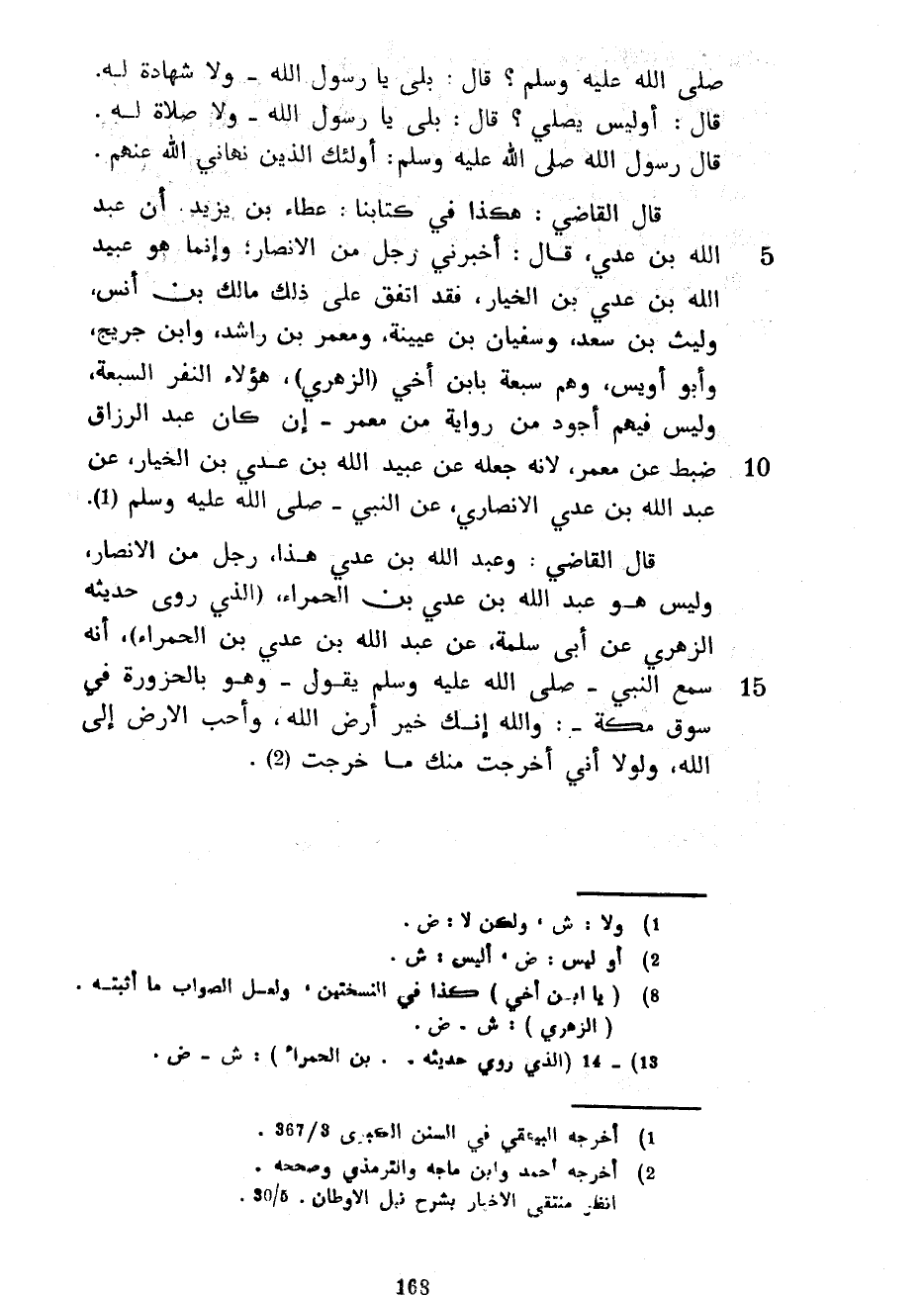 صَلَّى اللَّهُ عَلَيْهِ وَسَلَّمَ قَالَ بَلَى يَا رسول الله ولا شهادة له قال أو ليس يُصَلِّي قَالَ بَلَى يَا رَسُولَ اللَّهِ وَلَا صَلَاةَ لَهُ قَالَ رَسُولُ اللَّهِ صَلَّى اللَّهُ عَلَيْهِ وَسَلَّمَ أُولَئِكَ الَّذِينَ نَهَانِي اللَّهُ عَنْهُمْ قَالَ الْقَاضِي هَكَذَا فِي كِتَابِنَا عَطَاءُ بْنُ يَزِيدَ أَنَّ عَبْدَ اللَّهِ بْنَ عَدِيٍّ قَالَ أَخْبَرَنِي رَجُلٌ مِنَ الْأَنْصَارِ وَإِنَّمَا هُوَ عُبَيْدُ اللَّهِ بْنُ عَدِيِّ بْنِ الْخِيَارِ فَقَدِ اتَّفَقَ عَلَى ذَلِكَ مَالِكُ بْنُ أَنَسٍ وَلَيْثُ بْنُ سَعْدٍ وَسُفْيَانُ بْنُ عُيَيْنَةَ وَمَعْمَرُ بْنُ رَاشِدٍ وَابْنُ جُرَيْجٍ وَأَبُو أُوَيْسٍ وَهُمْ سَبْعَةٌ بِابْنِ أَخِي (الزُّهْرِيِّ) هَؤُلَاءِ النَّفَرُ السَّبْعَةُ وَلَيْسَ فِيهِمْ أجود من رِوَايَةً مِنْ مَعْمَرٍ إِنْ كَانَ عَبْدُ الرَّزَّاقِ ضَبَطَ عَنْ مَعْمَرٍ لِأَنَّهُ جَعَلَهُ عَنْ عُبَيْدِ اللَّهِ بْنِ عَدِيِّ بْنِ الْخِيَارِ عَنْ عَبْدِ اللَّهِ بْنِ عَدِيٍّ الْأَنْصَارِيُّ عَنِ النَّبِيِّ صَلَّى اللَّهُ عَلَيْهِ وَسَلَّمَ قَالَ الْقَاضِي وَعَبْدُ اللَّهِ بْنُ عَدِيٍّ هَذَا رَجُلٌ مِنَ الْأَنْصَارِ وَلَيْسَ هُوَ عَبْدَ اللَّهِ بْنَ عَدِيِّ بْنِ الْحَمْرَاءِ (الَّذِي رَوَى حَدِيثَهُ الزُّهْرِيِّ عَنْ أَبِي سَلَمَةَ عَنْ عَبْدِ اللَّهِ بْنِ عَدِيِّ بْنِ الْحَمْرَاءِ) أَنَّهُ سَمِعَ النَّبِيَّ صَلَّى اللَّهُ عَلَيْهِ وَسَلَّمَ يَقُولُ وَهُوَ بِالْحَزْوَرَةِ فِي سُوقِ مَكَّةَ وَاللَّهِ إِنَّكِ خَيْرُ أَرْضِ اللَّهِ وَأَحَبُّ الْأَرْضِ إِلَى اللَّهِ وَلَوْلَا أَنِّي أُخْرِجْتُ مِنْكِ مَا خَرَجْتُ