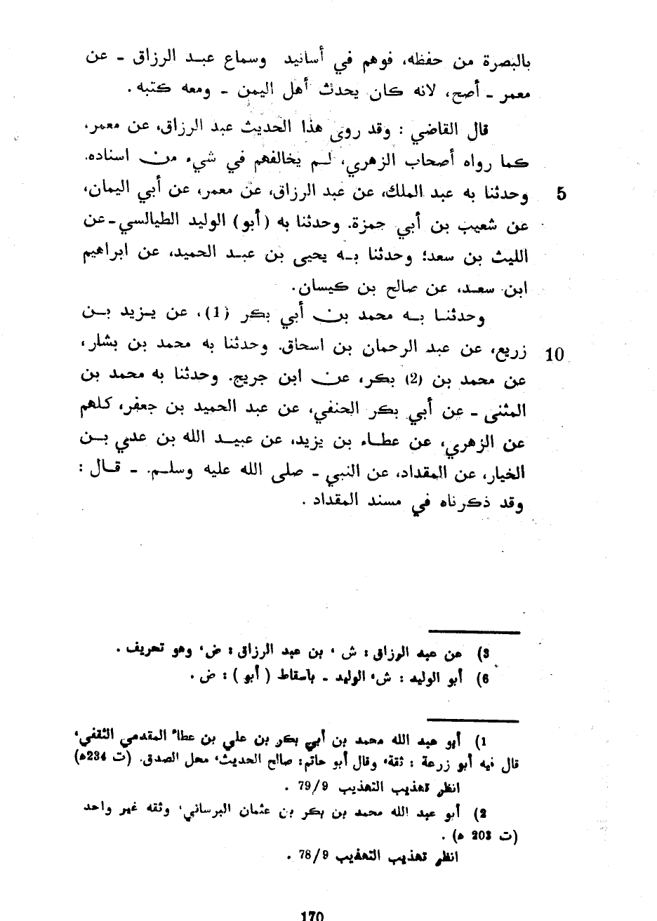 بِالْبَصْرَةِ مِنْ حِفْظِهِ فَوَهِمَ فِي أَسَانِيدَ وَسَمَاعُ عَبْدِ الرَّزَّاقِ عَنْ مَعْمَرٍ أَصَحُّ لِأَنَّهُ كَانَ يُحَدِّثُ أَهْلَ الْيَمَنِ وَمَعَهُ كُتُبُهُ قَالَ الْقَاضِي وَقَدْ رَوَى هَذَا الْحَدِيثَ عَبْدُ الرَّزَّاقِ عَنْ مَعْمَرٍ كَمَا رَوَاهُ أَصْحَابُ الزُّهْرِيِّ لَمْ يُخَالِفْهُمْ فِي شَيْءٍ مِنْ إِسْنَادِهِ وَحَدَّثَنَا بِهِ عَبْدُ الْمَلِكِ عَنْ عَبْدِ الرَّزَّاقِ عَنْ مَعْمَرٍ عَنْ أَبِي الْيَمَانِ عَنْ شُعَيْبِ بْنِ أَبِي حَمْزَةَ وَحَدَّثَنَا بِهِ (أَبُو) الْوَلِيدِ الطَّيَالِسِيُّ عَنِ اللَّيْثِ بْنِ سَعْدٍ وَحَدَّثَنَا بِهِ يَحْيَى بْنُ عَبْدِ الْحَمِيدِ عَنْ إِبْرَاهِيمَ بْنِ سَعْدٍ عَنْ صَالِحِ بْنِ كَيْسَانَ وَحَدَّثَنَا بِهِ مُحَمَّدُ بْنُ أَبِي بَكْرٍ عَنْ يَزِيدَ بْنِ زُرَيْعٍ عَنْ عَبْدِ الرحمان بْنِ إِسْحَاقَ وَحَدَّثَنَا بِهِ مُحَمَّدُ بْنُ بَشَّارٍ عَنْ مُحَمَّدِ بْنِ بَكْرٍ عَنِ ابْنِ جُرَيْجٍ وَحَدَّثَنَا بِهِ مُحَمَّدُ بْنُ الْمُثَنَّى عَنْ أَبِي بَكْرٍ الْحَنَفِيِّ عَنْ عَبْدِ الْحَمِيدِ بْنِ جَعْفَرٍ كُلُّهُمْ عَنِ الزُّهْرِيِّ عَنْ عَطَاءِ بْنِ يَزِيدَ عَنْ عُبَيْدِ اللَّهِ بْنِ عَدِيِّ بْنِ الْخِيَارِ عَنِ الْمِقْدَادِ عَنِ النَّبِيِّ صَلَّى اللَّهُ عَلَيْهِ وَسَلَّمَ قَالَ وَقَدْ ذَكَرْنَاهُ فِي مُسْنَدِ الْمِقْدَادِ