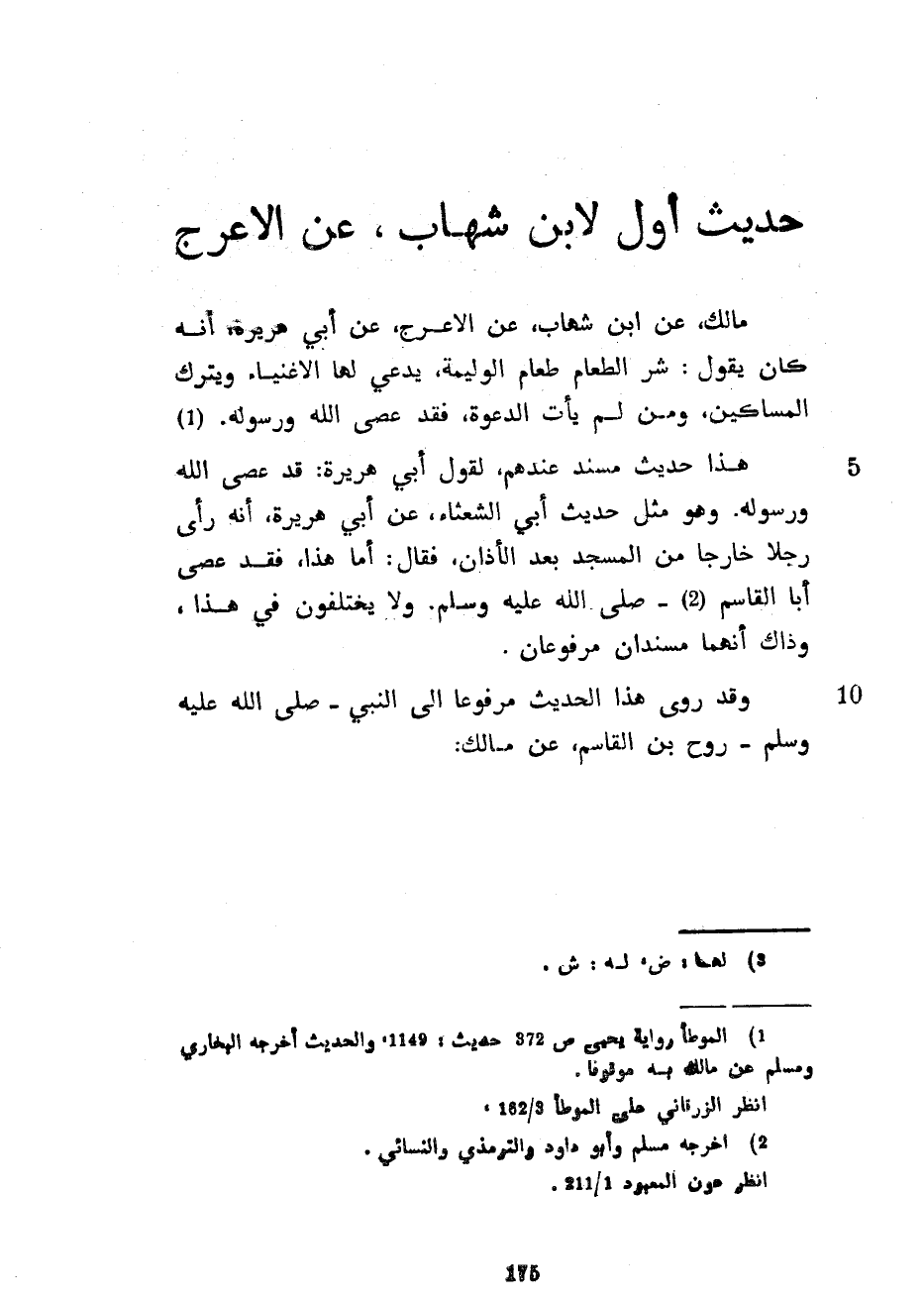 حَدِيثٌ أَوَّلُ لِابْنِ شِهَابٍ عَنِ الْأَعْرَجِ مَالِكٌ عَنِ ابْنِ شِهَابٍ عَنِ الْأَعْرَجِ عَنْ أَبِي هُرَيْرَةَ أَنَّهُ كَانَ يَقُولُ شَرُّ الطَّعَامِ طَعَامُ الْوَلِيمَةِ يُدْعَى لَهَا الْأَغْنِيَاءُ وَيُتْرَكُ الْمَسَاكِينُ وَمَنْ لَمْ يَأْتِ الدَّعْوَةَ فَقَدْ عَصَى اللَّهَ وَرَسُولَهُ هَذَا حَدِيثٌ مُسْنَدٌ عِنْدَهُمْ لِقَوْلِ أَبِي هُرَيْرَةَ قَدْ عَصَى اللَّهَ وَرَسُولَهُ وَهُوَ مِثْلُ حَدِيثِ أَبِي الشَّعْثَاءِ عَنْ أَبِي هُرَيْرَةَ أَنَّهُ رَأَى رَجُلًا خَارِجًا مِنَ الْمَسْجِدِ بَعْدَ الْأَذَانِ فَقَالَ أَمَّا هَذَا فَقَدْ عَصَى أَبَا الْقَاسِمِ صَلَّى اللَّهُ عَلَيْهِ وَسَلَّمَ وَلَا يَخْتَلِفُونَ فِي هَذَا وَذَاكَ أَنَّهُمَا مُسْنَدَانِ مَرْفُوعَانِ وَقَدْ رَوَى هَذَا الْحَدِيثَ مَرْفُوعًا إِلَى النَّبِيِّ صَلَّى اللَّهُ عَلَيْهِ وَسَلَّمَ رَوْحُ بْنُ الْقَاسِمِ عَنْ مَالِكٍ