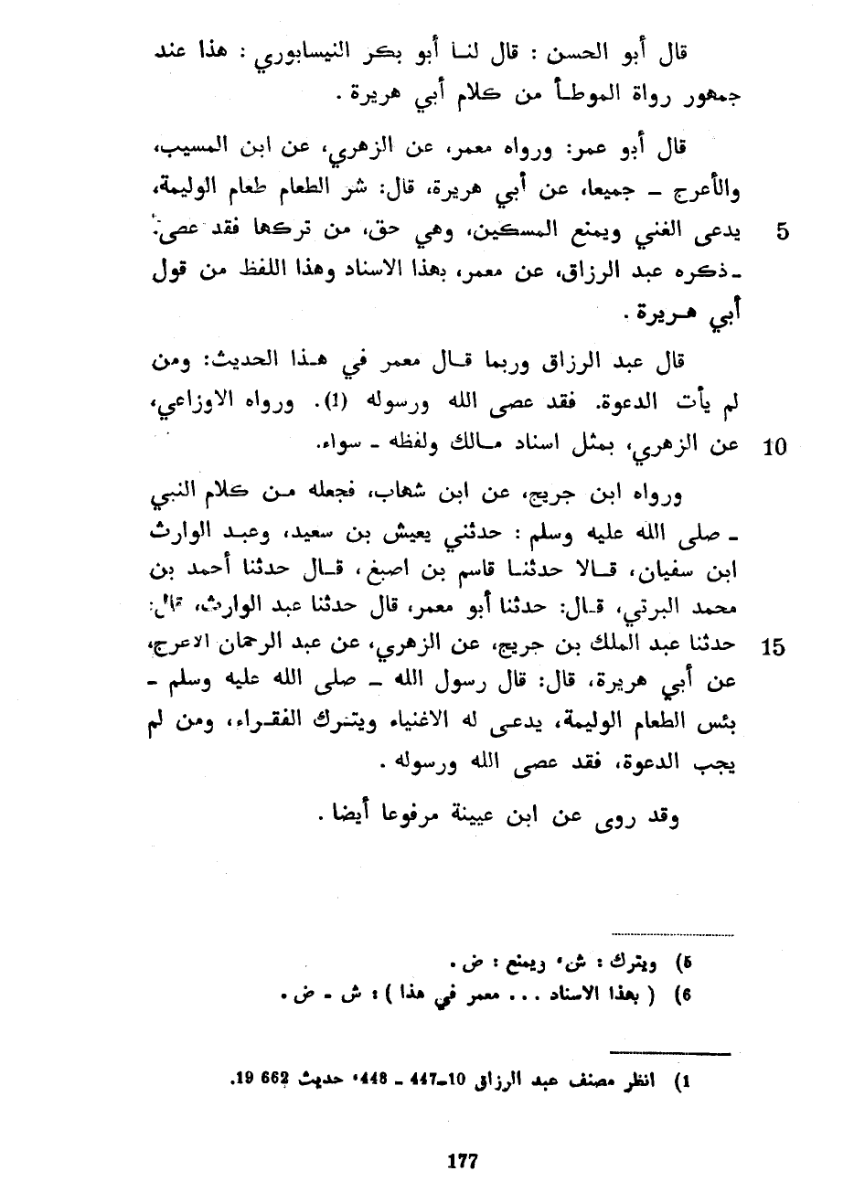 قَالَ أَبُو الْحَسَنِ قَالَ لَنَا أَبُو بَكْرٍ النَّيْسَابُورِيُّ هَذَا عِنْدَ جُمْهُورِ رُوَاةِ الْمُوَطَّأِ مِنْ كَلَامِ أَبِي هُرَيْرَةَ قَالَ أَبُو عُمَرَ وَرَوَاهُ مَعْمَرٌ عَنِ الزُّهْرِيِّ عَنِ ابْنِ الْمُسَيَّبِ وَالْأَعْرَجِ جَمِيعًا عَنْ أَبِي هُرَيْرَةَ قَالَ شَرُّ الطَّعَامِ طَعَامُ الْوَلِيمَةِ يُدْعَى الْغَنِيُّ وَيُمْنَعُ الْمِسْكِينُ وَهِيَ حَقٌّ مَنْ تَرَكَهَا فَقَدْ عَصَى ذَكَرَهُ عَبْدُ الرَّزَّاقِ عَنْ مَعْمَرٍ بِهَذَا الْإِسْنَادِ وَهَذَا اللَّفْظُ مِنْ قَوْلِ أَبِي هُرَيْرَةَ قَالَ عَبْدُ الرَّزَّاقِ وَرُبَّمَا قَالَ مَعْمَرٌ فِي هَذَا الْحَدِيثِ وَمَنْ لَمْ يَأْتِ الدَّعْوَةَ فَقَدْ عَصَى اللَّهَ وَرَسُولَهُ وَرَوَاهُ الْأَوْزَاعِيُّ عَنِ الزُّهْرِيِّ بِمِثْلِ إِسْنَادِ مَالِكٍ وَلَفْظِهِ سَوَاءً وَرَوَاهُ ابْنُ جُرَيْجٍ عَنِ ابْنِ شِهَابٍ فَجَعَلَهُ مِنْ كَلَامِ النَّبِيِّ صَلَّى اللَّهُ عَلَيْهِ وَسَلَّمَ حَدَّثَنِي يَعِيشُ بْنُ سَعِيدٍ وَعَبْدُ الْوَارِثِ بْنُ سُفْيَانَ قَالَا حَدَّثَنَا قَاسِمُ بْنُ أَصْبَغَ قَالَ حَدَّثَنَا أَحْمَدُ بْنُ مُحَمَّدٍ الْبِرْتِيُّ قَالَ حَدَّثَنَا أَبُو مَعْمَرٍ قَالَ حَدَّثَنَا عَبْدُ الْوَارِثِ قَالَ حَدَّثَنَا عَبْدُ الْمَلِكِ بْنُ جُرَيْجٍ عن الزهري عن عبد الرحمان الْأَعْرَجِ عَنْ أَبِي هُرَيْرَةَ قَالَ قَالَ رَسُولُ اللَّهِ صَلَّى اللَّهُ عَلَيْهِ وَسَلَّمَ بِئْسَ الطَّعَامُ الْوَلِيمَةُ يُدْعَى لَهُ الْأَغْنِيَاءُ وَيُتْرَكُ الْفُقَرَاءُ وَمَنْ لَمْ يُجِبِ الدَّعْوَةَ فَقَدْ عَصَى اللَّهَ وَرَسُولَهُ وَقَدْ رُوِيَ عَنِ ابْنِ عُيَيْنَةَ مَرْفُوعًا أَيْضًا