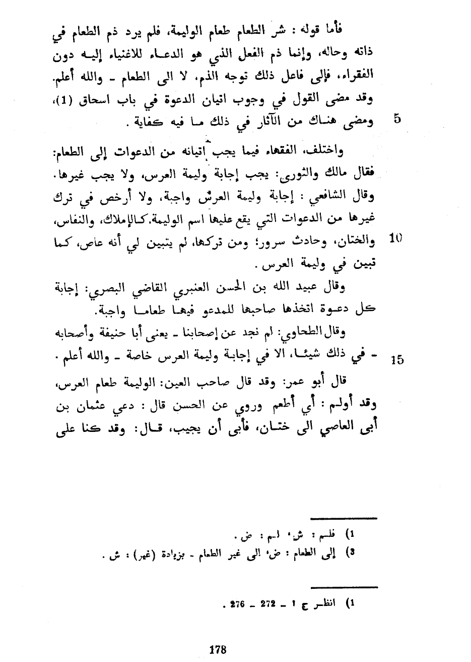 فَأَمَّا قَوْلُهُ شَرُّ الطَّعَامِ طَعَامُ الْوَلِيمَةِ فَلَمْ يُرِدْ ذَمَّ الطَّعَامِ فِي ذَاتِهِ وَحَالِهِ وَإِنَّمَا ذَمَّ الْفِعْلِ الَّذِي هُوَ الدُّعَاءُ لِلْأَغْنِيَاءِ إِلَيْهِ دُونَ الْفُقَرَاءِ فَإِلَى فَاعِلِ ذَلِكَ تَوَجَّهَ الذَّمُّ لَا إِلَى الطَّعَامِ وَاللَّهُ أَعْلَمُ وَقَدْ مَضَى الْقَوْلُ فِي وُجُوبِ إِتْيَانِ الدَّعْوَةِ فِي بَابِ إِسْحَاقَ وَمَضَى هُنَاكَ مِنَ الْآثَارِ فِي ذَلِكَ مَا فِيهِ كِفَايَةٌ وَاخْتَلَفَ الْفُقَهَاءُ فِيمَا يَجِبُ إِتْيَانُهُ مِنَ الدَّعَوَاتِ إِلَى الطَّعَامِ فَقَالَ مَالِكٌ وَالثَّوْرِيُّ يَجِبُ إِجَابَةُ وَلِيمَةِ الْعُرْسِ وَلَا يَجِبُ غَيْرُهَا وَقَالَ الشَّافِعِيُّ إِجَابَةُ وَلِيمَةِ الْعُرْسِ وَاجِبَةٌ وَلَا أُرَخِّصُ فِي تَرْكِ غَيْرِهَا مِنَ الدَّعَوَاتِ الَّتِي يَقَعُ عَلَيْهَا اسْمُ الْوَلِيمَةِ كَالْإِمْلَاكِ وَالنِّفَاسِ وَالْخِتَانِ وَحَادِثِ سُرُورٍ وَمَنْ تَرَكَهَا لَمْ يَتَبَيَّنْ لِي أَنَّهُ عَاصٍ كَمَا تَبَيَّنَ فِي وَلِيمَةِ العرس وقال عبيد الله بن الحسن العنبري الْقَاضِي الْبَصْرِيُّ إِجَابَةُ كُلِّ دَعْوَةٍ اتَّخَذَهَا صَاحِبُهَا لِلْمَدْعُوِّ فِيهَا طَعَامًا وَاجِبَةٌ وَقَالَ الطَّحَاوِيُّ لَمْ نَجِدْ عَنْ أَصْحَابِنَا يَعْنِي أَبَا حَنَفِيَّةَ وَأَصْحَابَهُ فِي ذَلِكَ شَيْئًا إِلَّا فِي إِجَابَةِ وَلِيمَةِ الْعُرْسِ خَاصَّةً وَاللَّهُ أَعْلَمُ قَالَ أَبُو عُمَرَ وَقَدْ قَالَ صَاحِبُ الْعَيْنِ الْوَلِيمَةُ طَعَامُ الْعُرْسِ وَقَدْ أَوْلَمَ أَيْ أَطْعَمَ وَرُوِيَ عَنِ الْحَسَنِ قَالَ دُعِيَ عُثْمَانُ بْنُ أَبِي الْعَاصِي إِلَى خِتَانٍ فَأَبَى أَنْ يُجِيبَ قَالَ وَقَدْ كُنَّا على