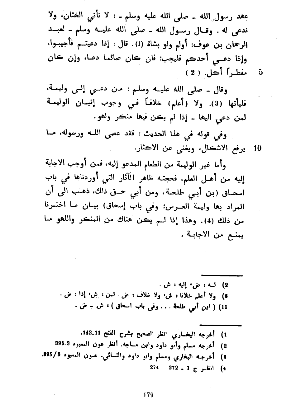 عَهْدِ رَسُولِ اللَّهِ صَلَّى اللَّهُ عَلَيْهِ وَسَلَّمَ لَا نَأْتِي الْخِتَانَ وَلَا نُدْعَى لَهُ وَقَالَ رَسُولُ اللَّهِ صَلَّى اللَّهُ عَلَيْهِ وَسَلَّمَ لِعَبْدِ الرحمان بْنِ عَوْفٍ أَوْلِمْ وَلَوْ بِشَاةٍ قَالَ إِذَا دُعِيتُمْ فَأَجِيبُوا وَإِذَا دُعِيَ أَحَدُكُمْ فَلْيُجِبْ فَإِنْ كَانَ صَائِمًا دَعَا وَإِنْ كَانَ مُفْطِرًا أَكَلَ وَقَالَ صَلَّى اللَّهُ عَلَيْهِ وَسَلَّمَ مَنْ دُعِيَ إِلَى وَلِيمَةٍ فَلْيَأْتِهَا وَلَا (أَعْلَمُ) خِلَافًا فِي وُجُوبِ إِتْيَانِ الْوَلِيمَةِ لِمَنْ دُعِيَ إِلَيْهَا إِذَا لَمْ يَكُنْ فِيهَا مُنْكَرٌ وَلَهْوٌ وَفِي قَوْلِهِ فِي هَذَا الْحَدِيثِ فَقَدْ عَصَى اللَّهَ وَرَسُولَهُ مَا يَرْفَعُ الْإِشْكَالَ وَيُغْنِي عَنِ الْإِكْثَارِ وَأَمَّا غَيْرُ الْوَلِيمَةِ مِنَ الطَّعَامِ الْمَدْعُوِّ إِلَيْهِ فَمَنْ أَوْجَبَ الْإِجَابَةَ إِلَيْهِ مِنْ أَهْلِ الْعِلْمِ فَحُجَّتُهُ ظَاهِرُ الْآثَارِ الَّتِي أَوْرَدْنَاهَا فِي بَابِ إِسْحَاقَ (بْنِ أَبِي طَلْحَةَ وَمَنْ أَبَى حَقَّ ذَلِكَ ذهب إلى أن المراد بها وليمةالعرس وَفِي بَابِ إِسْحَاقَ) بَيَانُ مَا اخْتَرْنَا مِنْ ذَلِكَ وَهَذَا إِذَا لَمْ يَكُنْ هُنَاكَ مِنَ الْمُنْكَرِ وَاللَّهْوِ مَا يَمْنَعُ مِنَ الْإِجَابَةِ