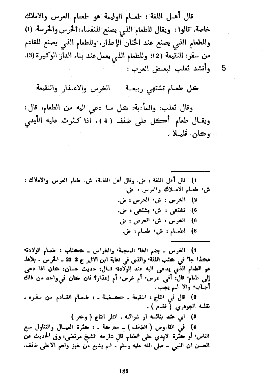 قَالَ أَهْلُ اللُّغَةِ طَعَامُ الْوَلِيمَةِ هُوَ طَعَامُ الْعُرْسِ وَالْإِمْلَاكِ خَاصَّةً قَالُوا وَيُقَالُ لِلطَّعَامِ الَّذِي يُصْنَعُ لِلنُّفَسَاءِ الْخُرْسُ وَالْخُرْسَةُ وَلِلطَّعَامِ الَّذِي يُصْنَعُ عِنْدَ الْخِتَانِ الْإِعْذَارُ وَلِلطَّعَامِ الَّذِي يُصْنَعُ لِلْقَادِمِ مِنْ سَفَرٍ النَّقِيعَةُ وَلِلطَّعَامِ الَّذِي يُعْمَلُ عِنْدَ بِنَاءِ الدَّارِ الْوَكِيرَةُ وَأَنْشَدَ ثَعْلَبٌ لِبَعْضِ الْعَرَبِ ... كُلُّ طَعَامٍ تَشْتَهِي رَبِيعَةُ ... الْخُرْسُ وَالْإِعْذَارُ وَالنَّقِيعَةُ ... وَقَالَ ثَعْلَبٌ وَالْمَأْدُبَةُ كُلُّ مَا دُعِيَ إِلَيْهِ مِنَ الطَّعَامِ قَالَ وَيُقَالُ طَعَامٌ أُكِلَ عَلَى ضَفَفٍ إِذَا كَثُرَتْ عَلَيْهِ الْأَيْدِي وَكَانَ قَلِيلًا