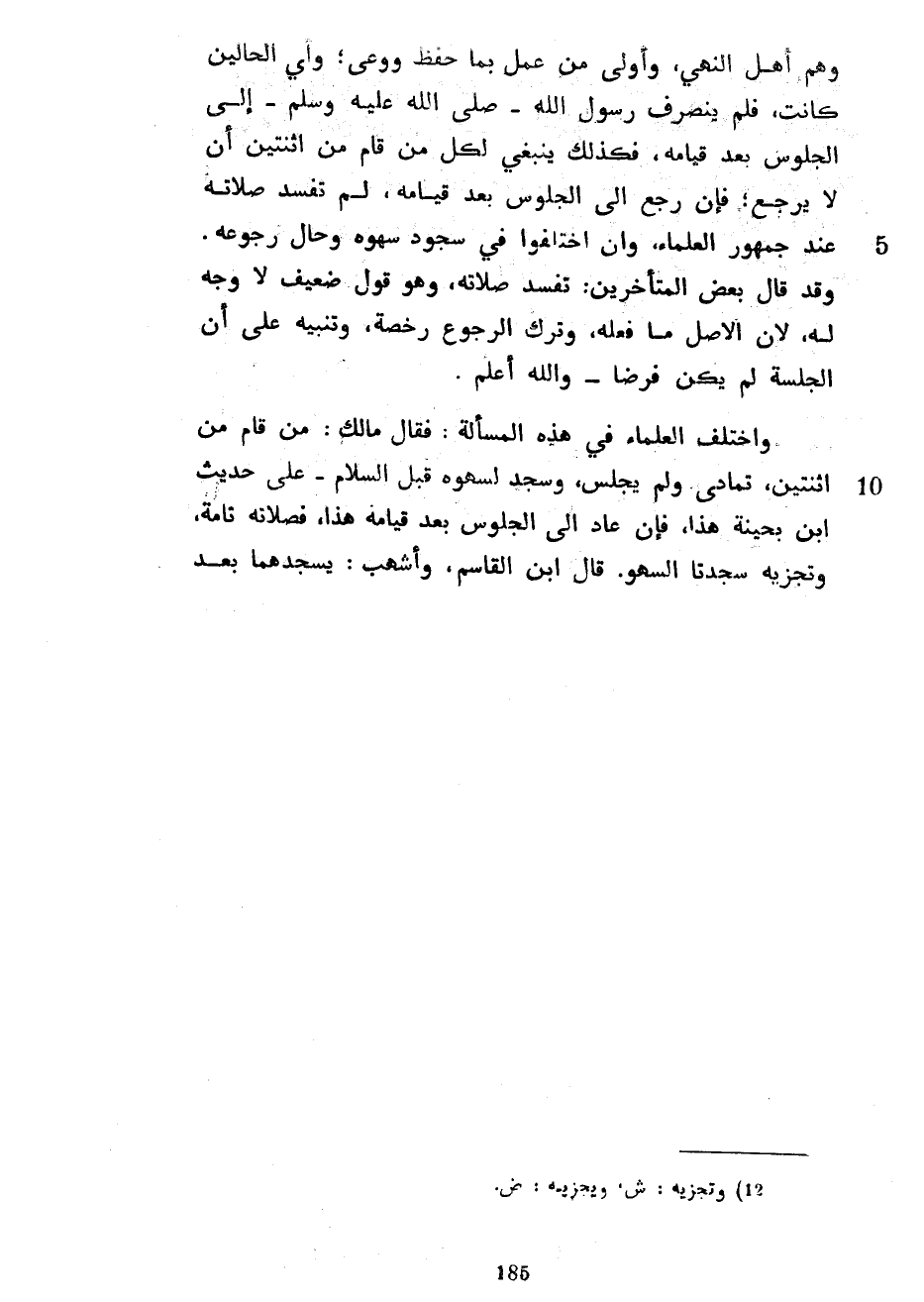 وَهُمْ أَهْلُ النُّهَى وَأَوْلَى مَنْ عَمِلَ بِمَا حَفِظَ وَوَعَى وَأَيُّ الْحَالَيْنِ كَانَتْ فَلَمْ يَنْصَرِفْ رَسُولُ اللَّهِ صَلَّى اللَّهُ عَلَيْهِ وَسَلَّمَ إِلَى الْجُلُوسِ بَعْدَ قِيَامِهِ فَكَذَلِكَ يَنْبَغِي لِكُلِّ مَنْ قَامَ مِنِ اثْنَتَيْنِ أَنْ لَا يَرْجِعَ فَإِنْ رَجَعَ إِلَى الْجُلُوسِ بَعْدَ قِيَامِهِ لَمْ تَفْسُدْ صَلَاتُهُ عِنْدَ جُمْهُورِ الْعُلَمَاءِ وَإِنِ اخْتَلَفُوا فِي سُجُودِ سَهْوِهِ وَحَالِ رُجُوعِهِ وَقَدْ قَالَ بَعْضُ الْمُتَأَخِّرِينَ تَفْسُدُ صَلَاتُهُ وَهُوَ قَوْلٌ ضَعِيفٌ لَا وَجْهَ لَهُ لِأَنَّ الْأَصْلَ مَا فَعَلَهُ وَتَرْكُ الرُّجُوعِ رُخْصَةٌ وَتَنْبِيهٌ عَلَى أَنَّ الْجَلْسَةَ لَمْ يكن فَرْضًا وَاللَّهُ أَعْلَمُ وَاخْتَلَفَ الْعُلَمَاءُ فِي هَذِهِ الْمَسْأَلَةِ فَقَالَ مَالِكٌ مَنْ قَامَ مِنِ اثْنَتَيْنِ تَمَادَى وَلَمْ يَجْلِسْ وَسَجَدَ لِسَهْوِهِ قَبْلَ السَّلَامِ عَلَى حَدِيثِ ابْنِ بُحَيْنَةَ هَذَا فَإِنْ عَادَ إِلَى الْجُلُوسِ بَعْدَ قِيَامِهِ هَذَا فَصَلَاتُهُ تَامَّةٌ وَتُجْزِيهِ سَجْدَتَا السَّهْوِ قَالَ ابْنُ الْقَاسِمِ وَأَشْهَبُ يسجدهما بعد