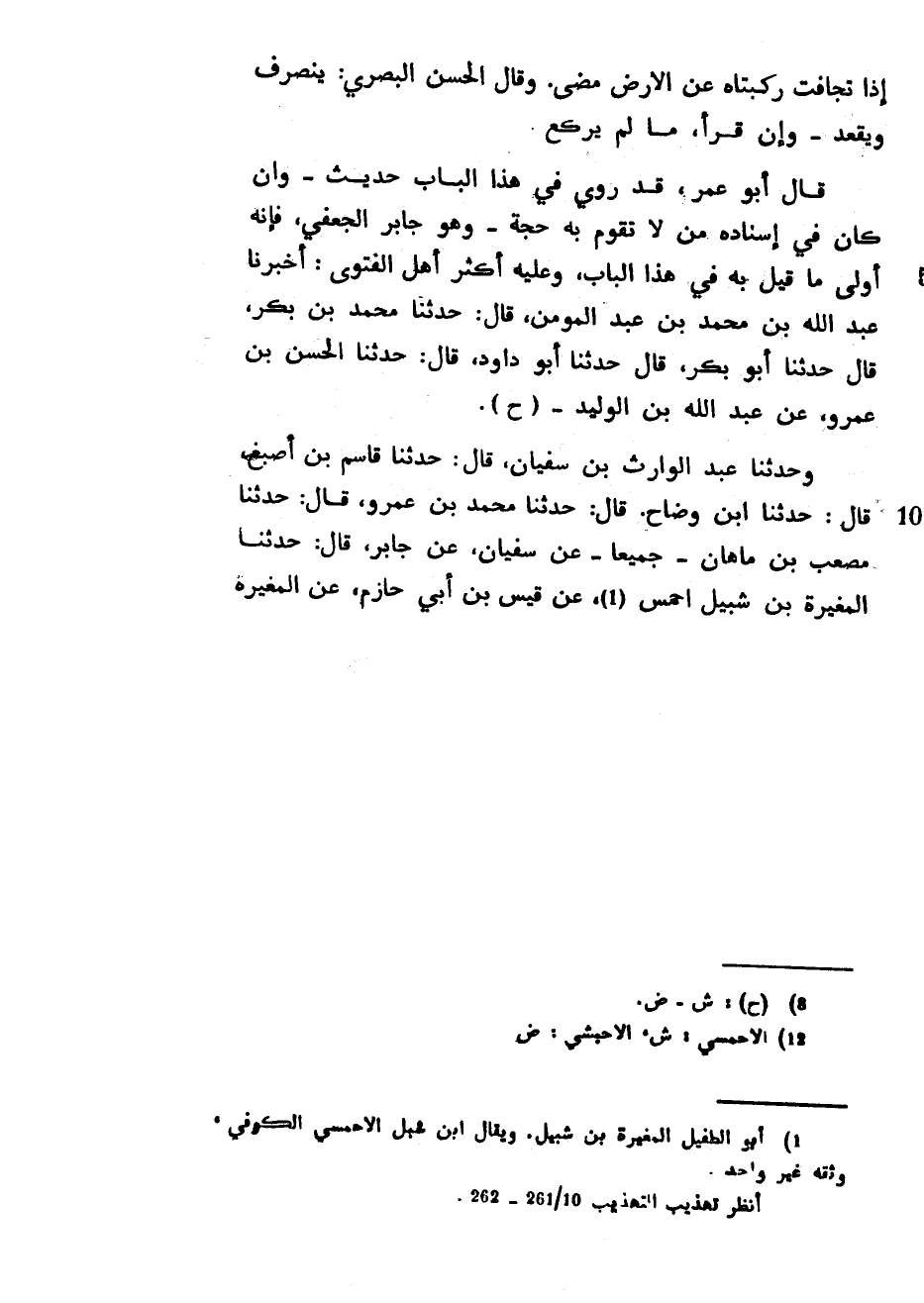 إِذَا تَجَافَتْ رُكْبَتَاهُ عَنِ الْأَرْضِ مَضَى وَقَالَ الْحَسَنُ الْبَصْرِيُّ يَنْصَرِفُ وَيَقْعُدُ وَإِنْ قَرَأَ مَا لَمْ يَرْكَعْ قَالَ أَبُو عُمَرَ قَدْ رُوِيَ فِي هَذَا الْبَابِ حَدِيثٌ وَإِنْ كَانَ فِي إِسْنَادِهِ مَنْ لَا تَقُومُ بِهِ حُجَّةٌ وَهُوَ جَابِرٌ الْجُعْفِيُّ فَإِنَّهُ أَوْلَى مَا قِيلَ بِهِ فِي هَذَا الْبَابِ وَعَلَيْهِ أَكْثَرُ أَهْلِ الْفَتْوَى أَخْبَرَنَا عَبْدُ اللَّهِ بْنُ مُحَمَّدِ بْنِ عَبْدِ الْمُؤْمِنِ قَالَ حَدَّثَنَا مُحَمَّدُ بْنُ بَكْرٍ قَالَ حَدَّثَنَا أَبُو بَكْرٍ قَالَ حَدَّثَنَا أَبُو دَاوُدَ قَالَ حَدَّثَنَا الْحَسَنُ بْنُ عَمْرٍو عَنْ عَبْدِ الله بن الوليد وَحَدَّثَنَا عَبْدُ الْوَارِثِ بْنُ سُفْيَانَ قَالَ حَدَّثَنَا قَاسِمُ بْنُ أَصْبَغَ قَالَ حَدَّثَنَا ابْنُ وَضَّاحٍ قَالَ حَدَّثَنَا مُحَمَّدُ بْنُ عَمْرٍو قَالَ حَدَّثَنَا مُصْعَبُ بْنُ مَاهَانَ جَمِيعًا عَنْ سُفْيَانَ عَنْ جَابِرٍ قَالَ حَدَّثَنَا الْمُغِيرَةُ بْنُ شُبَيْلٍ أَحْمَسُ عَنْ قَيْسِ بْنِ أَبِي حَازِمٍ عَنِ الْمُغِيرَةِ