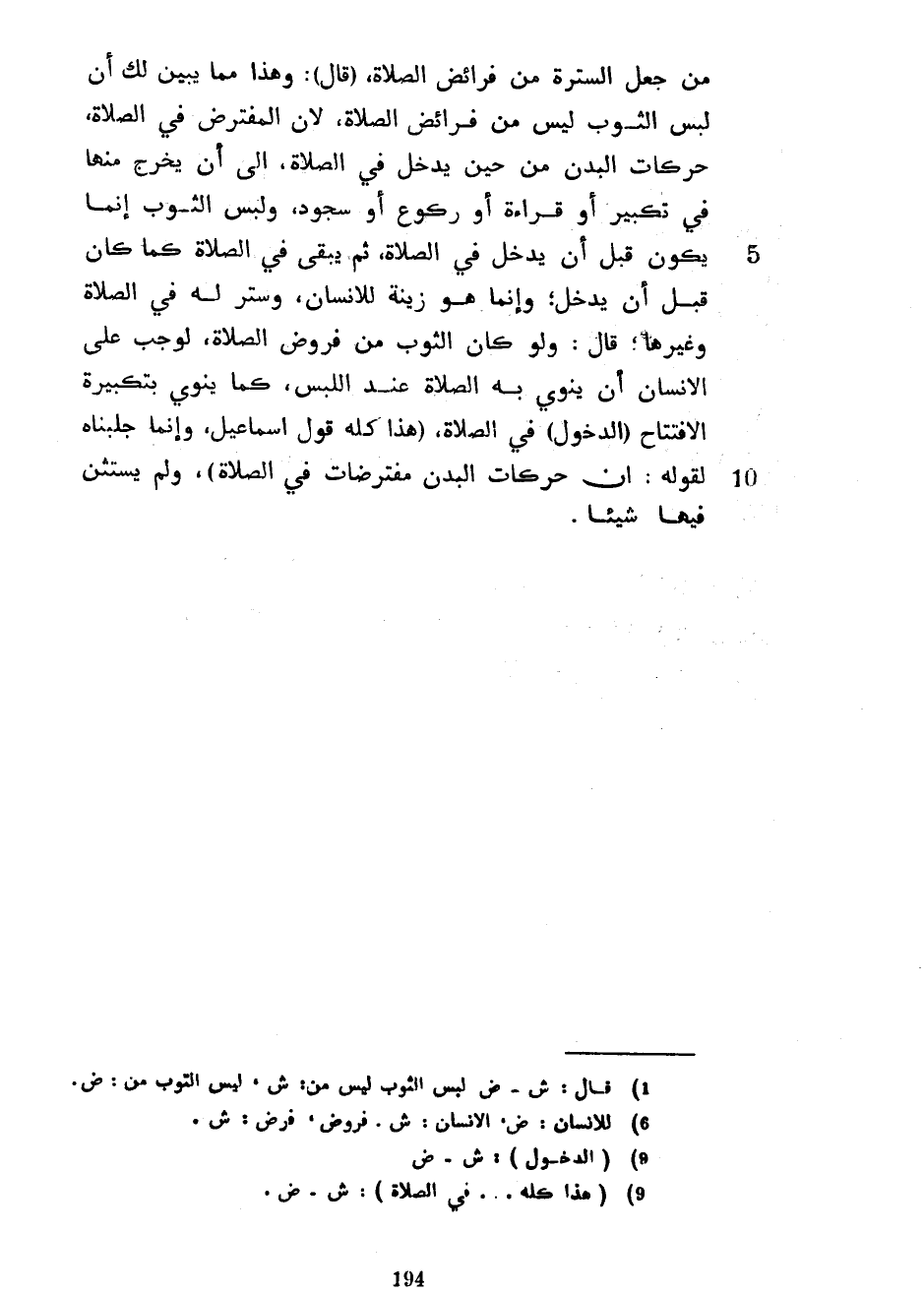 مَنْ جَعَلَ السُّتْرَةَ مِنْ فَرَائِضِ الصَّلَاةِ (قَالَ) وَهَذَا مِمَّا يُبَيِّنُ لَكَ أَنَّ لُبْسَ الثَّوْبِ لَيْسَ مِنْ فَرَائِضِ الصَّلَاةِ لِأَنَّ الْمُفْتَرَضَ فِي الصَّلَاةِ حَرَكَاتُ الْبَدَنِ مِنْ حِينِ يَدْخُلُ فِي الصَّلَاةِ إِلَى أَنْ يَخْرُجَ مِنْهَا فِي تَكْبِيرٍ أَوْ قِرَاءَةٍ أَوْ رُكُوعٍ أَوْ سُجُودٍ وَلُبْسُ الثَّوْبِ إِنَّمَا يَكُونُ قَبْلَ أَنْ يَدْخُلَ فِي الصَّلَاةِ ثُمَّ يَبْقَى فِي الصَّلَاةِ كَمَا كَانَ قَبْلَ أَنْ يَدْخُلَ وَإِنَّمَا هُوَ زِينَةٌ لِلْإِنْسَانِ وَسِتْرٌ لَهُ فِي الصَّلَاةِ وَغَيْرِهَا قَالَ وَلَوْ كَانَ الثَّوْبُ مِنْ فُرُوضِ الصَّلَاةِ لَوَجَبَ عَلَى الْإِنْسَانِ أَنْ يَنْوِيَ بِهِ الصَّلَاةَ عِنْدَ اللُّبْسِ كَمَا يَنْوِي بِتَكْبِيرَةِ الِافْتِتَاحِ (الدُّخُولَ) فِي الصَّلَاةِ (هَذَا كُلُّهُ قَوْلُ إِسْمَاعِيلَ وَإِنَّمَا جَلَبْنَاهُ لِقَوْلِهِ إِنَّ حَرَكَاتِ الْبَدَنِ مُفْتَرَضَاتٌ فِي الصَّلَاةِ) وَلَمْ يَسْتَثْنِ فِيهَا شَيْئًا