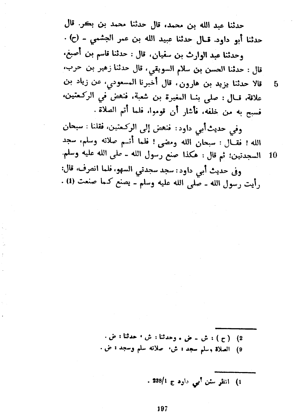 حَدَّثَنَا عَبْدُ اللَّهِ بْنُ مُحَمَّدٍ قَالَ حَدَّثَنَا مُحَمَّدُ بْنُ بَكْرٍ قَالَ حَدَّثَنَا أَبُو دَاوُدَ قَالَ حَدَّثَنَا عُبَيْدُ اللَّهِ بْنُ عُمَرَ الْجُشَمِيُّ وَحَدَّثَنَا عَبْدُ الْوَارِثِ بْنُ سُفْيَانَ قَالَ حَدَّثَنَا قَاسِمُ بْنُ أَصْبَغَ قَالَ حَدَّثَنَا الْحَسَنُ بْنُ سَلَّامٍ السُّوَيْقِيُّ قَالَ حَدَّثَنَا زُهَيْرُ بْنُ حَرْبٍ قَالَا حَدَّثَنَا يَزِيدُ بْنُ هَارُونَ قَالَ أَخْبَرَنَا الْمَسْعُودِيُّ عَنْ زِيَادِ بْنِ عِلَاقَةَ قَالَ صَلَّى بِنَا الْمُغِيرَةُ بْنُ شُعْبَةَ فَنَهَضَ فِي الرَّكْعَتَيْنِ فَسَبَّحَ بِهِ مَنْ خَلْفَهُ فَأَشَارَ أَنْ قُومُوا فَلَمَّا أَتَمَّ الصَّلَاةَ وَفِي حَدِيثِ أَبِي دَاوُدَ فَنَهَضَ إِلَى الرَّكْعَتَيْنِ فَقُلْنَا سُبْحَانَ اللَّهِ فَقَالَ سُبْحَانَ اللَّهِ وَمَضَى فَلَمَّا أَتَمَّ صَلَاتَهُ وَسَلَّمَ سَجَدَ السَّجْدَتَيْنِ ثُمَّ قَالَ هَكَذَا صَنَعَ رَسُولُ اللَّهِ صَلَّى اللَّهُ عَلَيْهِ وَسَلَّمَ وَفِي حَدِيثِ أَبِي دَاوُدَ سَجَدَ سَجْدَتَيِ السَّهْوِ فَلَمَّا انْصَرَفَ قَالَ رَأَيْتُ رَسُولَ اللَّهِ صَلَّى اللَّهُ عَلَيْهِ وَسَلَّمَ يَصْنَعُ كَمَا صَنَعْتُ