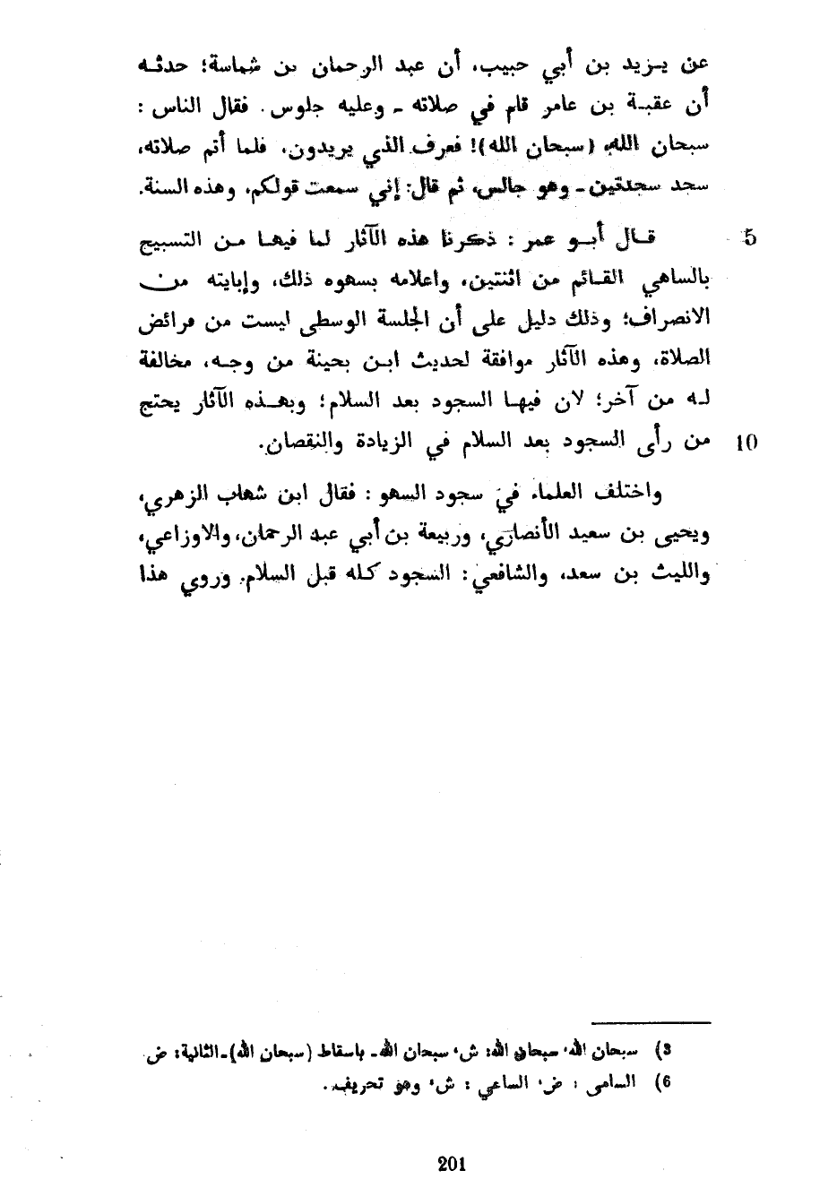 عَنْ يَزِيدَ بْنِ أَبِي حَبِيبٍ أَنَّ عَبْدَ الرحمان بْنَ شَمَاسَةَ حَدَّثَهُ أَنَّ عُقْبَةَ بْنَ عَامِرٍ قَامَ فِي صَلَاتِهِ وَعَلَيْهِ جُلُوسٌ فَقَالَ النَّاسُ سُبْحَانَ اللَّهِ (سُبْحَانَ اللَّهِ) فَعَرَفَ الَّذِي يُرِيدُونَ فَلَمَّا أَتَمَّ صَلَاتَهُ سَجَدَ سَجْدَتَيْنِ وَهُوَ جَالِسٌ ثُمَّ قَالَ إِنِّي سَمِعْتُ قَوْلَكُمْ وَهَذِهِ السُّنَّةُ قَالَ أَبُو عُمَرَ ذَكَرْنَا هَذِهِ الْآثَارَ لِمَا فِيهَا مِنَ التَّسْبِيحِ بِالسَّاهِي الْقَائِمِ مِنِ اثْنَتَيْنِ وَإِعْلَامِهِ بِسَهْوِهِ ذَلِكَ وَإِبَايَتِهِ مِنَ الِانْصِرَافِ وَذَلِكَ دَلِيلٌ عَلَى أَنَّ الْجَلْسَةَ الْوُسْطَى لَيْسَتْ مِنْ فَرَائِضِ الصَّلَاةِ وَهَذِهِ الْآثَارُ مُوَافِقَةٌ لِحَدِيثِ ابْنِ بُحَيْنَةَ مِنْ وَجْهٍ مُخَالِفَةٌ لَهُ مِنْ آخَرَ لِأَنَّ فِيهَا السُّجُودَ بَعْدَ السَّلَامِ وَبِهَذِهِ الْآثَارِ يَحْتَجُّ مَنْ رَأَى السُّجُودَ بَعْدَ السَّلَامِ فِي الزِّيَادَةِ وَالنُّقْصَانِ وَاخْتَلَفَ الْعُلَمَاءُ فِي سُجُودِ السَّهْوِ فقال ابن شهاب للزهري وَيَحْيَى بْنُ سَعِيدٍ الْأَنْصَارِيُّ وَرَبِيعَةُ بْنُ أَبِي عبد الرحمان وَالْأَوْزَاعِيُّ وَاللَّيْثُ بْنُ سَعْدٍ وَالشَّافِعِيُّ السُّجُودُ كُلُّهُ قَبْلَ السَّلَامِ وَرُوِيَ هَذَا