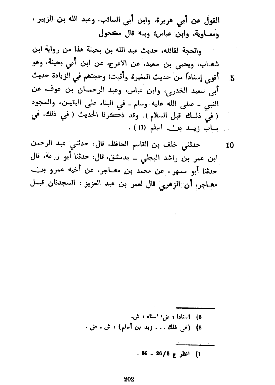 الْقَوْلُ عَنْ أَبِي هُرَيْرَةَ وَابْنِ أَبِي السَّائِبِ وَعَبْدِ اللَّهِ بْنِ الزُّبَيْرِ وَمُعَاوِيَةَ وَابْنِ عَبَّاسٍ وَبِهِ قَالَ مَكْحُولٌ وَالْحُجَّةُ لِقَائِلِهِ حَدِيثُ عَبْدِ اللَّهِ بْنِ بُحَيْنَةَ هَذَا مِنْ رِوَايَةِ ابْنِ شِهَابٍ وَيَحْيَى بْنِ سَعِيدٍ عَنِ الْأَعْرَجِ عَنِ ابْنِ أَبِي بُحَيْنَةَ وَهُوَ أَقْوَى إِسْنَادًا مِنْ حَدِيثِ الْمُغِيرَةِ وَأَثْبَتُ وَحُجَّتُهُمْ فِي الزِّيَادَةِ حَدِيثُ أبي سعيد الخدري وابن عباس وعبد الرحمان بْنِ عَوْفٍ عَنِ النَّبِيِّ صَلَّى اللَّهُ عَلَيْهِ وَسَلَّمَ فِي الْبِنَاءِ عَلَى الْيَقِينِ وَالسُّجُودِ (فِي ذَلِكَ قَبْلَ السَّلَامِ) وَقَدْ ذَكَرْنَا الْحَدِيثَ (فِي ذَلِكَ فِي بَابِ زَيْدِ بْنِ أَسْلَمَ (1)) حَدَّثَنِي خَلَفُ بْنُ الْقَاسِمِ الْحَافِظُ قَالَ حَدَّثَنِي عَبْدُ الرَّحْمَنِ بْنُ عُمَرَ بْنِ رَاشِدٍ الْبَجَلِيُّ بِدِمَشْقَ قَالَ حَدَّثَنَا أَبُو زُرْعَةَ قَالَ حَدَّثَنَا أَبُو مُسْهِرٍ عَنْ مُحَمَّدِ بْنِ مُهَاجِرٍ عَنْ أَخِيهِ عَمْرِو بْنِ مُهَاجِرٍ أَنَّ الزُّهْرِيَّ قَالَ لِعُمَرَ بْنِ عَبْدِ الْعَزِيزِ السَّجْدَتَانِ قَبْلَ
