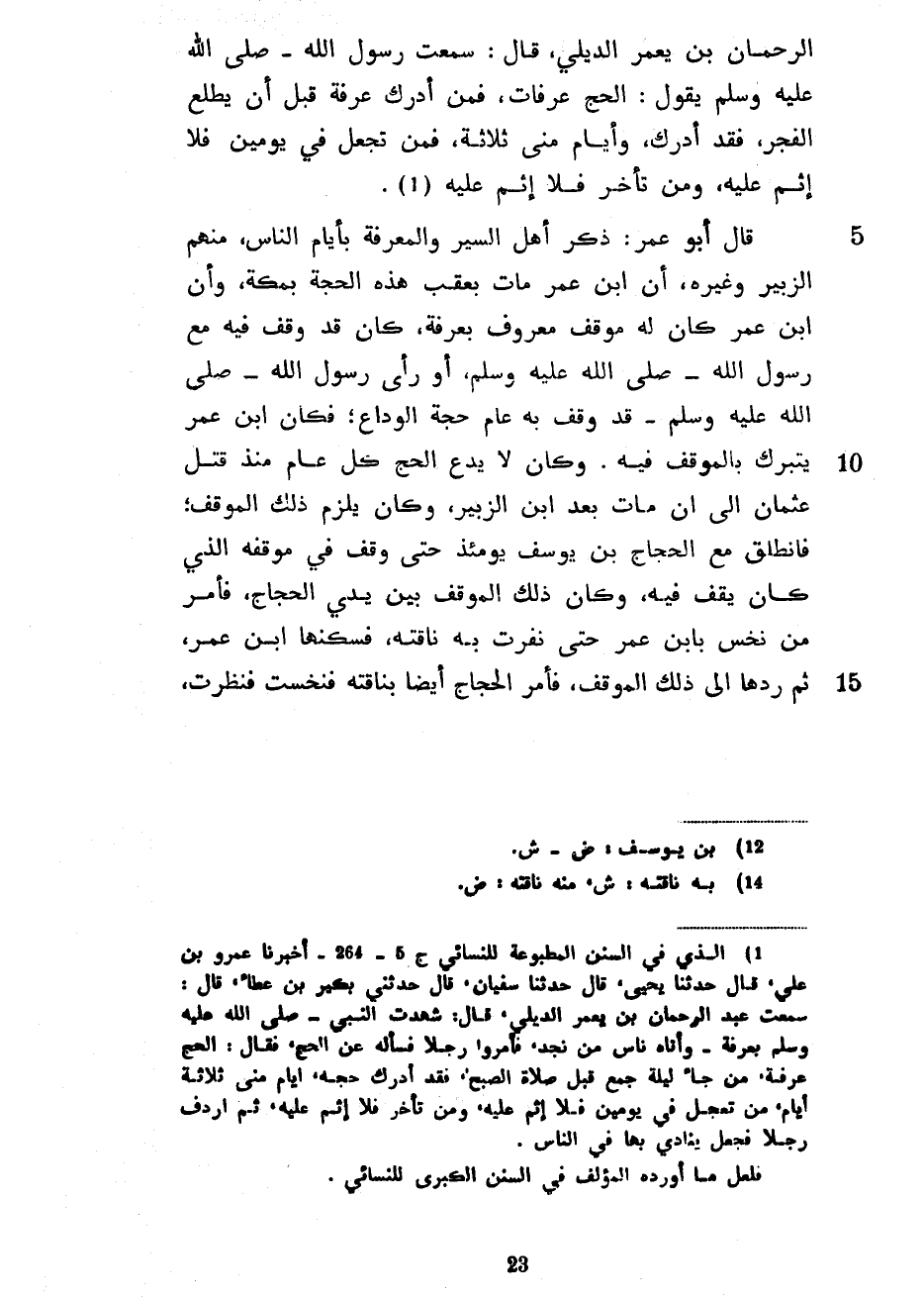 الرحمان بْنِ يَعْمُرَ الدَّيْلِيِّ قَالَ سَمِعْتُ رَسُولَ اللَّهِ صَلَّى اللَّهُ عَلَيْهِ وَسَلَّمَ يَقُولُ الْحَجُّ عَرَفَاتٌ فَمَنْ أَدْرَكَ عَرَفَةَ قَبْلَ أَنْ يَطْلُعَ الْفَجْرُ فقد أَدْرَكَ وَأَيَّامُ مِنًى ثَلَاثَةٌ فَمَنْ تَعَجَّلَ فِي يَوْمَيْنِ فَلَا إِثْمَ عَلَيْهِ وَمَنْ تَأَخَّرَ فَلَا إِثْمَ عَلَيْهِ قَالَ أَبُو عُمَرَ ذَكَرَ أَهْلُ السِّيَرِ وَالْمَعْرِفَةِ بِأَيَّامِ النَّاسِ مِنْهُمُ الزُّبَيْرُ وَغَيْرُهُ أَنَّ ابْنَ عُمَرَ مَاتَ بِعَقِبِ هَذِهِ الْحَجَّةِ بِمَكَّةَ وَأَنَّ ابْنَ عُمَرَ كَانَ لَهُ مَوْقِفٌ مَعْرُوفٌ بِعَرَفَةَ كَانَ قَدْ وَقَفَ فِيهِ مَعَ رَسُولِ اللَّهِ صَلَّى اللَّهُ عَلَيْهِ وَسَلَّمَ أو رَأَى رَسُولَ اللَّهِ صَلَّى اللَّهُ عَلَيْهِ وَسَلَّمَ قَدْ وَقَفَ بِهِ عَامَ حَجَّةِ الْوَدَاعِ فَكَانَ ابْنُ عُمَرَ يَتَبَرَّكُ بِالْمَوْقِفِ فِيهِ وَكَانَ لَا يَدْعُ الْحَجَّ كُلَّ عَامٍ مُنْذُ قَتْلِ عُثْمَانَ إِلَى أَنْ مَاتَ بَعْدَ ابْنِ الزُّبَيْرِ وَكَانَ يَلْزَمُ ذَلِكَ الْمَوْقِفَ فَانْطَلَقَ مَعَ الْحَجَّاجِ بْنِ يُوسُفَ يَوْمَئِذٍ حَتَّى وَقَفَ فِي مَوْقِفِهِ الَّذِي كَانَ يَقِفُ فِيهِ وَكَانَ ذَلِكَ الْمَوْقِفُ بَيْنَ يَدِي الْحَجَّاجِ فَأَمَرَ مَنْ نَخَسَ بِابْنِ عُمَرَ حَتَّى نَفَرَتْ بِهِ نَاقَتُهُ فَسَكَّنَهَا ابْنُ عُمَرَ ثُمَّ رَدَّهَا إِلَى ذَلِكَ الْمَوْقِفِ فَأَمَرَ الْحَجَّاجُ أَيْضًا بِنَاقَتِهِ فَنُخِسَتْ فَنَظَرَتْ