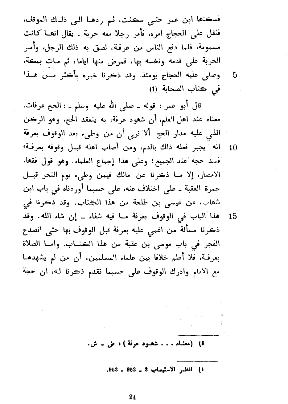 فَسَكَّنَهَا ابْنُ عُمَرَ حَتَّى سَكَنَتْ ثُمَّ رَدَّهَا إِلَى ذَلِكَ الْمَوْقِفِ فَثَقُلَ عَلَى الْحَجَّاجِ أَمْرُهُ فَأَمَرَ رَجُلًا مَعَهُ حَرْبَةً يُقَالُ أَنَّهَا كَانَتْ مَسْمُومَةً فَلَمَّا دَفَعَ النَّاسُ مِنْ عَرَفَةَ لَصِقَ بِهِ ذَلِكَ الرَّجُلُ وَأَمَرَ الْحَرْبَةَ عَلَى قَدَمِهِ وَنَخَسَهُ بِهَا فَمَرِضَ مِنْهَا أَيَّامًا ثُمَّ مَاتَ بِمَكَّةَ وَصَلَّى عَلَيْهِ الْحَجَّاجُ يَوْمَئِذٍ وَقَدْ ذَكَرْنَا خَبَرَهُ بِأَكْثَرِ مِنْ هَذَا فِي كِتَابِ الصَّحَابَةِ قَالَ أَبُو عُمَرَ قَوْلُهُ صَلَّى اللَّهُ عَلَيْهِ وَسَلَّمَ الْحَجُّ عَرَفَاتٌ مَعْنَاهُ عِنْدَ أَهْلِ الْعِلْمِ أَنَّ شُهُودَ عَرَفَةَ بِهِ يَنْعَقِدُ الْحَجُّ وَهُوَ الرُّكْنُ الَّذِي عَلَيْهِ مَدَارُ الْحَجِّ أَلَا تَرَى أَنَّ مَنْ وَطِئَ بَعْدَ الْوُقُوفِ بِعَرَفَةَ أَنَّهُ يَجْبُرُ فِعْلَهُ ذَلِكَ بِالدَّمِ وَمَنْ أَصَابَ أَهْلَهُ قَبْلَ وُقُوفِهِ بِعَرَفَةَ فَسَدَ حَجُّهُ عِنْدَ الْجَمِيعِ وَعَلَى هَذَا إِجْمَاعُ الْعُلَمَاءِ وَهُوَ قَوْلُ فُقَهَاءِ الْأَمْصَارِ إِلَّا مَا ذَكَرْنَا عَنْ مَالِكٍ فِيمَنْ وَطِئَ يَوْمَ النَّحْرِ قَبْلَ جَمْرَةِ الْعَقَبَةِ عَلَى اختلاف عنه على حسبما أَوْرَدْنَاهُ فِي بَابِ ابْنِ شِهَابٍ عَنْ عِيسَى بْنِ طَلْحَةَ مِنْ هَذَا الْكِتَابِ وَقَدْ ذَكَرْنَا فِي هَذَا الْبَابِ فِي الْوُقُوفِ بِعَرَفَةَ مَا فِيهِ شِفَاءٌ إِنْ شَاءَ اللَّهُ وَقَدْ ذَكَرْنَا مَسْأَلَةَ مَنْ أُغْمِيَ عَلَيْهِ بِعَرَفَةَ قَبْلَ الْوُقُوفِ بِهَا حَتَّى انْصَدَعَ الْفَجْرُ فِي بَابِ مُوسَى بْنِ عُقْبَةَ مِنْ هَذَا الْكِتَابِ وَأَمَّا الصَّلَاةُ بِعَرَفَةَ فَلَا أَعْلَمُ خِلَافًا بَيْنَ عُلَمَاءِ الْمُسْلِمِينَ أَنَّ مَنْ لَمْ يَشْهَدْهَا مَعَ الْإِمَامِ وَأَدْرَكَ الوقوف على حسبما تَقَدَّمَ ذِكْرُنَا لَهُ أَنَّ حَجَّهُ