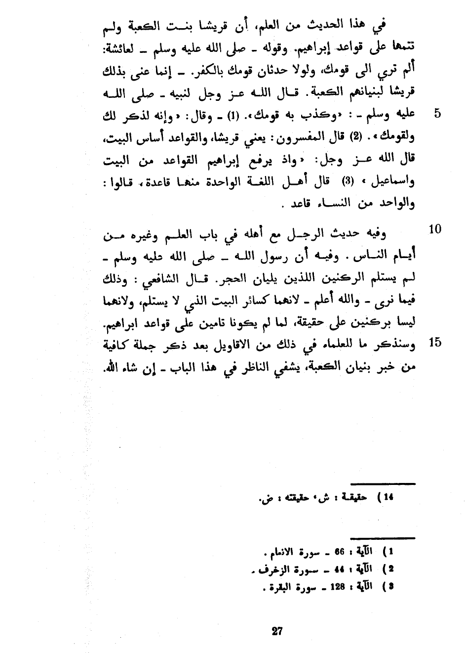 فِي هَذَا الْحَدِيثِ مِنَ الْعِلْمِ أَنَّ قُرَيْشًا بَنَتِ الْكَعْبَةَ وَلَمْ تُتِمَّهَا عَلَى قَوَاعِدِ إِبْرَاهِيمَ وَقَوْلُهُ صَلَّى اللَّهُ عَلَيْهِ وَسَلَّمَ لِعَائِشَةَ أَلَمْ تَرَيْ إِلَى قَوْمِكِ وَلَوْلَا حِدْثَانُ قَوْمِكِ بِالْكُفْرِ إِنَّمَا عَنَى بِذَلِكَ قُرَيْشًا لِبُنْيَانِهِمُ الْكَعْبَةَ قَالَ اللَّهُ عَزَّ وَجَلَّ لِنَبِيِّهِ صَلَّى اللَّهُ عَلَيْهِ وَسَلَّمَ وَكَذَّبَ بِهِ قَوْمُكَ وَقَالَ وَإِنَّهُ لَذِكْرٌ لَكَ وَلِقَوْمِكَ قَالَ الْمُفَسِّرُونَ يَعْنِي قُرَيْشًا وَالْقَوَاعِدُ أَسَاسُ الْبَيْتِ قَالَ اللَّهُ عَزَّ وَجَلَّ وَإِذْ يَرْفَعُ إِبْرَاهِيمُ الْقَوَاعِدَ مِنَ الْبَيْتِ وَإِسْمَاعِيلُ قَالَ أَهْلُ اللُّغَةِ الْوَاحِدَةُ مِنْهَا قَاعِدَةٌ قَالُوا وَالْوَاحِدُ مِنَ النِّسَاءِ قَاعِدٌ وَفِيهِ حَدِيثُ الرَّجُلِ مَعَ أَهْلِهِ فِي بَابِ الْعِلْمِ وَغَيْرِهِ مِنْ أَيَّامِ النَّاسِ وَفِيهِ أَنَّ رَسُولَ اللَّهِ صَلَّى اللَّهُ عَلَيْهِ وَسَلَّمَ لَمْ يَسْتَلِمِ الرُّكْنَيْنِ اللَّذَيْنِ يَلِيَانِ الْحِجْرَ قَالَ الشَّافِعِيُّ وَذَلِكَ فِيمَا نَرَى وَاللَّهُ أَعْلَمُ لِأَنَّهُمَا كَسَائِرِ الْبَيْتِ الَّذِي لَا يُسْتَلَمُ وَلِأَنَّهُمَا لَيْسَا بِرُكْنَيْنِ عَلَى حَقِيقَةٍ لِمَا لَمْ يَكُونَا تَامَّيْنِ عَلَى قَوَاعِدِ إِبْرَاهِيمَ وَسَنَذْكُرُ مَا لِلْعُلَمَاءِ فِي ذَلِكَ مِنَ الْأَقَاوِيلِ بَعْدَ ذِكْرِ جُمْلَةٍ كَافِيَةٍ مِنْ خَبَرِ بُنْيَانِ الْكَعْبَةِ يَشْفِي النَّاظِرَ فِي هَذَا الْبَابِ إِنْ شَاءَ اللَّهُ