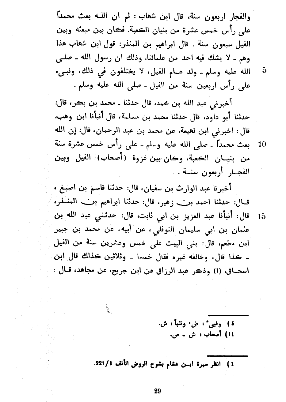 وَالْفِجَارِ أَرْبَعُونَ سَنَةً قَالَ ابْنُ شِهَابٍ ثُمَّ إِنَّ اللَّهَ بَعَثَ مُحَمَّدًا عَلَى رَأْسِ خَمْسَ عَشْرَةَ مِنْ بُنْيَانِ الْكَعْبَةِ فَكَانَ بَيْنَ مَبْعَثِهِ وَبَيْنَ الْفِيلِ سَبْعُونَ سَنَةً قَالَ إِبْرَاهِيمُ بْنُ الْمُنْذِرِ قَوْلُ ابْنِ شِهَابٍ هَذَا وَهْمٌ لَا يَشُكُّ فِيهِ أَحَدٌ مِنْ عُلَمَائِنَا وَذَلِكَ أَنَّ رَسُولَ اللَّهِ صَلَّى اللَّهُ عَلَيْهِ وَسَلَّمَ وُلِدَ عَامَ الْفِيلِ لَا يَخْتَلِفُونَ فِي ذَلِكَ وَنُبِّئَ عَلَى رَأْسِ أَرْبَعِينَ سَنَةً مِنَ الْفِيلِ صَلَّى اللَّهُ عَلَيْهِ وَسَلَّمَ أَخْبَرَنِي عَبْدُ اللَّهِ بْنُ مُحَمَّدٍ قَالَ حَدَّثَنَا مُحَمَّدُ بْنُ بَكْرٍ قَالَ حَدَّثَنَا أَبُو دَاوُدَ قَالَ حَدَّثَنَا مُحَمَّدُ بْنُ مَسْلَمَةَ قَالَ أَنْبَأَنَا ابْنُ وَهْبٍ قَالَ أَخْبَرَنِي ابْنُ لَهِيعَةَ عَنْ محمد بن عبد الرحمان قَالَ إِنَّ اللَّهَ بَعَثَ مُحَمَّدًا صَلَّى اللَّهُ عَلَيْهِ وَسَلَّمَ عَلَى رَأْسِ خَمْسَ عَشْرَةَ سَنَةً مِنْ بُنْيَانِ الْكَعْبَةِ وَكَانَ بَيْنَ غَزْوَةِ (أَصْحَابِ) الْفِيلِ وَبَيْنَ الْفِجَارِ أَرْبَعُونَ سَنَةً أَخْبَرَنَا عَبْدُ الْوَارِثِ بْنُ سُفْيَانَ قَالَ حَدَّثَنَا قَاسِمُ بْنُ أَصْبَغَ قَالَ حَدَّثَنَا أَحْمَدُ بْنُ زُهَيْرٍ قَالَ حَدَّثَنَا إِبْرَاهِيمُ بْنُ الْمُنْذِرِ قَالَ أَنْبَأَنَا عَبْدُ الْعَزِيزِ بْنُ أَبِي ثَابِتٍ قَالَ حَدَّثَنِي عَبْدُ اللَّهِ بْنُ عُثْمَانَ بْنِ أَبِي سُلَيْمَانَ النَّوْفَلِيُّ عَنْ أَبِيهِ عَنْ مُحَمَّدِ بْنِ جُبَيْرِ بْنِ مُطْعِمٍ قَالَ بُنِيَ الْبَيْتُ عَلَى خَمْسٍ وَعِشْرِينَ سَنَةً مِنَ الْفِيلِ كَذَا قَالَ وَخَالَفَهُ غَيْرُهُ فَقَالَ خَمْسًا وَثَلَاثِينَ كَذَلِكَ قَالَ ابْنُ إِسْحَاقَ وَذَكَرَ عَبْدُ الرَّزَّاقِ عَنِ ابْنِ جُرَيْجٍ عَنْ مجاهد قال
