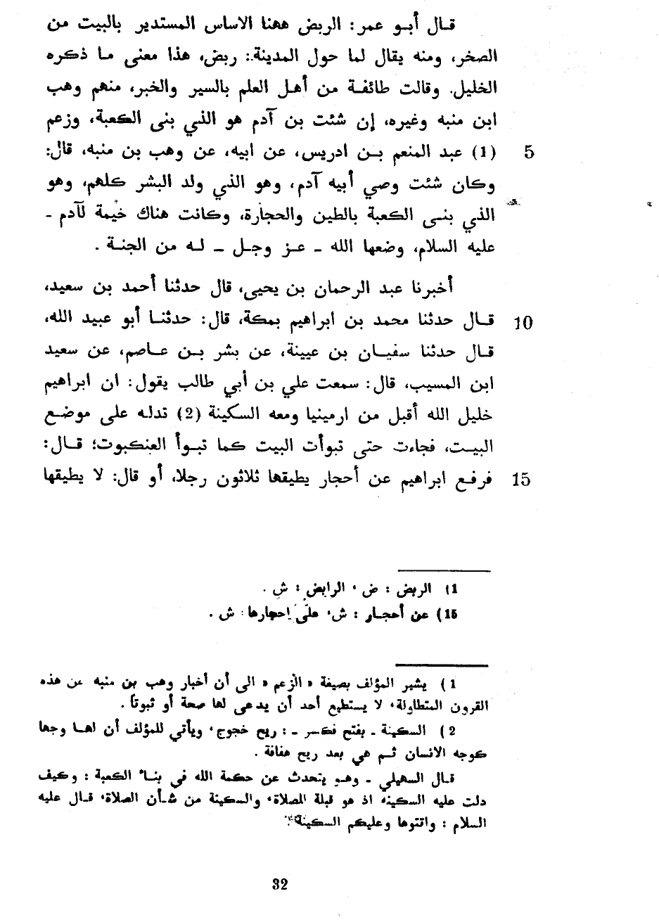 قال أبو عمر الربض ههنا الْأَسَاسُ الْمُسْتَدِيرُ بِالْبَيْتِ مِنَ الصَّخْرِ وَمِنْهُ يُقَالُ لِمَا حَوْلَ الْمَدِينَةِ رَبَضٌ هَذَا مَعْنَى مَا ذَكَرَهُ الْخَلِيلُ وَقَالَتْ طَائِفَةٌ مِنْ أَهْلِ الْعِلْمِ بِالسِّيَرِ وَالْخَبَرِ مِنْهُمْ وَهْبُ بْنُ مُنَبِّهٍ وَغَيْرُهُ إن شئت ابن آدَمَ هُوَ الَّذِي بَنَى الْكَعْبَةَ وَزَعَمَ عَبْدُ الْمُنْعِمِ بْنُ إِدْرِيسَ عَنْ أَبِيهِ عَنْ وَهْبِ بْنِ مُنَبِّهٍ قَالَ وَكَانَ شِئْتُ وَصِيَّ أَبِيهِ آدَمَ وَهُوَ الَّذِي وَلَدَ الْبَشَرَ كُلَّهُمْ وَهُوَ الَّذِي بَنَى الْكَعْبَةَ بِالطِّينِ وَالْحِجَارَةِ وَكَانَتْ هُنَاكَ خَيْمَةً لِآدَمَ عَلَيْهِ السَّلَامُ وَضَعَهَا اللَّهُ عَزَّ وجل0 له من الجنة أخبرنا عبد الرحمان بْنُ يَحْيَى قَالَ حَدَّثَنَا أَحْمَدُ بْنُ سَعِيدٍ قَالَ حَدَّثَنَا مُحَمَّدُ بْنُ إِبْرَاهِيمَ بِمَكَّةَ قَالَ حَدَّثَنَا أَبُو عُبَيْدِ اللَّهِ قَالَ حَدَّثَنَا سُفْيَانُ بْنُ عُيَيْنَةَ عَنْ بِشْرِ بْنِ عَاصِمٍ عَنْ سَعِيدِ بْنِ الْمُسَيَّبِ قَالَ سَمِعْتُ عَلِيَّ بْنَ أَبِي طَالِبٍ يَقُولُ إِنَّ إِبْرَاهِيمَ خَلِيلَ اللَّهِ أَقْبَلَ مِنْ أَرْمِينْيَا وَمَعَهُ السَّكِينَةُ تَدُلُّهُ عَلَى مَوْضِعِ الْبَيْتِ فَجَاءَتْ حَتَّى تَبَوَّأَتِ الْبَيْتَ كَمَا تَبَوَّأَ الْعَنْكَبُوتُ قَالَ فَرَفَعَ إِبْرَاهِيمُ عَنْ أَحْجَارٍ يُطِيقُهَا ثَلَاثُونَ رَجُلًا أَوْ قَالَ لَا يُطِيقُهَا